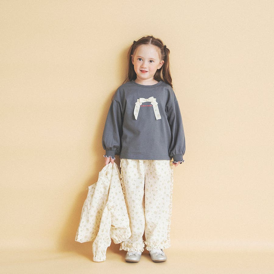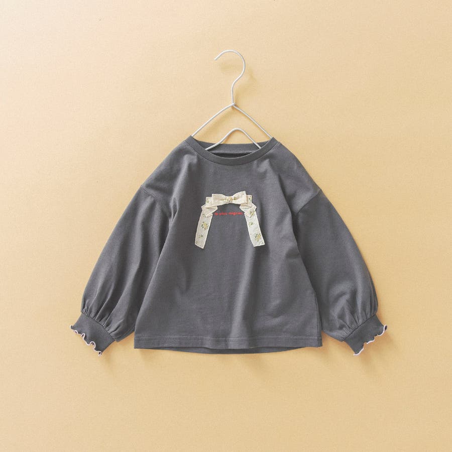立体的なリボンが目を引く長袖Tシャツは、ぽわんとしたお袖と袖口の配色メロウがポイント
