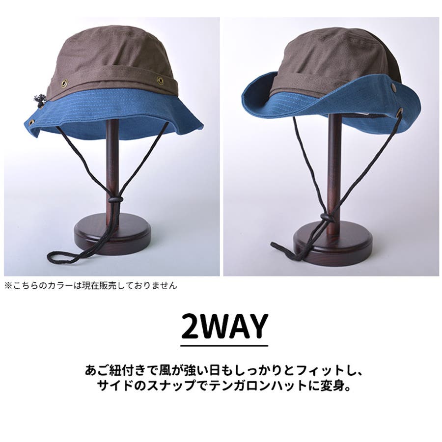 あご紐付きで風が強い日もしっかりとフィットし、サイドのスナップでテンガロンハットに変身。