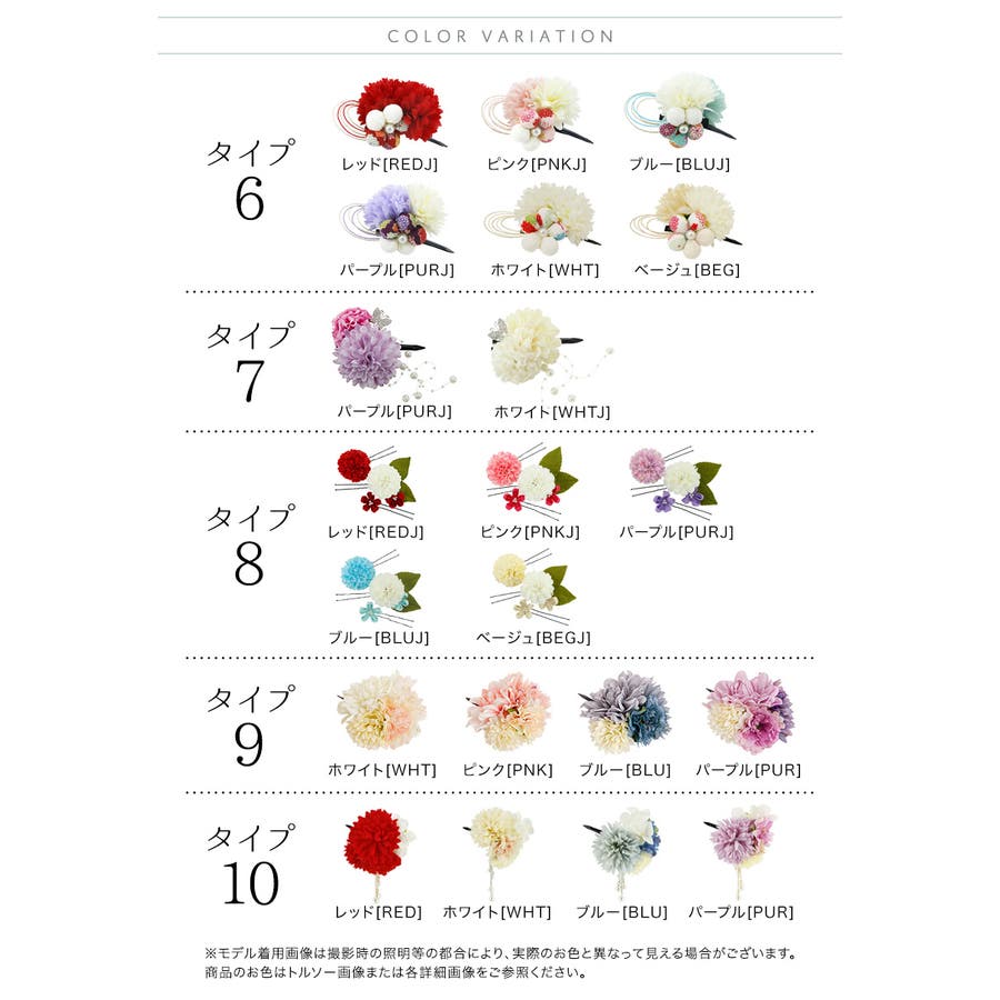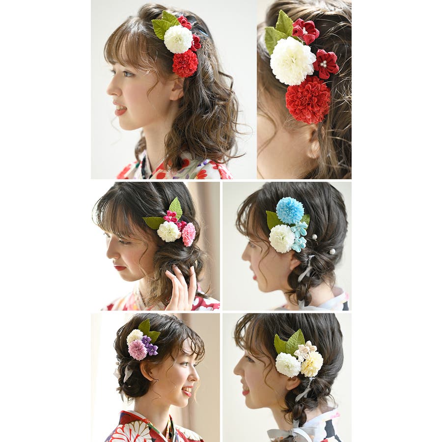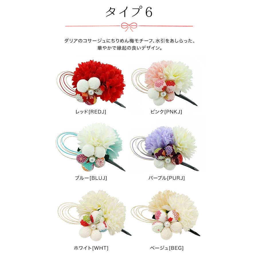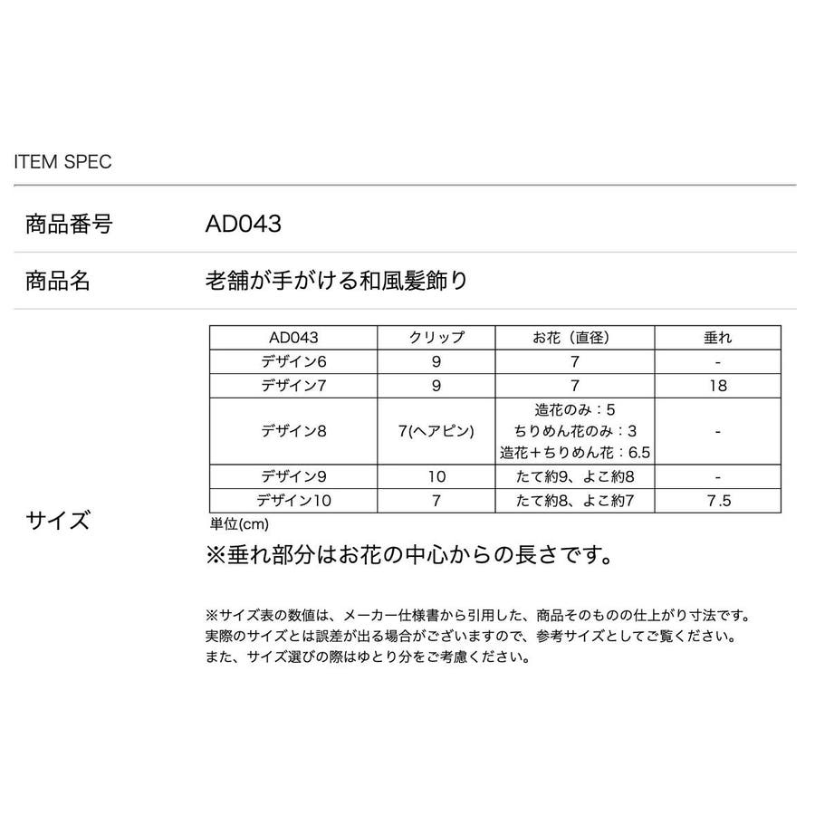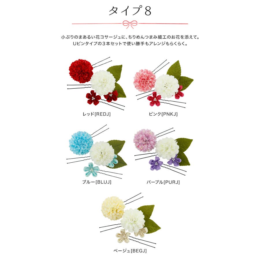 | デザイン8 | 7(ヘアピン) | 造花のみ:5 ちりめん花のみ:3 造花+ちりめん花:6.5 | - |