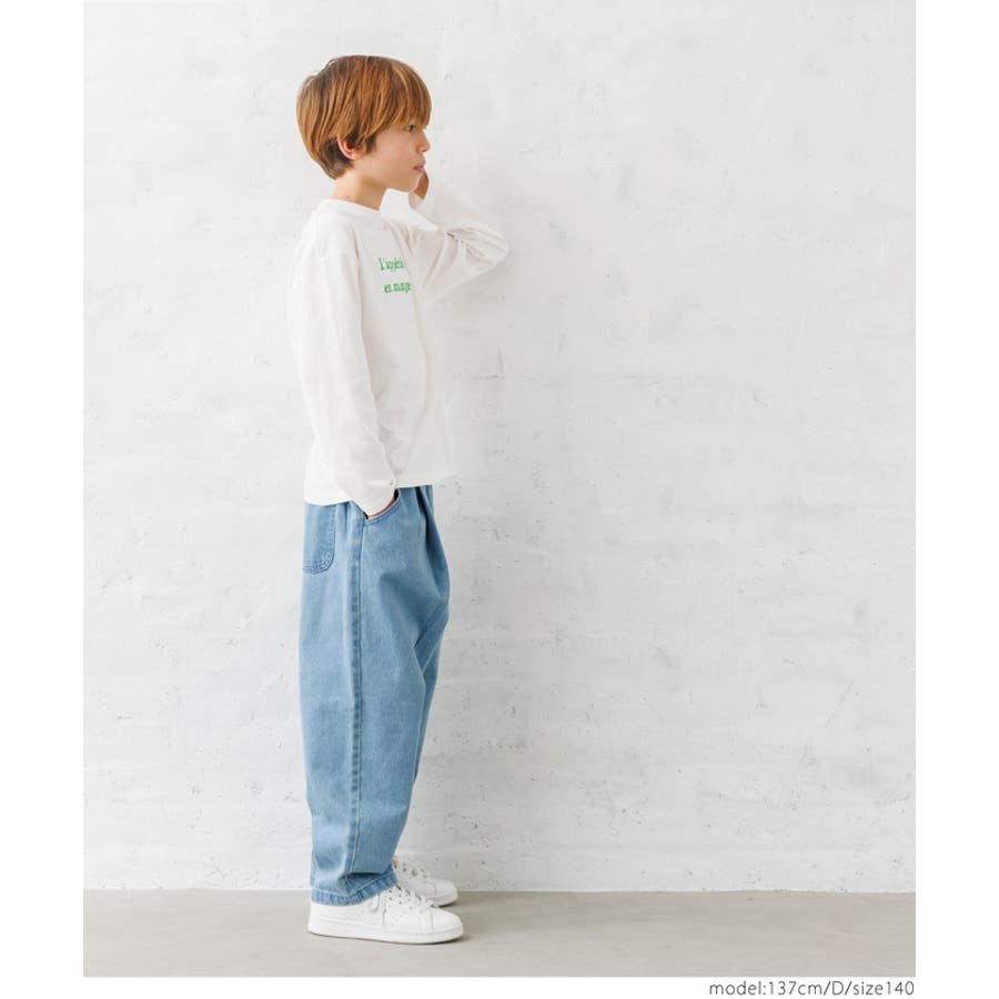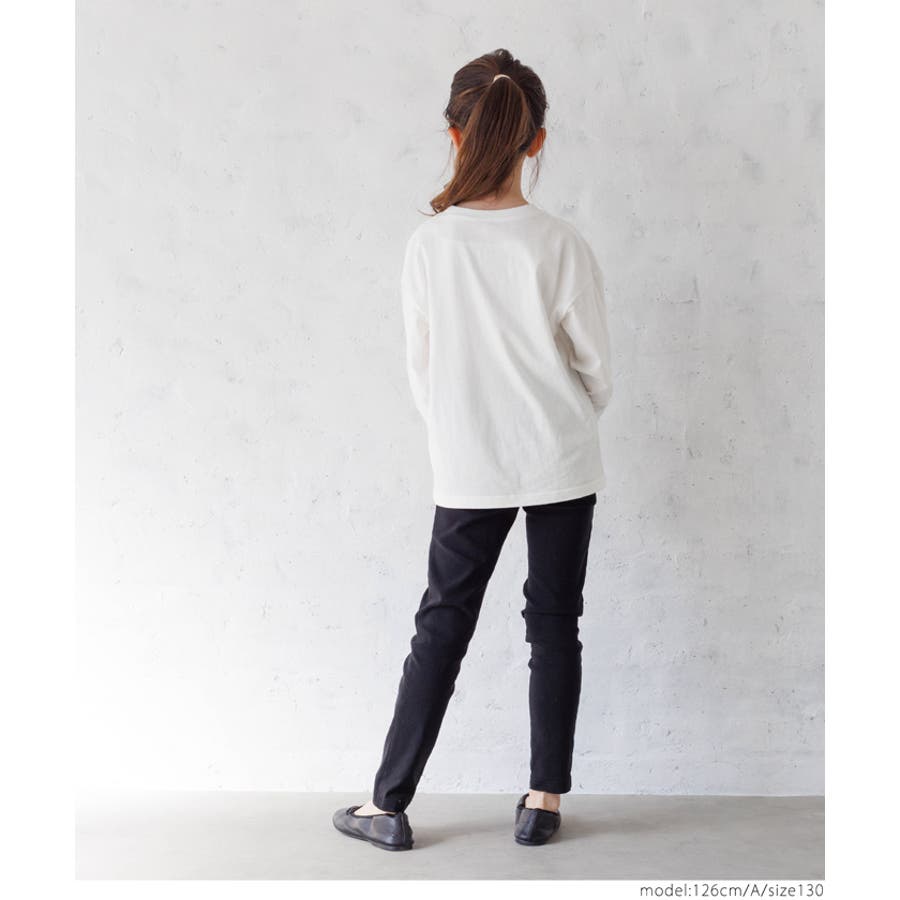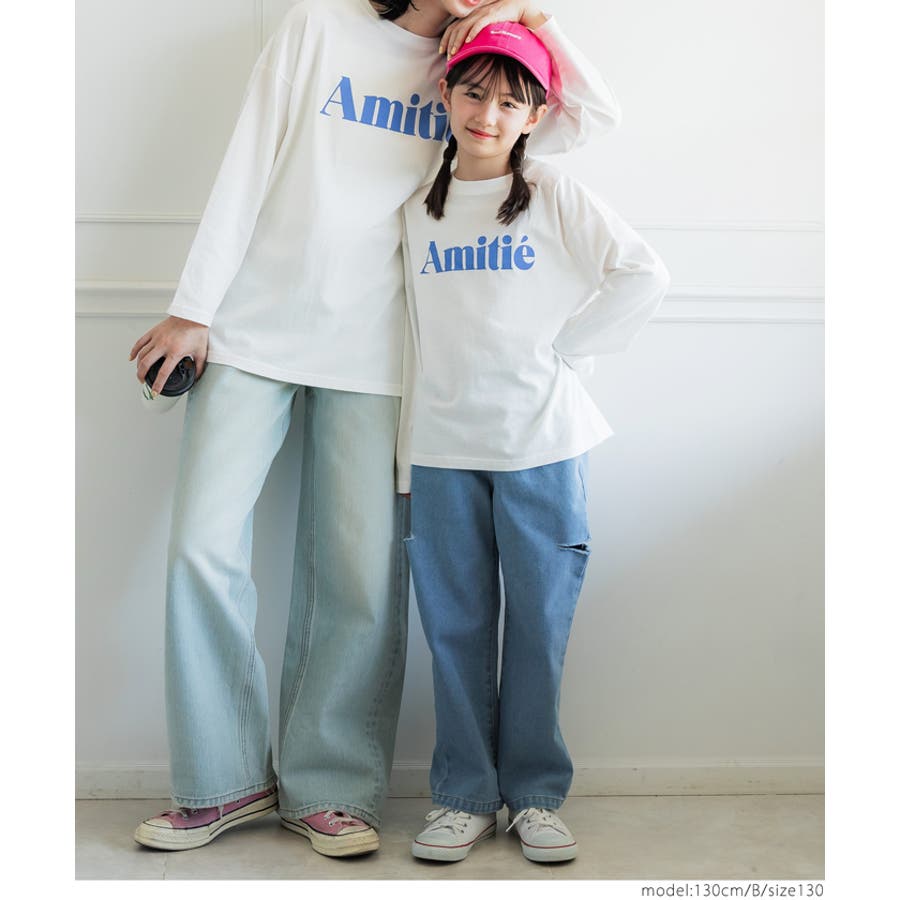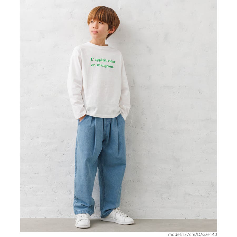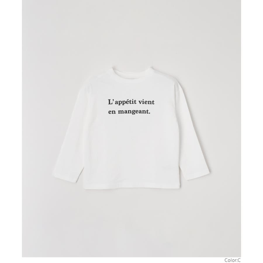 白地のロンTにカラーロゴがデニムとの相性抜群。