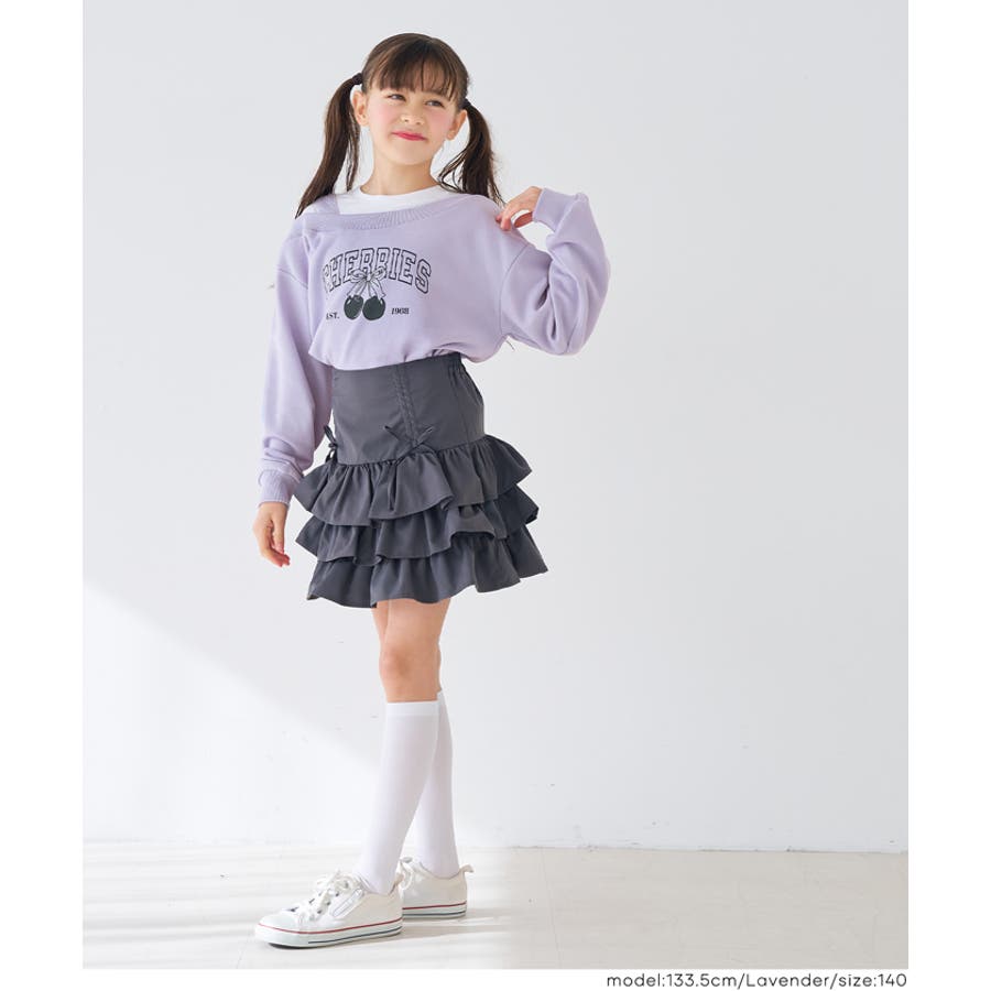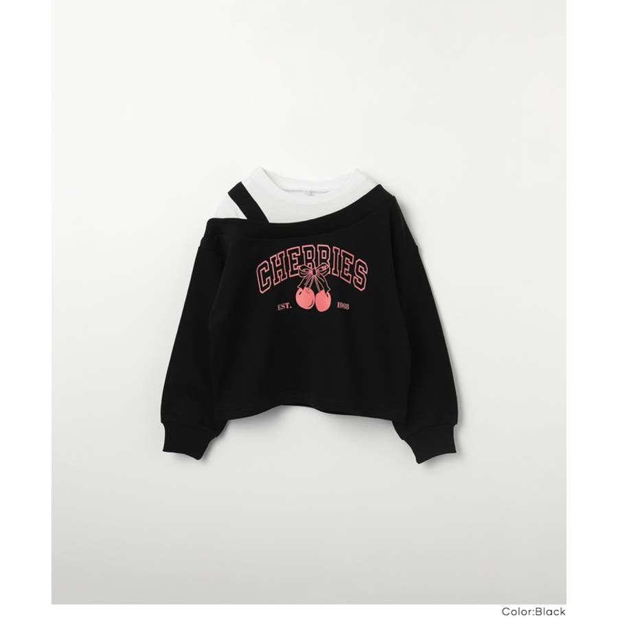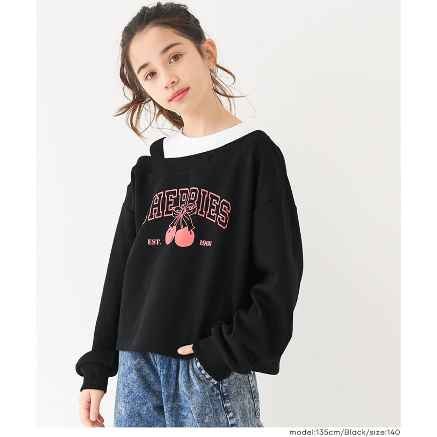 肩を落として着用するワンショルダーデザインがポイントの、キッズ用スウェットプルオーバー。