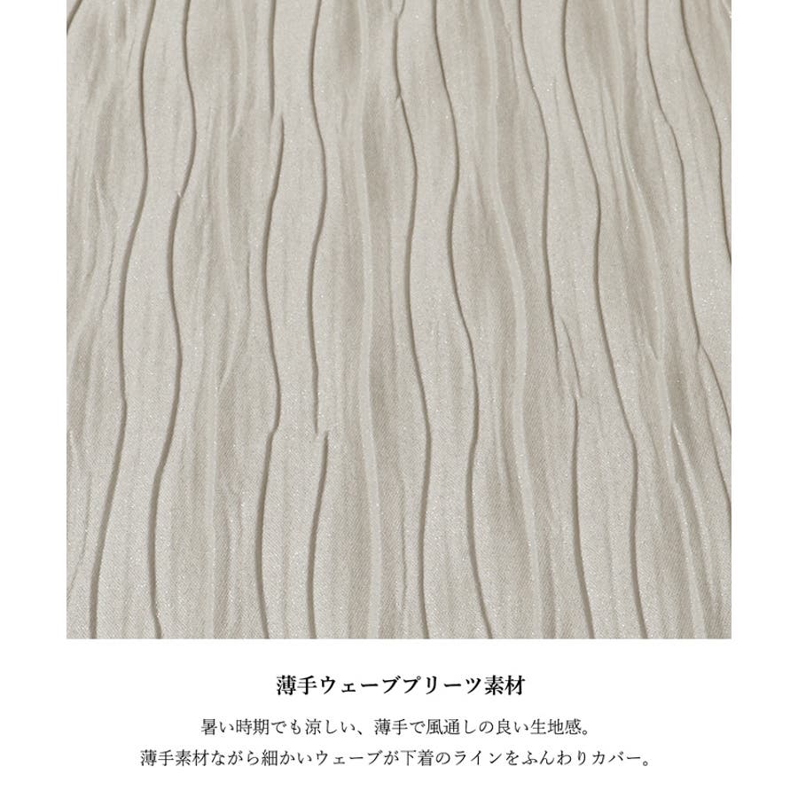 動くたびにきらめくシャイニー素材と、さざ波のようなウェーブプリーツが特徴的。