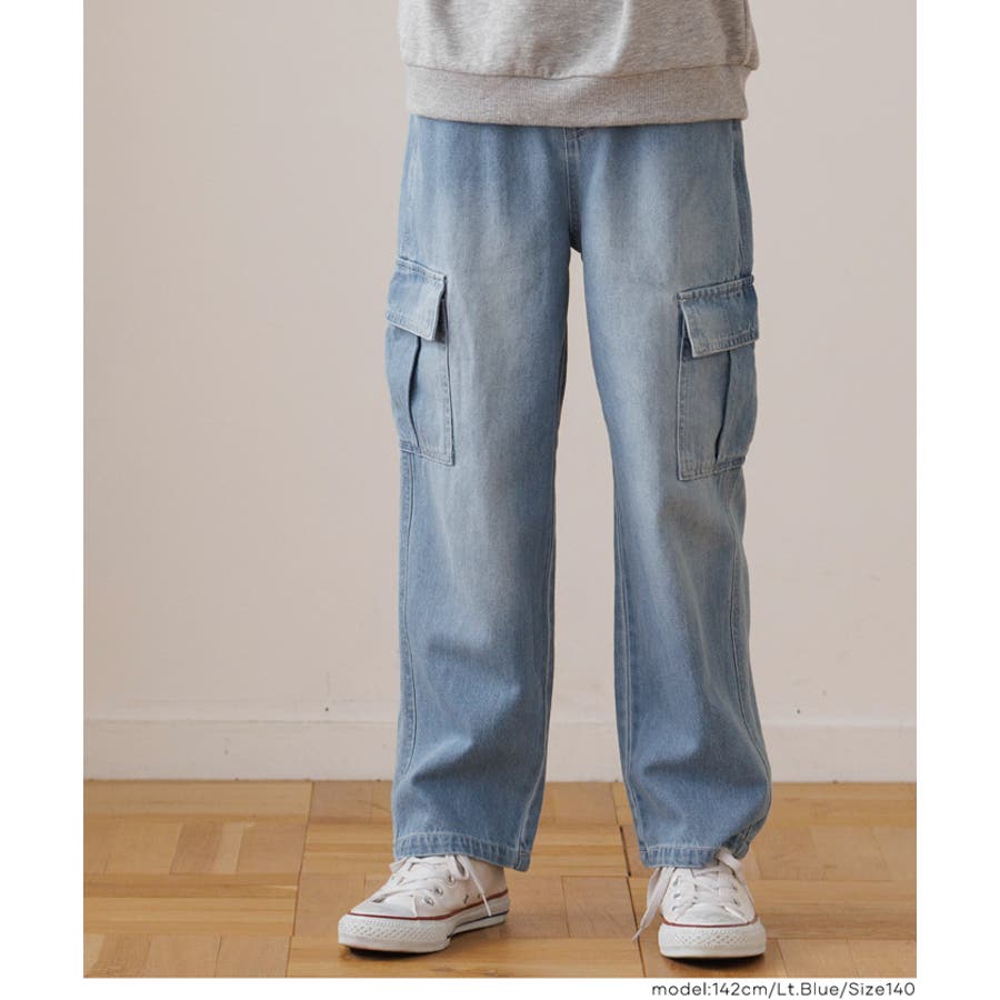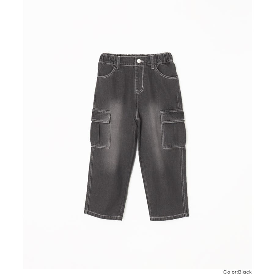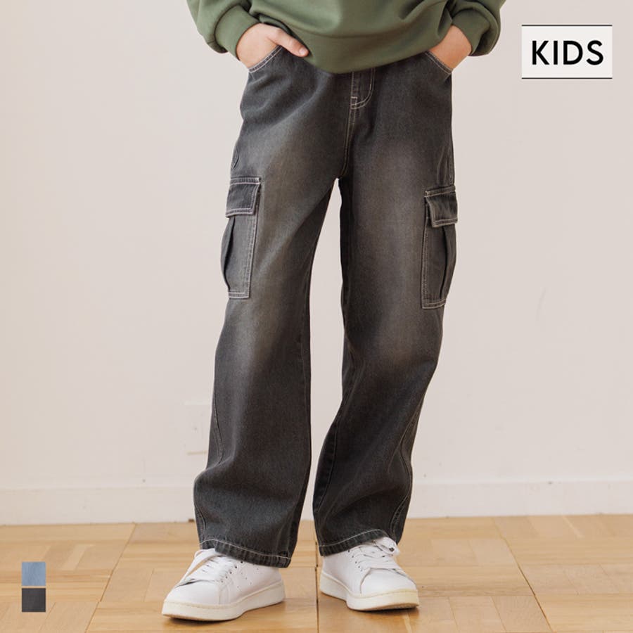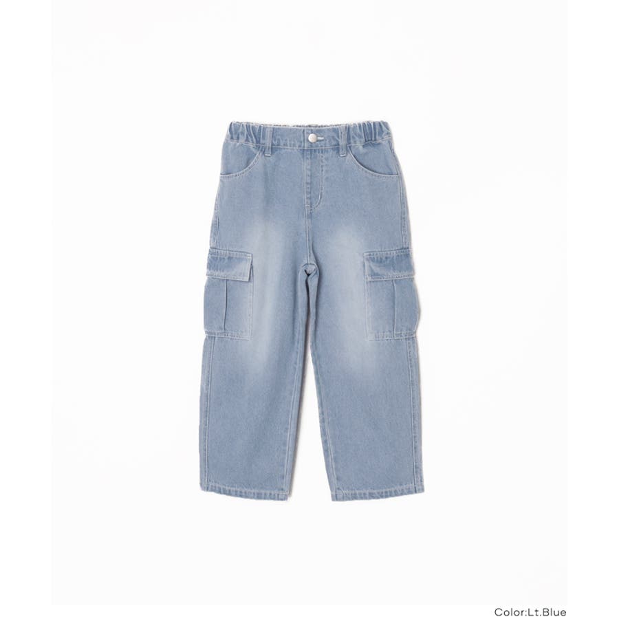 デニム素材にカーゴポケットをあしらった、キッズ用デニムカーゴパンツ。