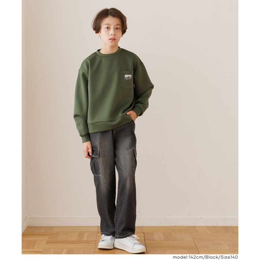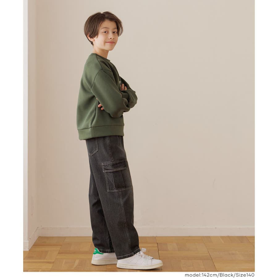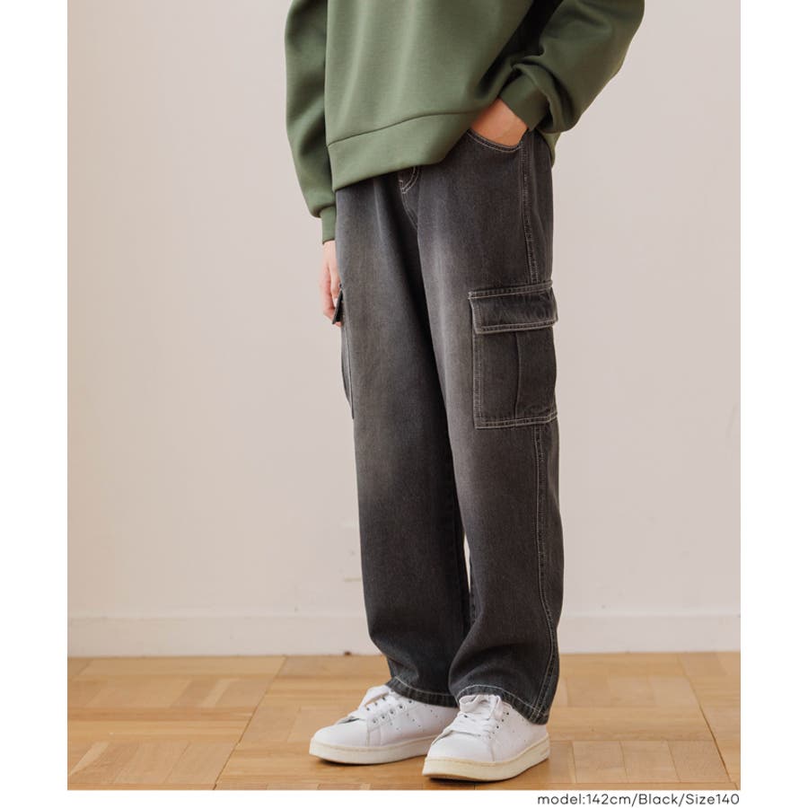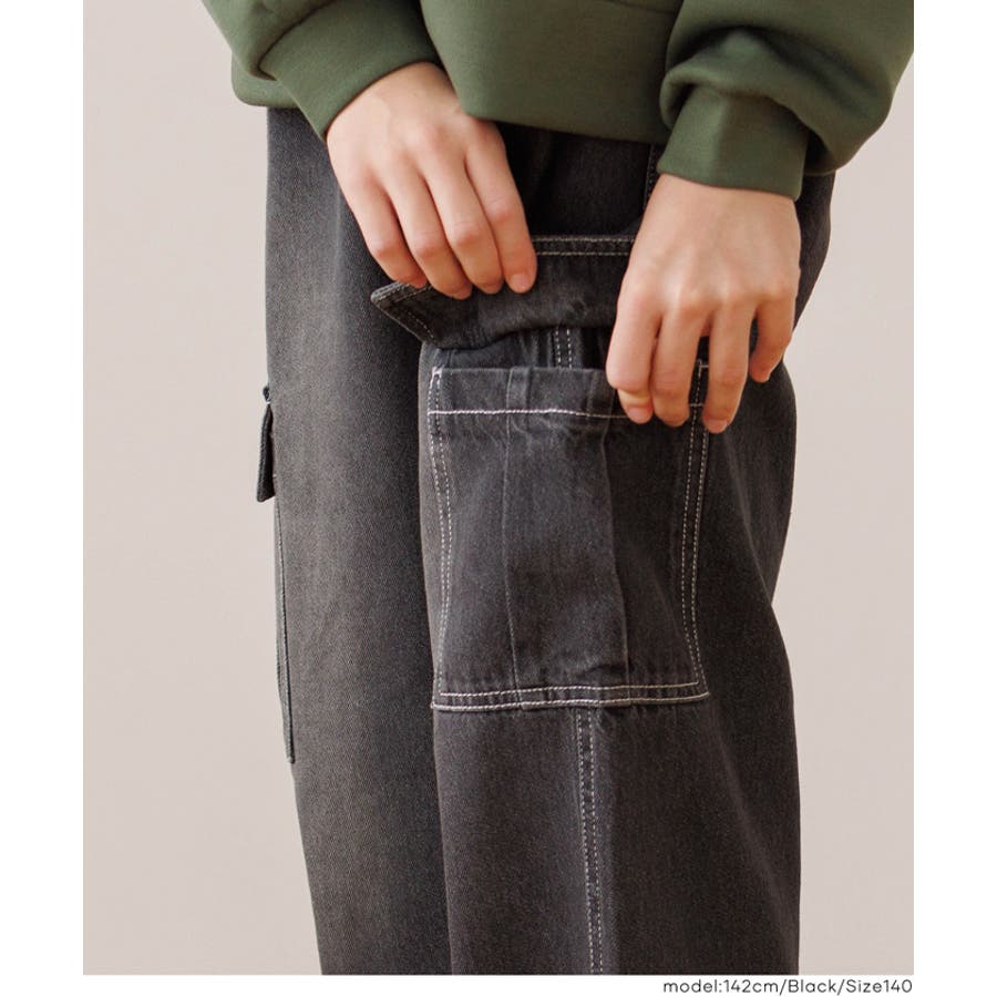 デニム素材にカーゴポケットをあしらった、キッズ用デニムカーゴパンツ。