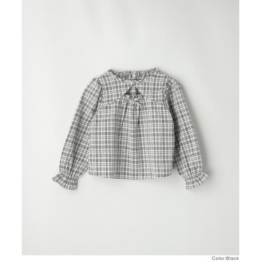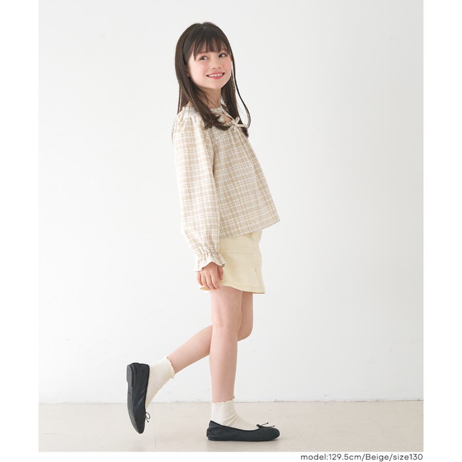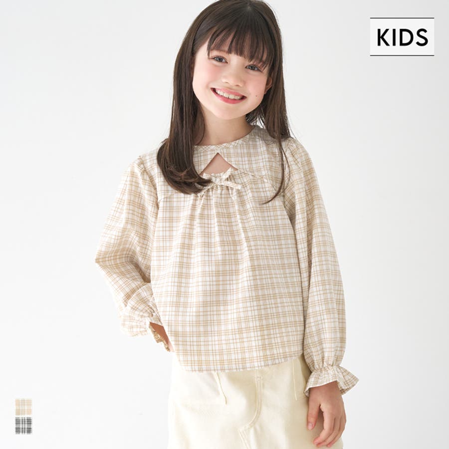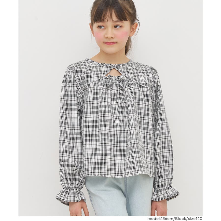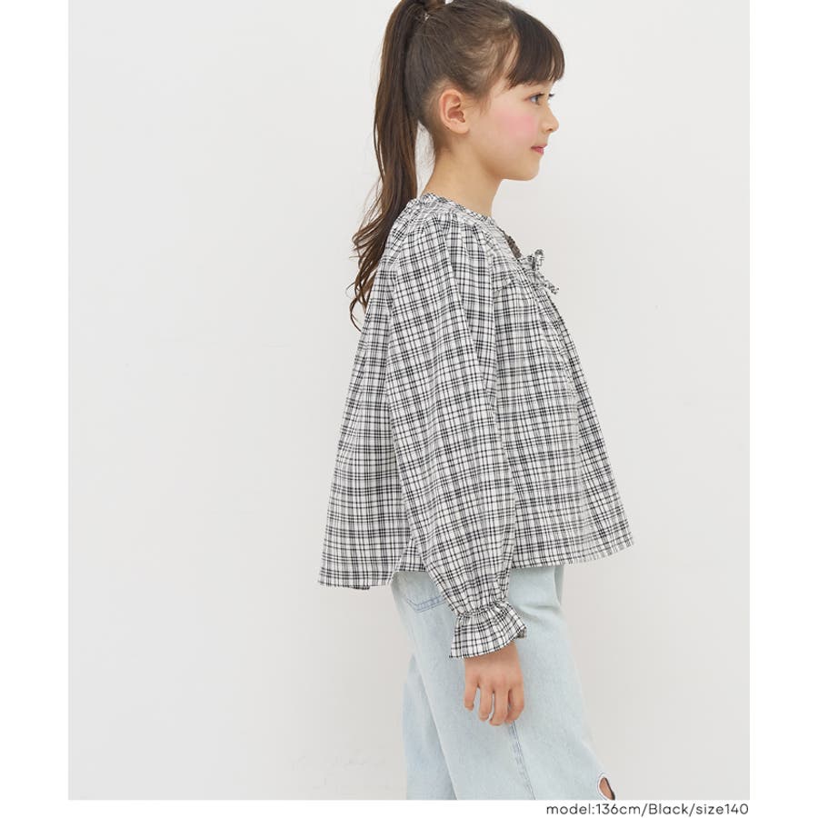 ジュニア チェック ブラウス トップス リボン トレンド フリル カジュアル 通園 通学 120 130 140 150 COCA