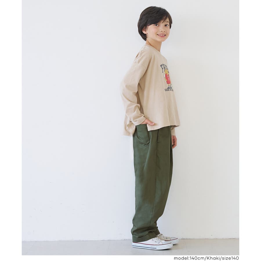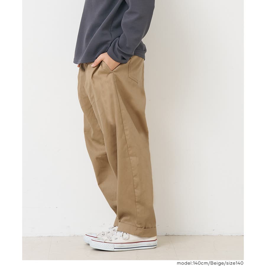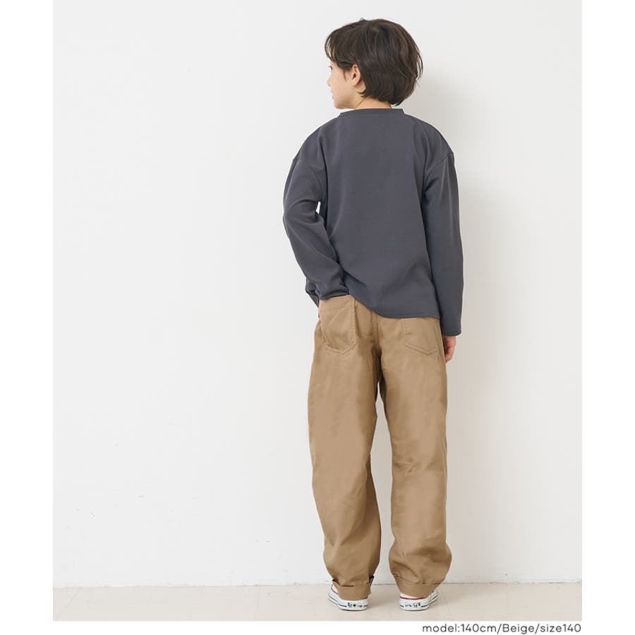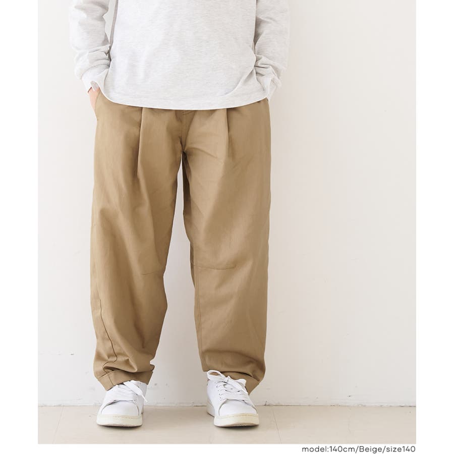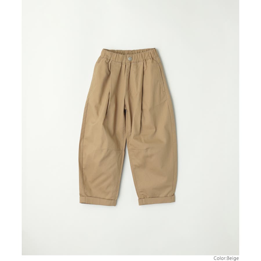 フロントに入ったタックと、ゆるやかなカーブラインが特徴のキッズ用パンツ。
