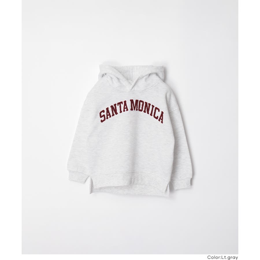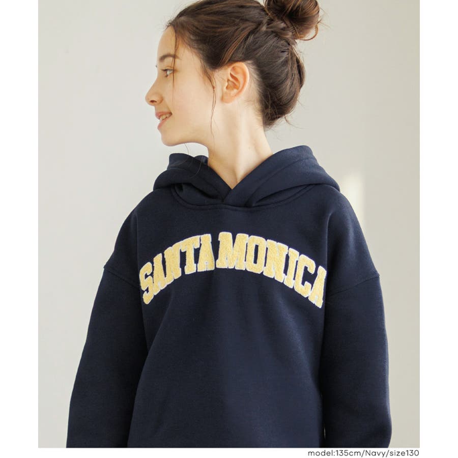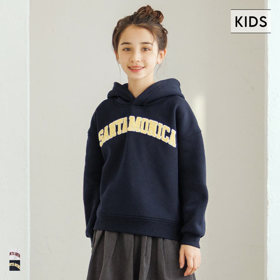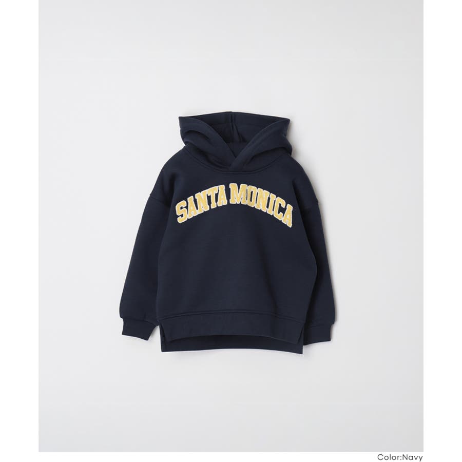 アイテム説明:カレッジ風刺繍ロゴが可愛い、親子リンクも楽しめるゆったりシルエットのキッズパーカー。