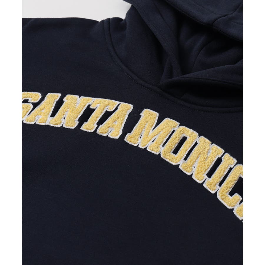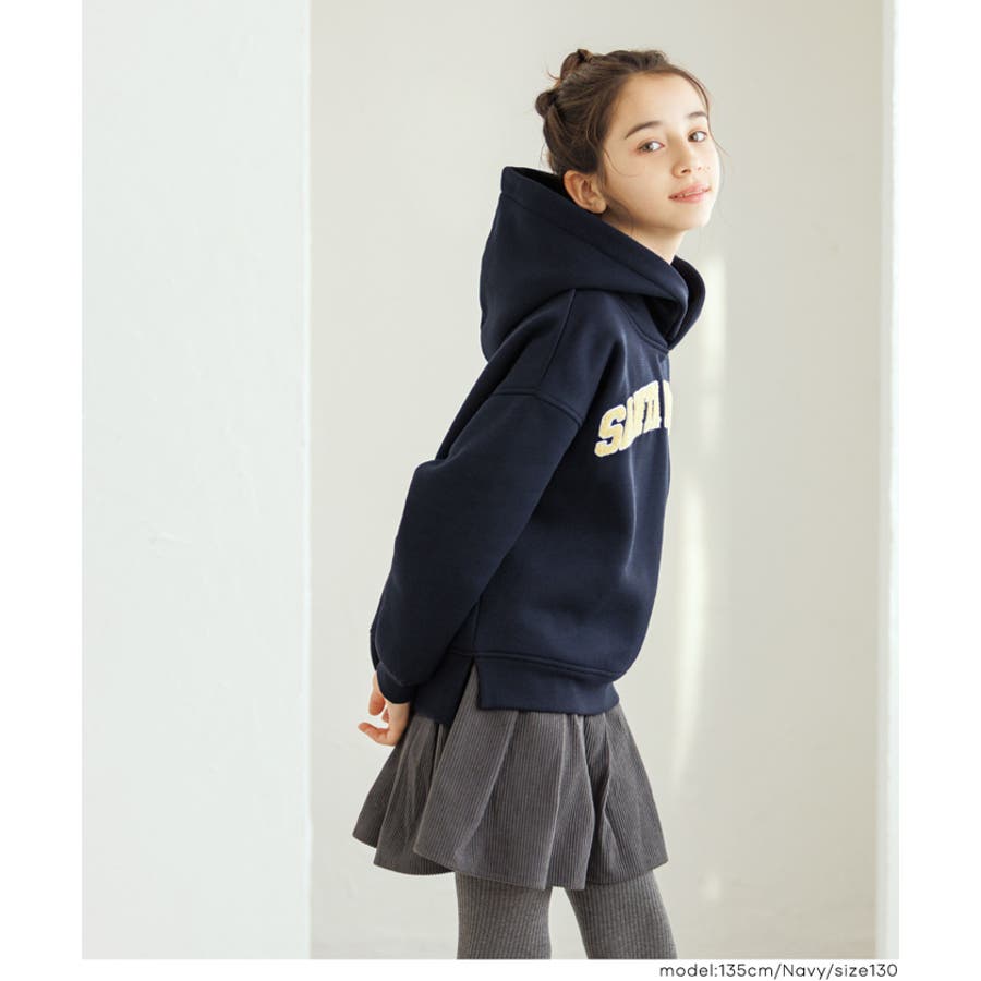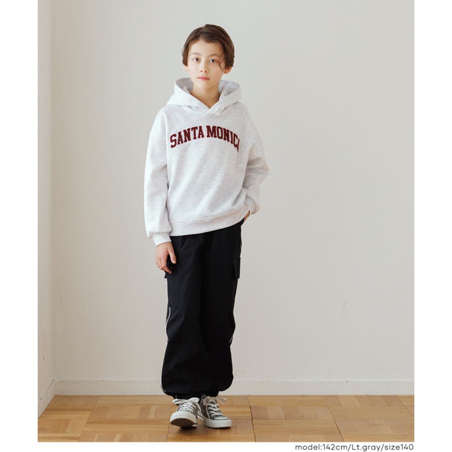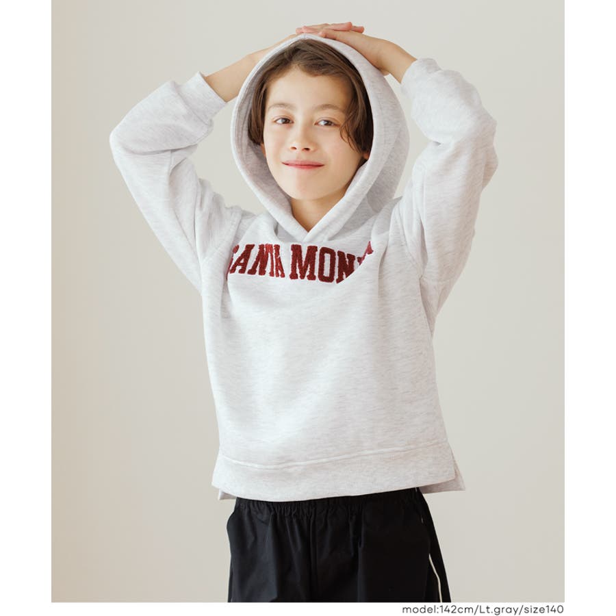 アイテム説明:カレッジ風刺繍ロゴが可愛い、親子リンクも楽しめるゆったりシルエットのキッズパーカー。