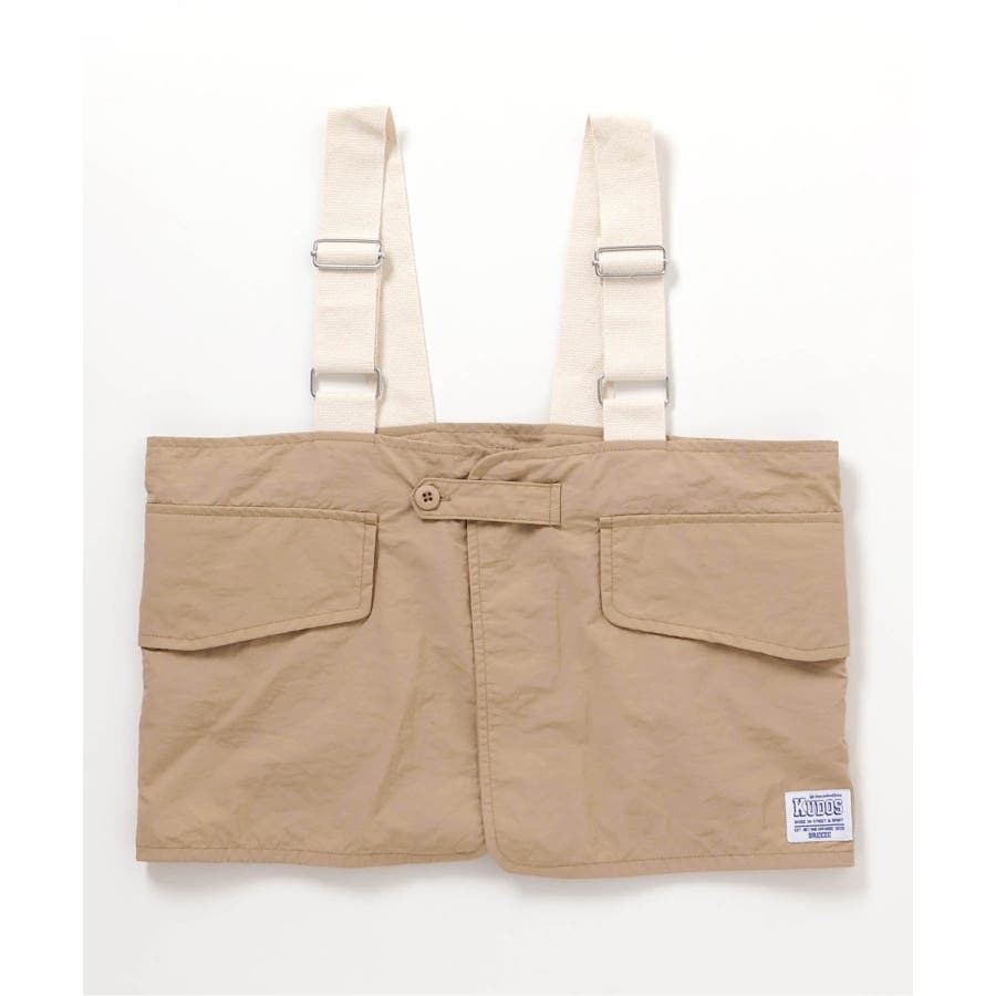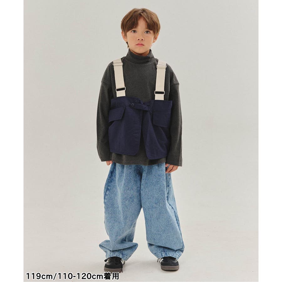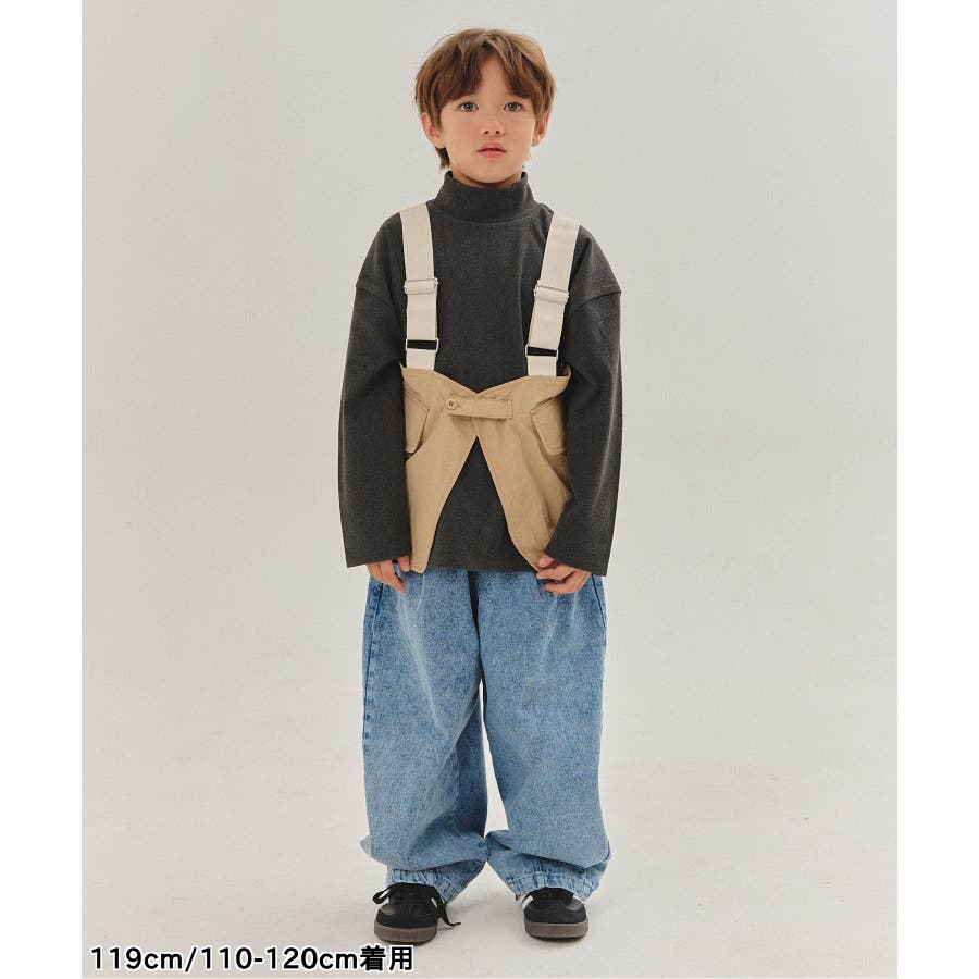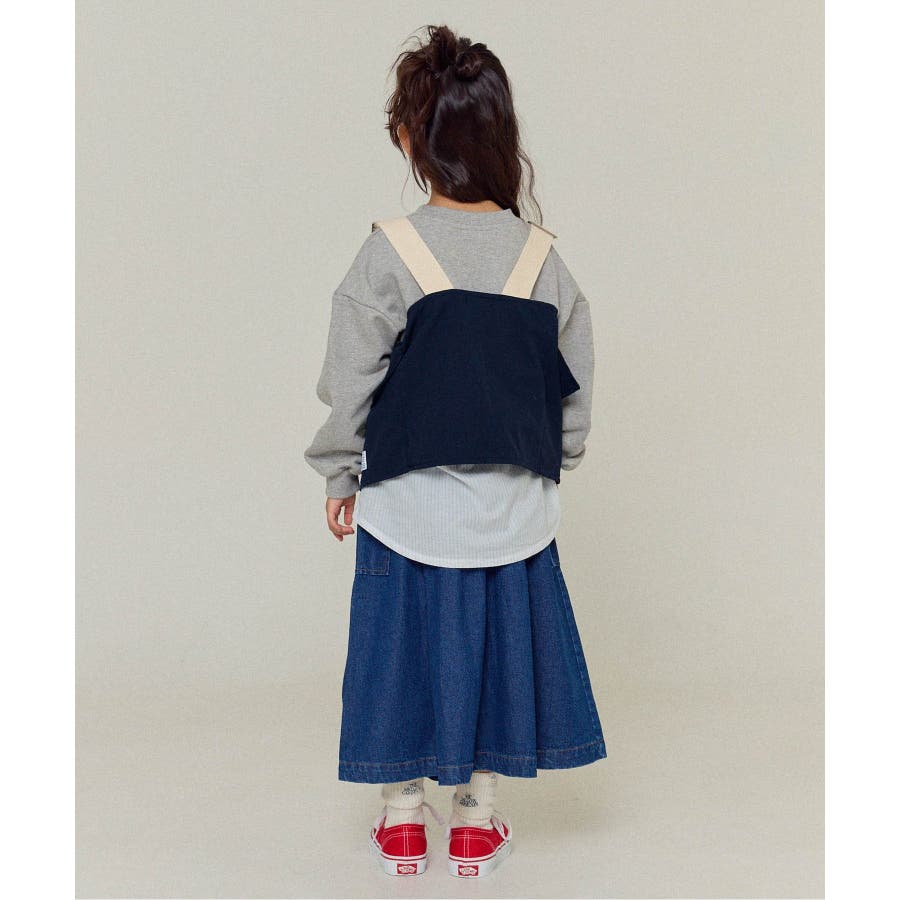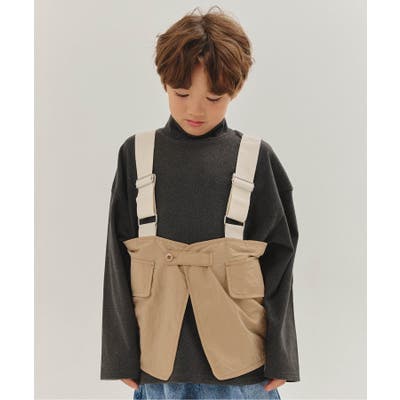 ベージュは同シリーズのスカートやワイドパンツと同素材で、セットアップ風の着こなしも可能。肩ベルトで長さ調整ができるので、成長に合わせて長く着られるのもうれしいポイントです。シンプルなデザインながらボタンやポケットなど細部までにこだわっています。