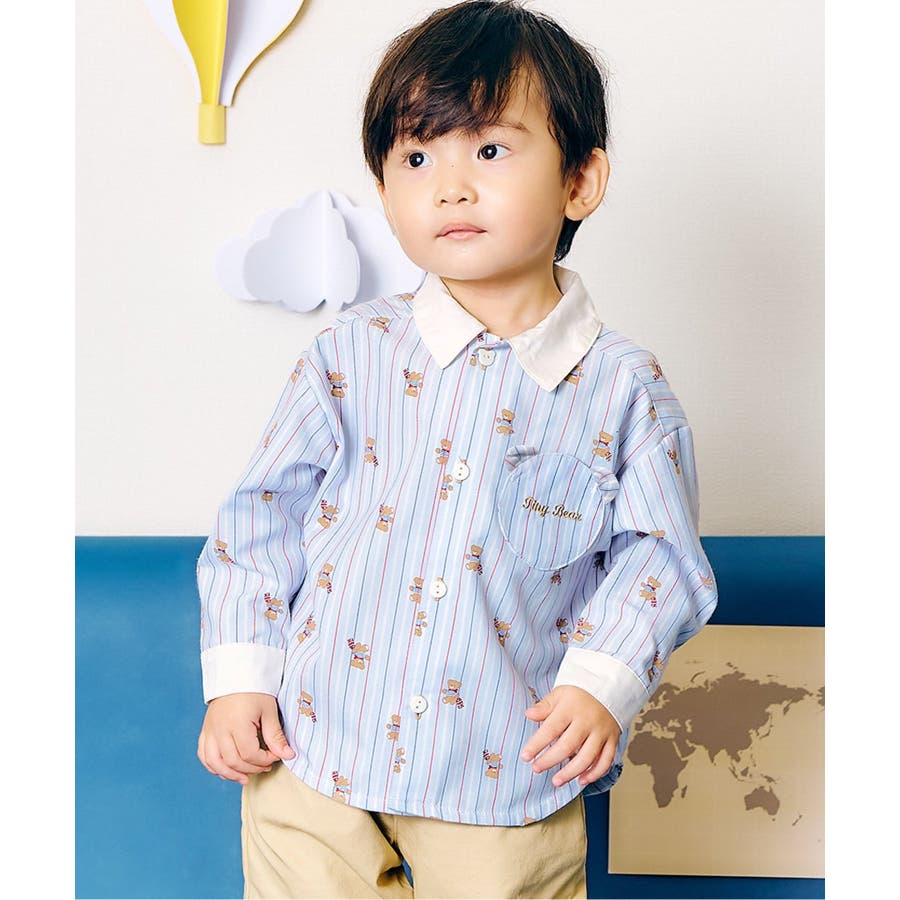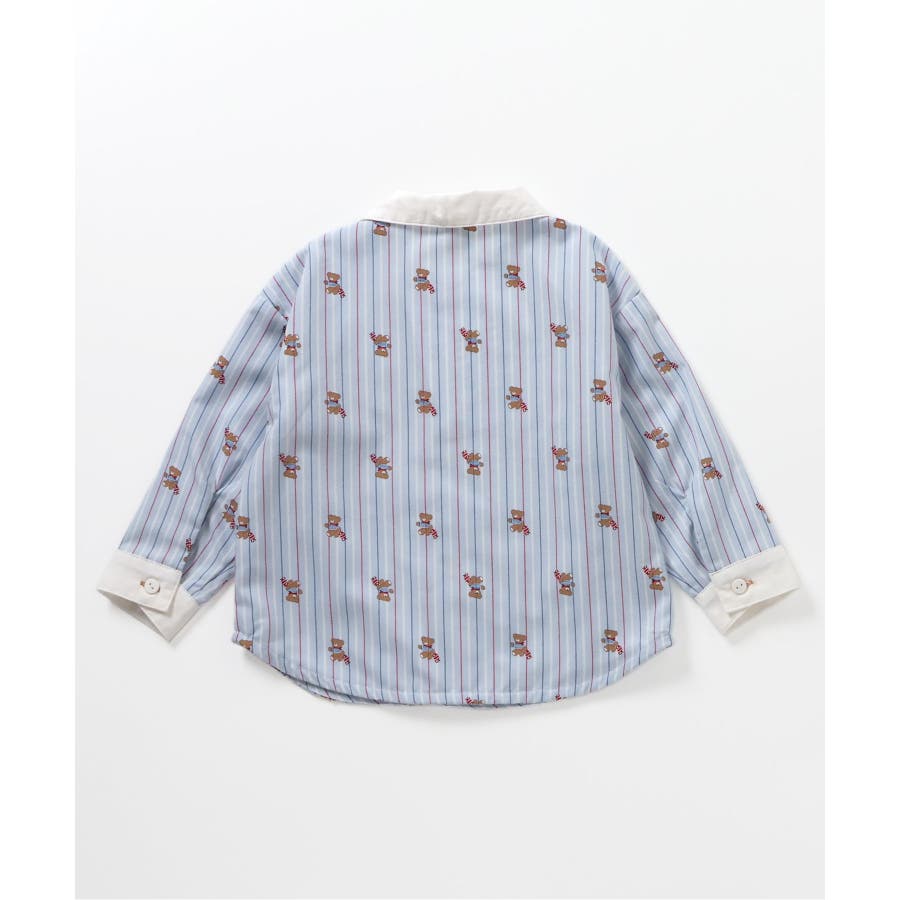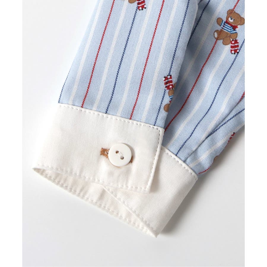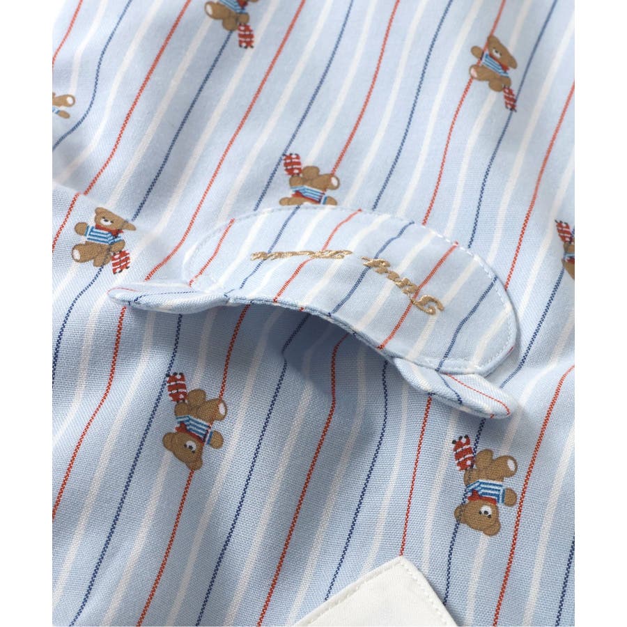 キャリーケースをもっておでかけしているタイニーベアが総柄でデザインされているストライプ柄と