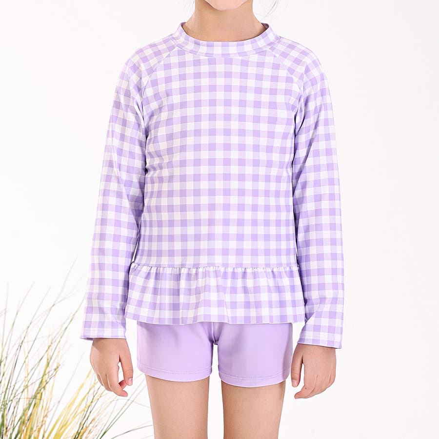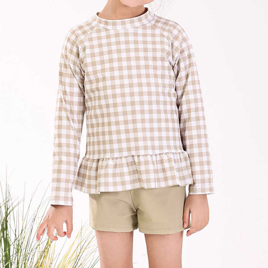 裾フリルがかわいい長袖トップスとショートパンツの露出が控えめの組み合わせでママも安心♪