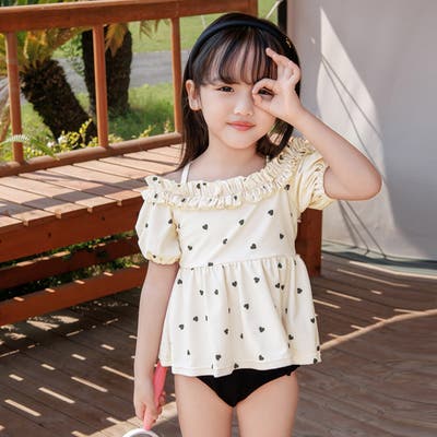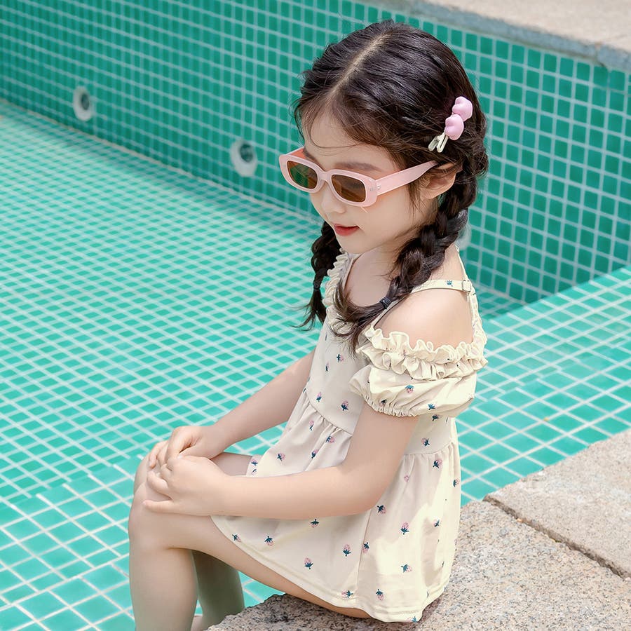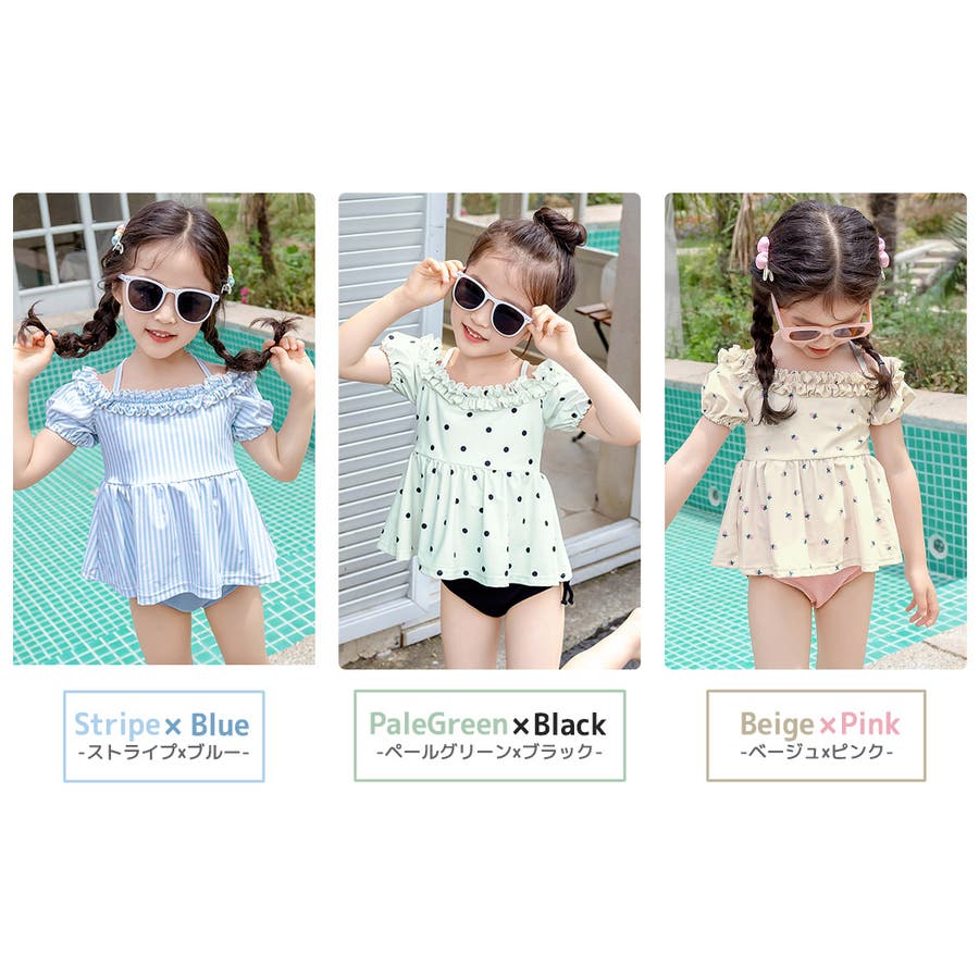 【ベージュ×ピンク】キッズ 水着 ペプラム風