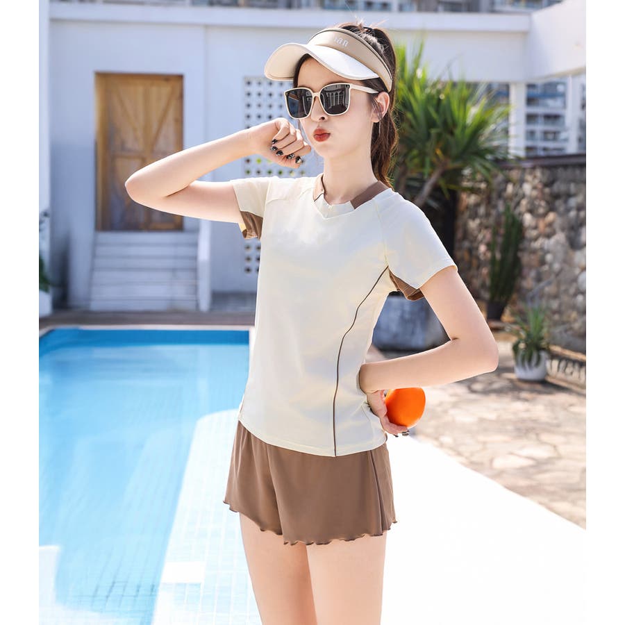 おしゃれなバイカラーのデザインが特徴の、Vネックトップスとパンツの2点セット水着。