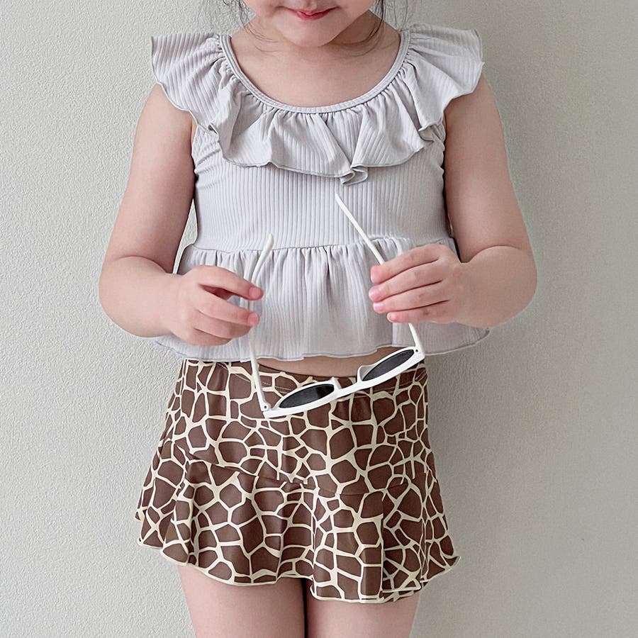リブ生地を使用したニュアンスグレーのフリルトップスとアニマル柄のスカート付きパンツを組み合わせ♪