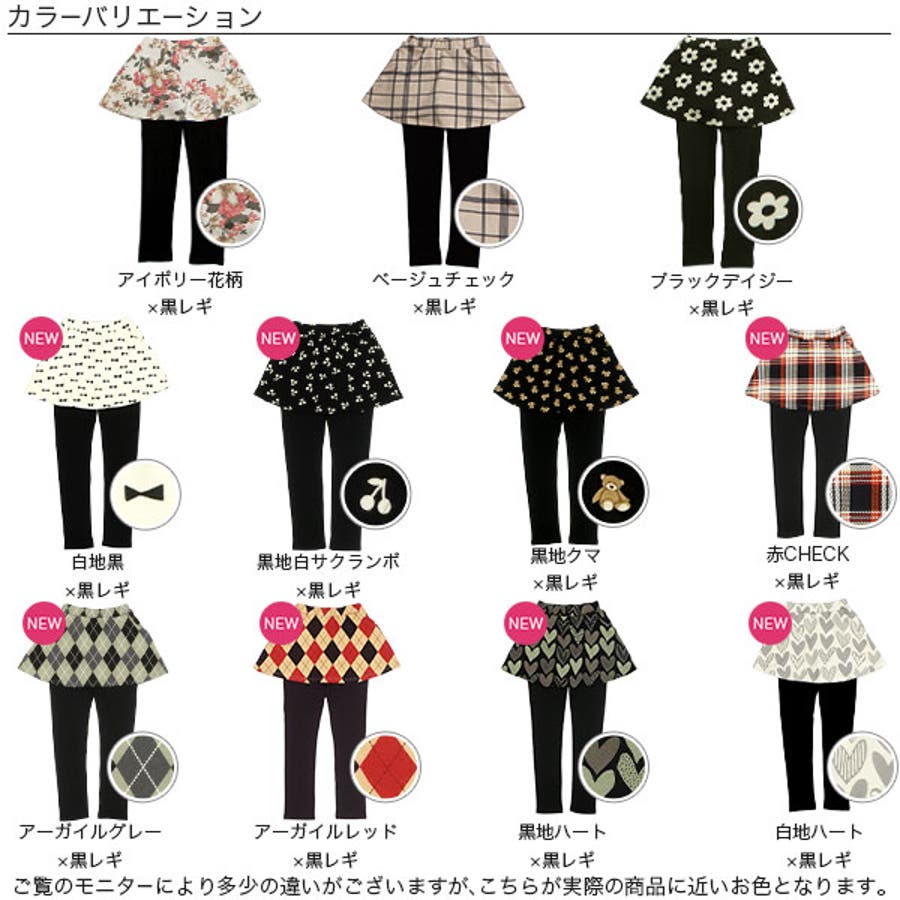 | 色 | ベージュチェック×黒レギ / アイボリー花柄×黒レギ / ブラックデイジー×黒レギ / 黒地クマ×黒レギ / 白地黒×黒レギ / 赤CHECK×黒レギ / 黒地白サクランボ×黒レギ / 黒地ハート×黒レギ / 白地ハート×黒レギ / アーガイルレッド×黒レギ / アーガイルグレー×黒レギ |