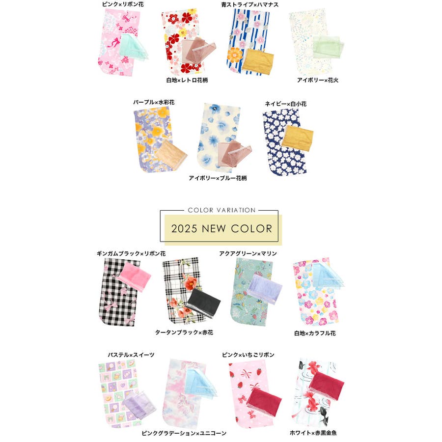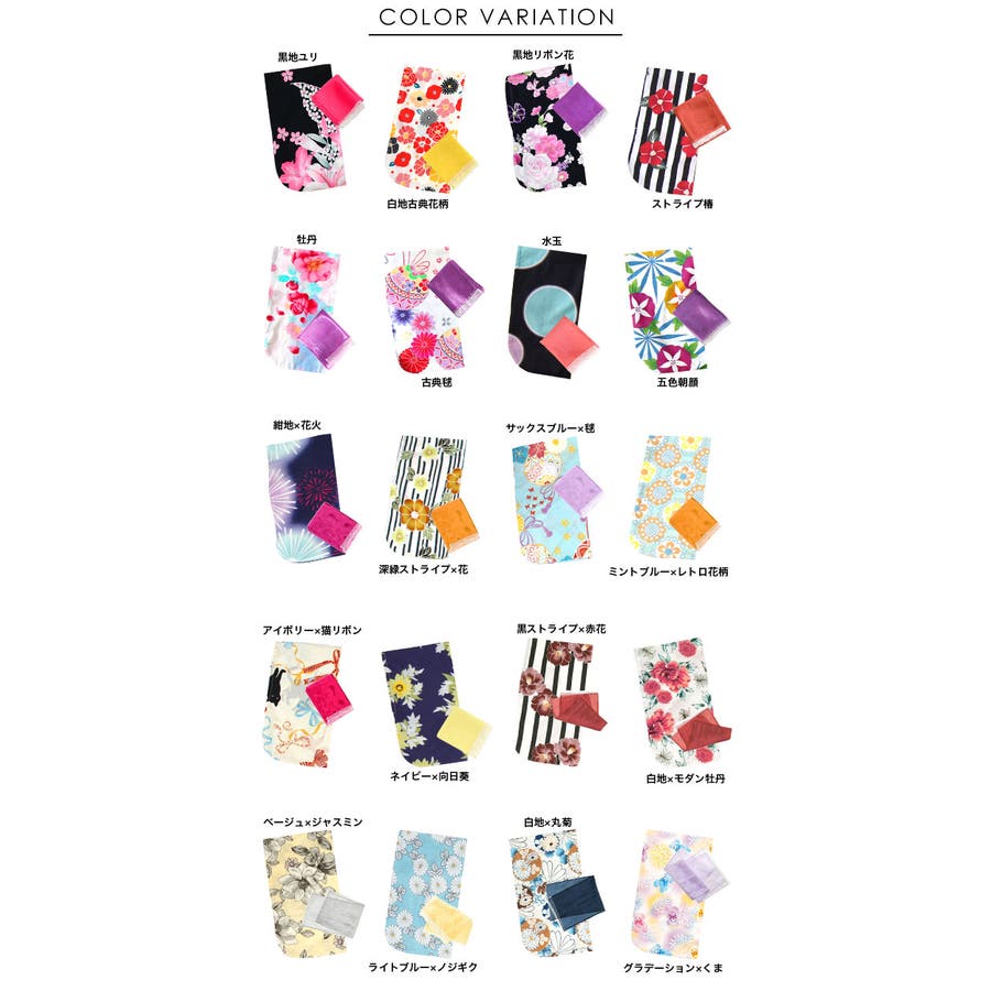 | 色 | セパレートタイプ×黒地ユリ / セパレートタイプ×黒地リボン花 / セパレートタイプ×白地古典花柄 / セパレートタイプ×ストライプ椿 / セパレートタイプ×牡丹 / セパレートタイプ×古典毬 / 紺地×花火 / 深緑ストライプ×花 / サックスブルー×毬 / ミントブルー×レトロ花柄 / アイボリー×猫リボン / ネイビー×向日葵 / ピンク×リボン花 / セパレート×水玉 / アイボリー×花火 / セパレート×五色朝顔 / 白地×レトロ花柄 / 白地×丸菊 / ライトブルー×ノジギク / ベージュ×ジャスミン / 白地×モダン牡丹 / 黒ストライプ×赤花 / グラデーション×くま / 青ストライプ×ハマナス / パープル×水彩花 / アイボリー×ブルー花柄 / ネイビー×白小花 / ギンガムブラック×リボン花 / タータンブラック×赤花 / アクアグリーン×マリン / 白地×カラフル花 / パステル×スイーツ / ピンクグラデーション×ユニコーン / ピンク×いちごリボン / ホワイト×赤黒金魚 |