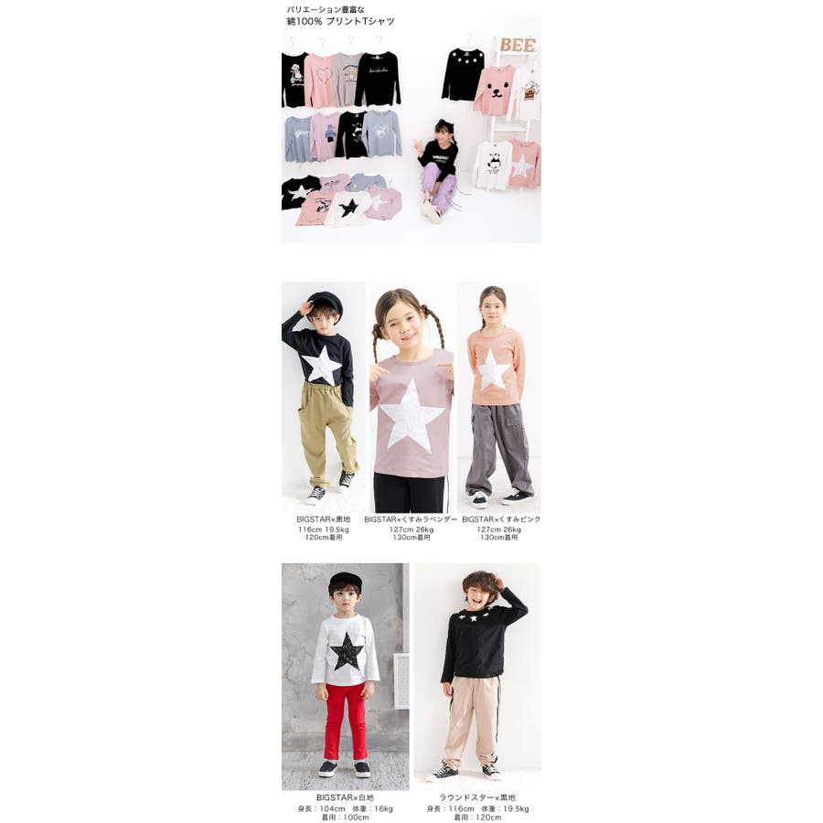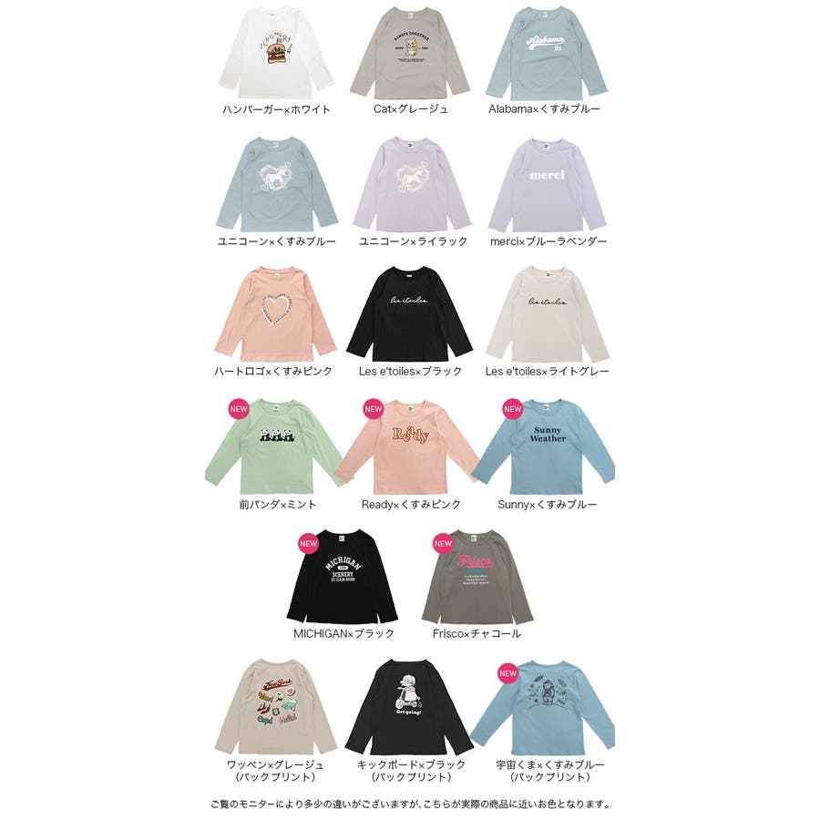| 色 | 07.BIGSTAR×黒地 / Californiaネイビー / BIGSTAR×杢チャコール地 / 19.ラウンドスター×黒地 / 35.後styleパンダ×黒地 / 36.後styleパンダ×白地 / 08.BIGSTAR×白地 / 74.Nightキャット×黒地 / 76.ねこBIGフェイス×黒地 / DELIGHT×ブラウン地 / DELIGHT×ミント地 / BIGSTAR×くすみラベンダー / BIGSTAR×Nくすみピンク / Penguin×Nくすみピンク / アニマル×Nくすみピンク / Nくすみブルー×袖スター / cupcake×くすみラベンダー / Girl×くすみラベンダー / FLOWER×ブラック地 / キックボード×ブラック / ハンバーガー×ホワイト / ハートロゴ×くすみピンク / Alabama×くすみブルー / ユニコーン×くすみブルー / Cat×グレージュ / Les e'toiles×ブラック / ワッペン×グレージュ / merci×ブルーラベンダー / Les e'toiles×ライトグレー / ユニコーン×ライラック / 前パンダ×ミント / 宇宙くま×くすみブルー / Sunny×くすみブルー / Ready×くすみピンク / MICHIGAN×ブラック / Frisco×チャコール |