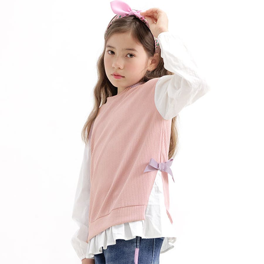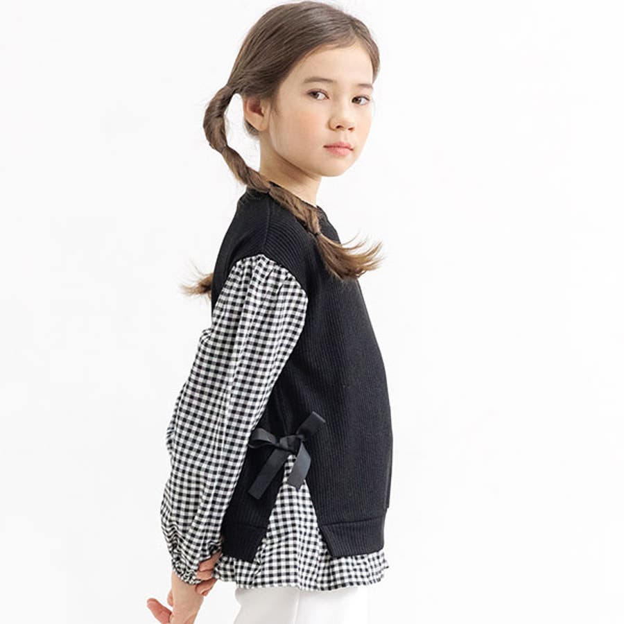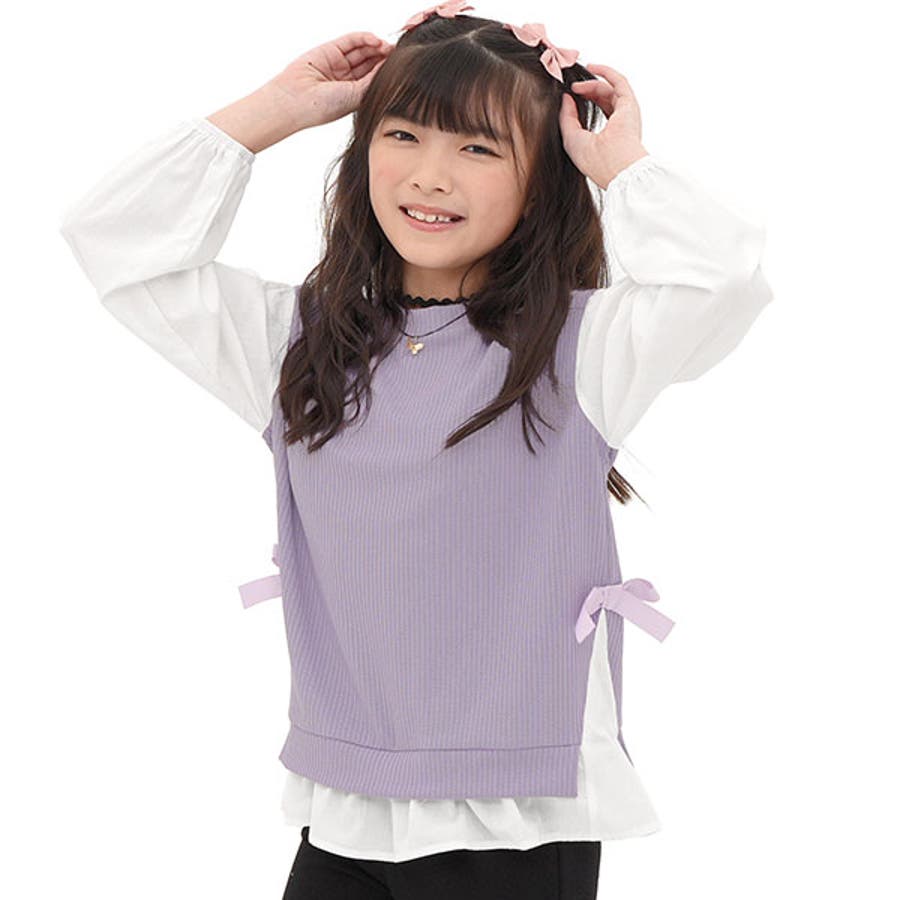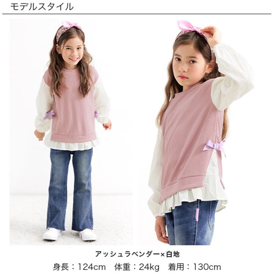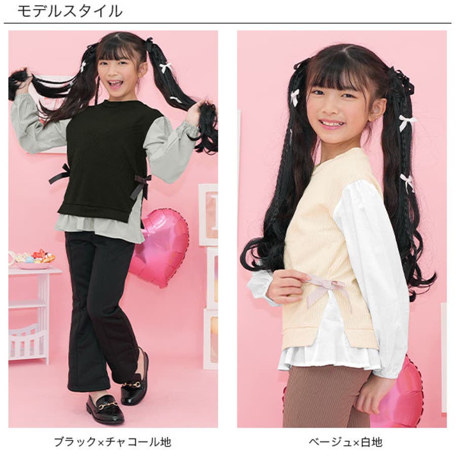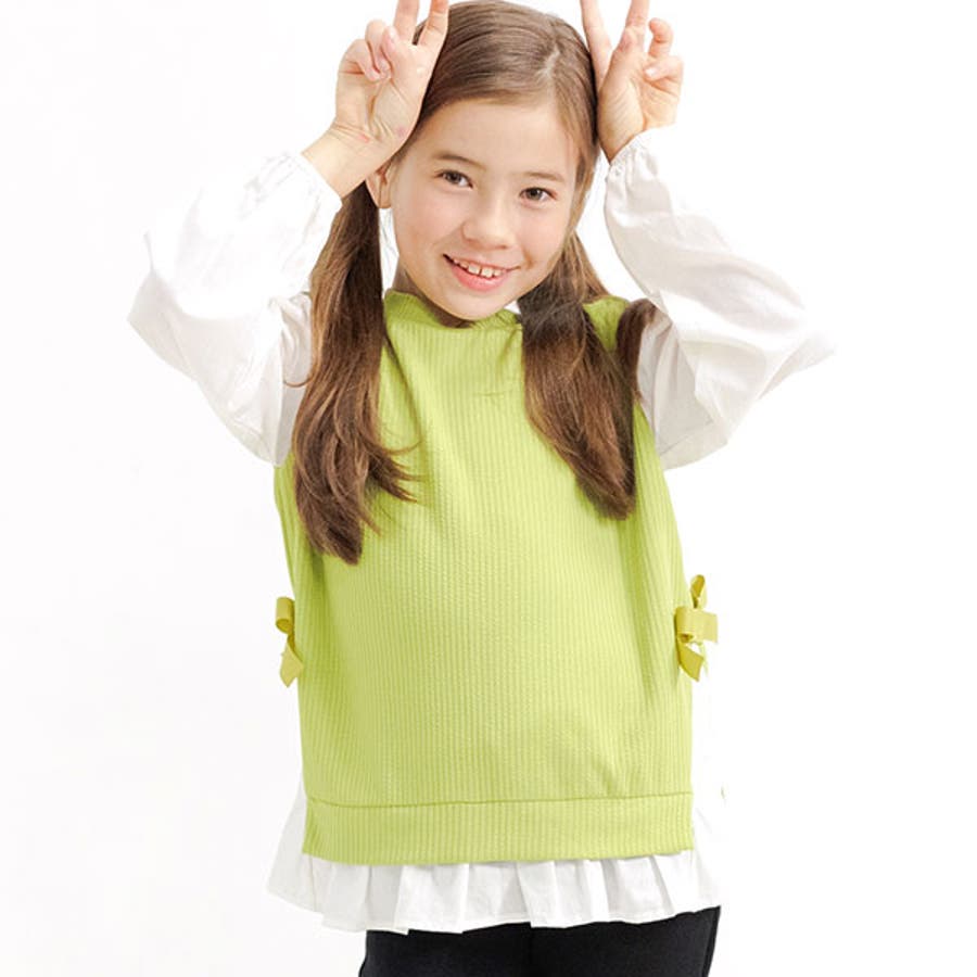 サイドリボンで女の子らしさを演出し、ベストとシャツのドッキングでキレイめコーデにもピッタリです。