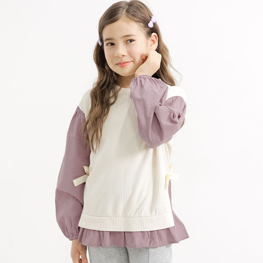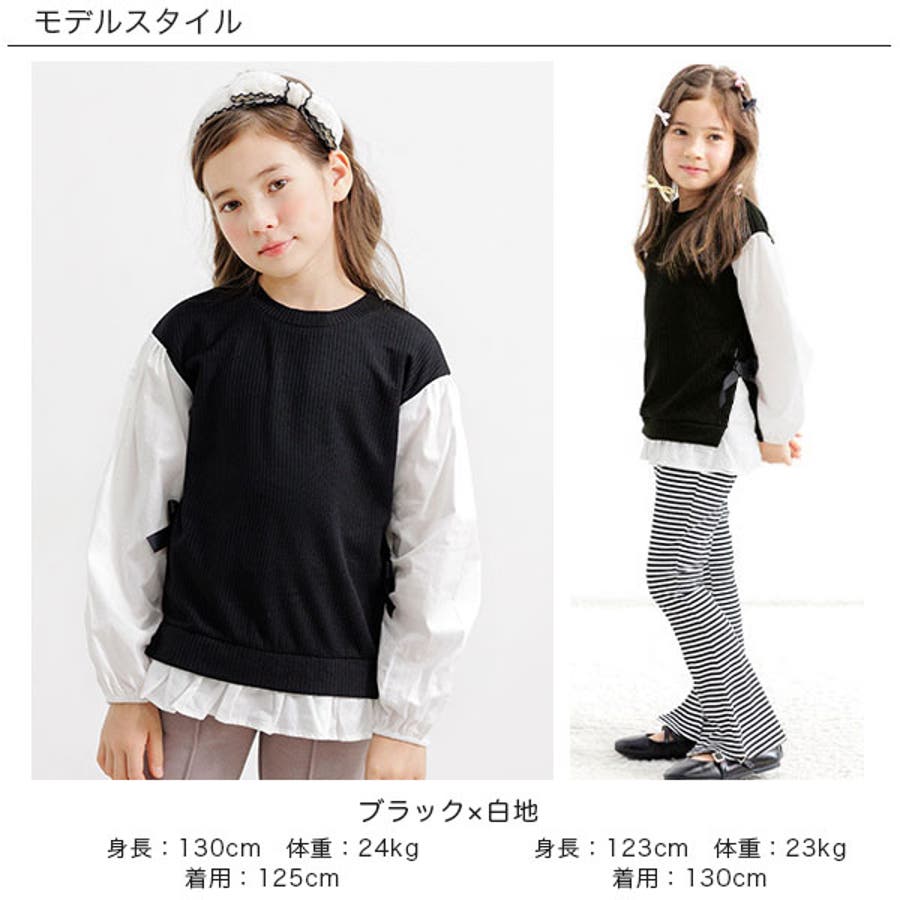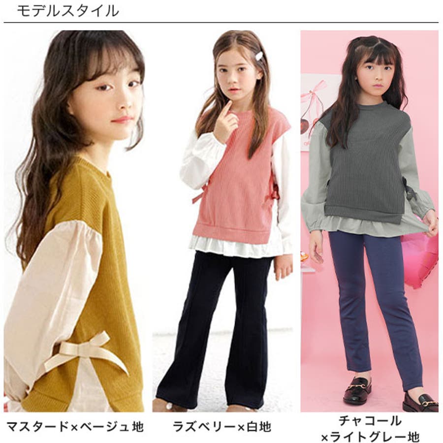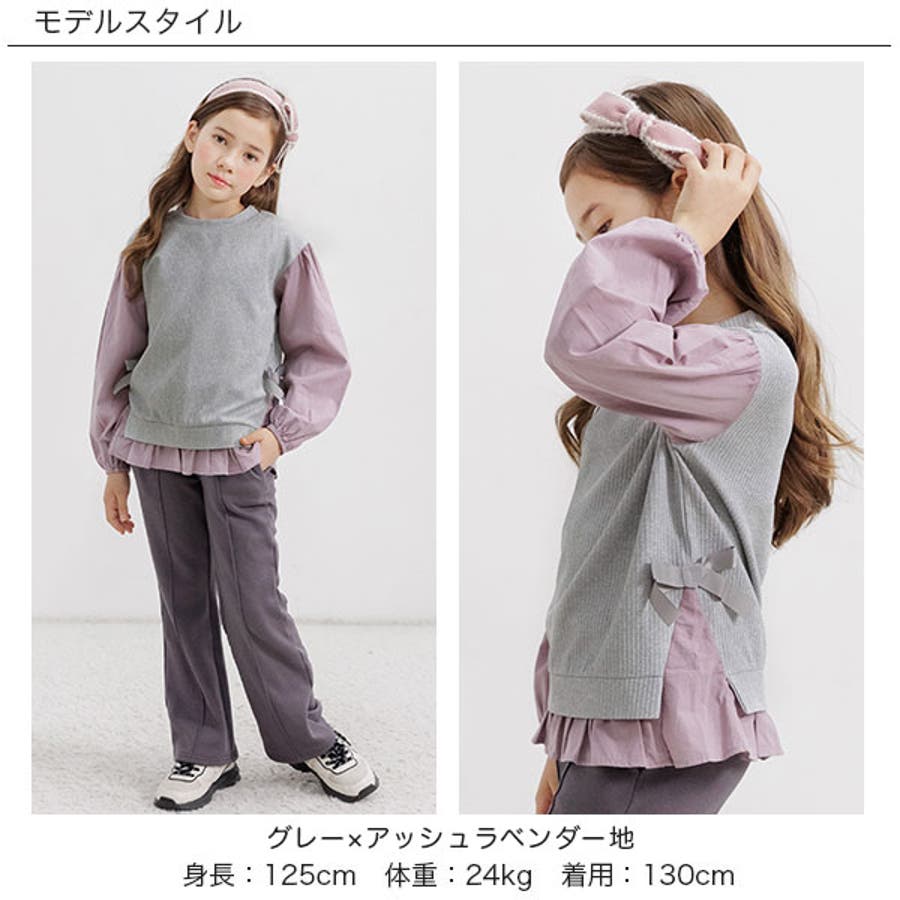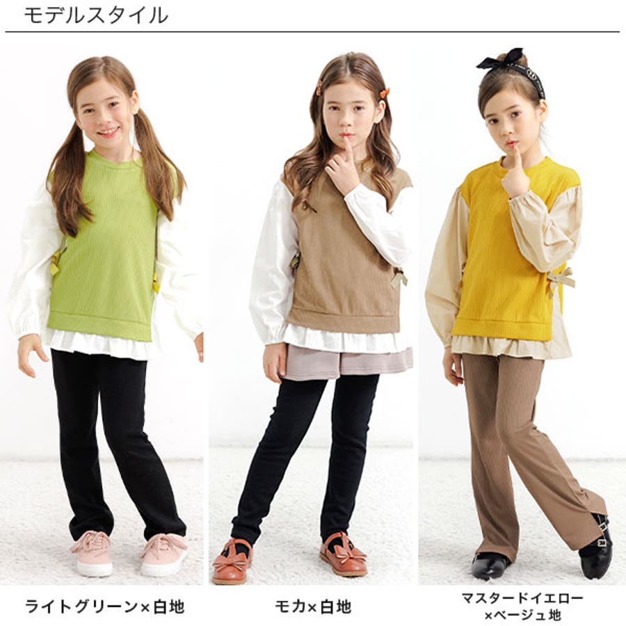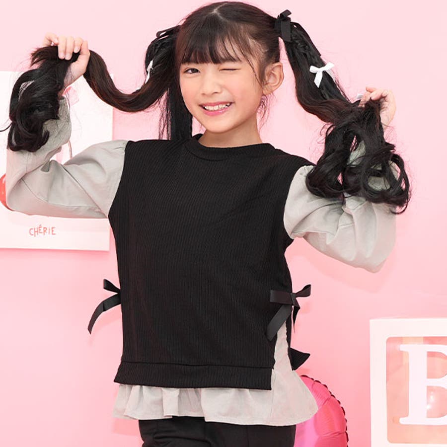 サイドリボンで女の子らしさを演出し、ベストとシャツのドッキングでキレイめコーデにもピッタリです。