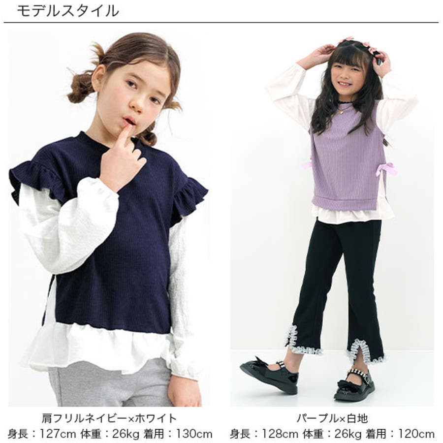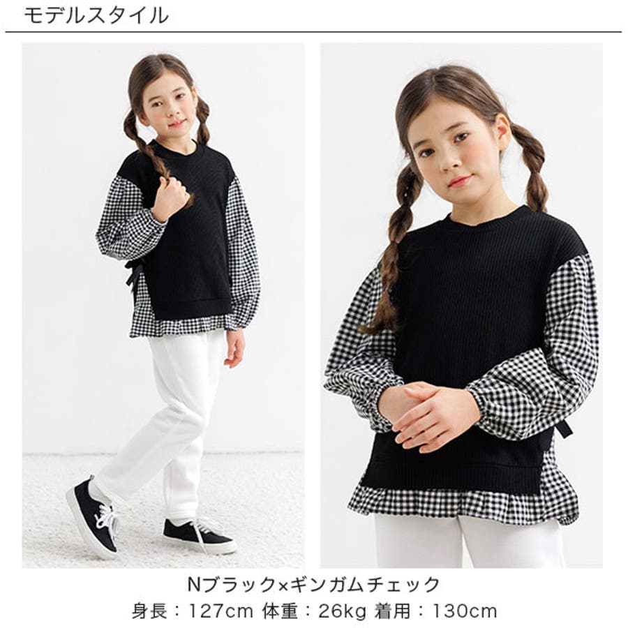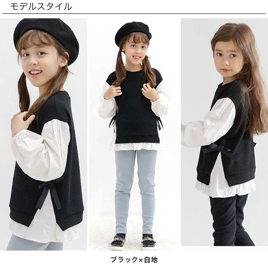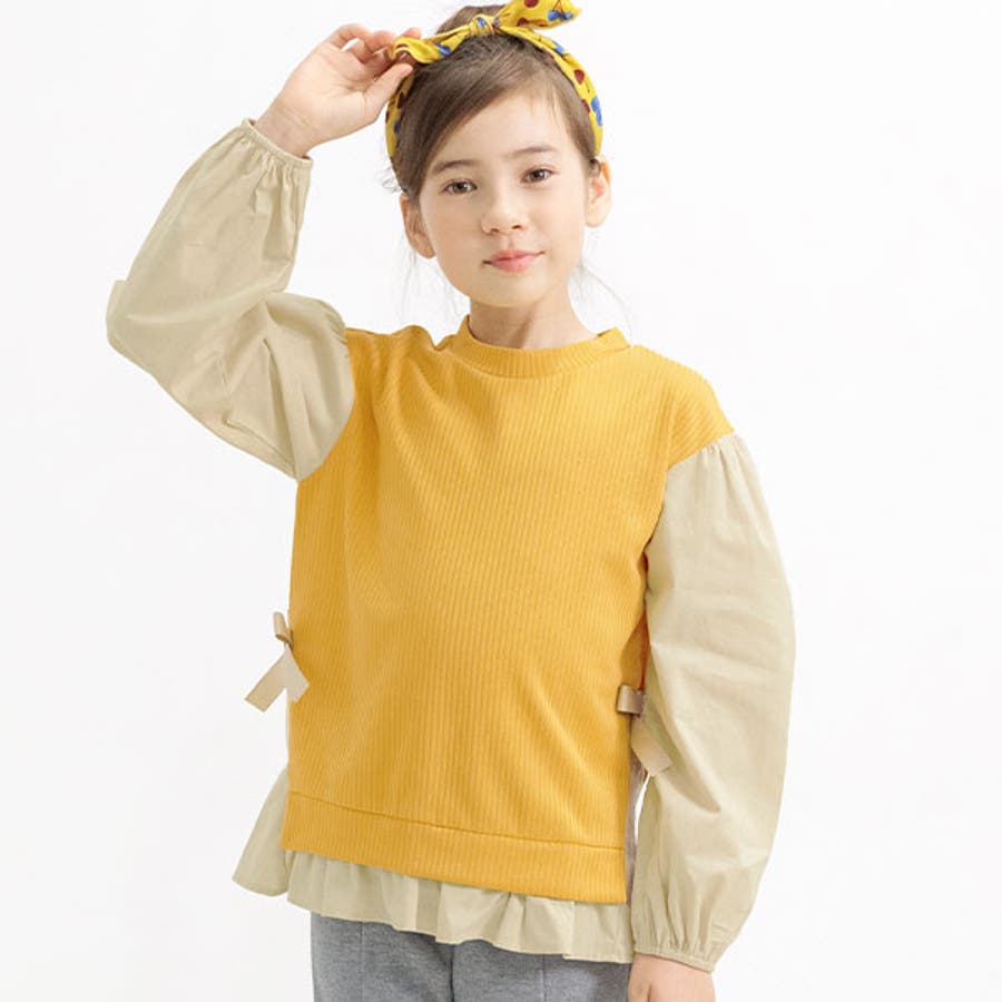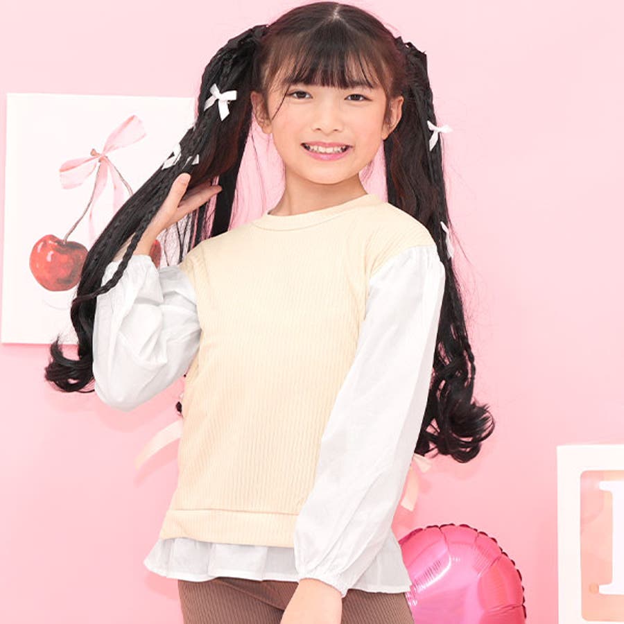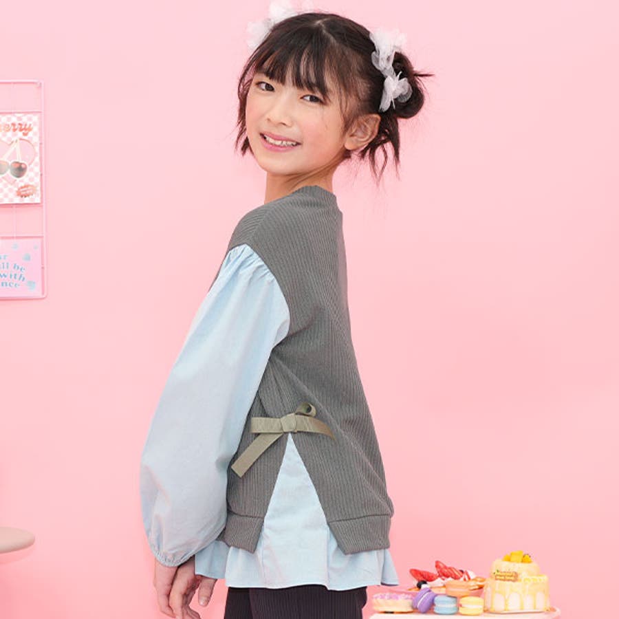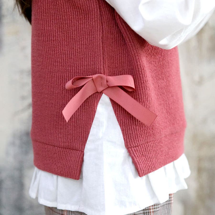 サイドリボンで女の子らしさを演出し、ベストとシャツのドッキングでキレイめコーデにもピッタリです。