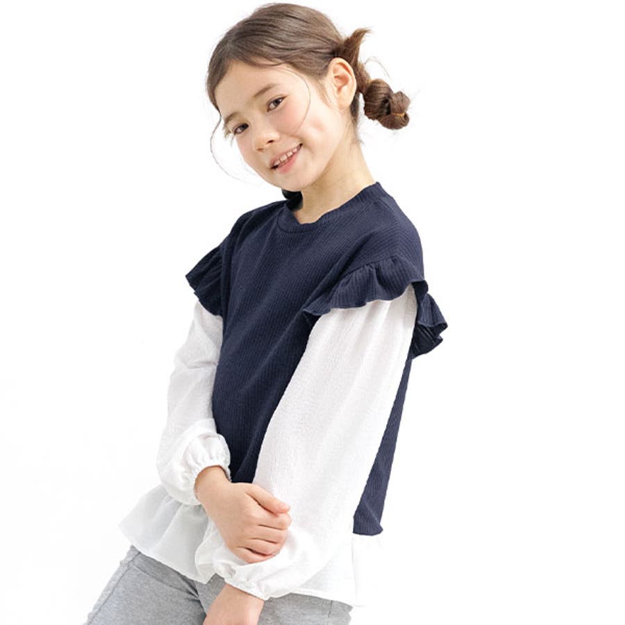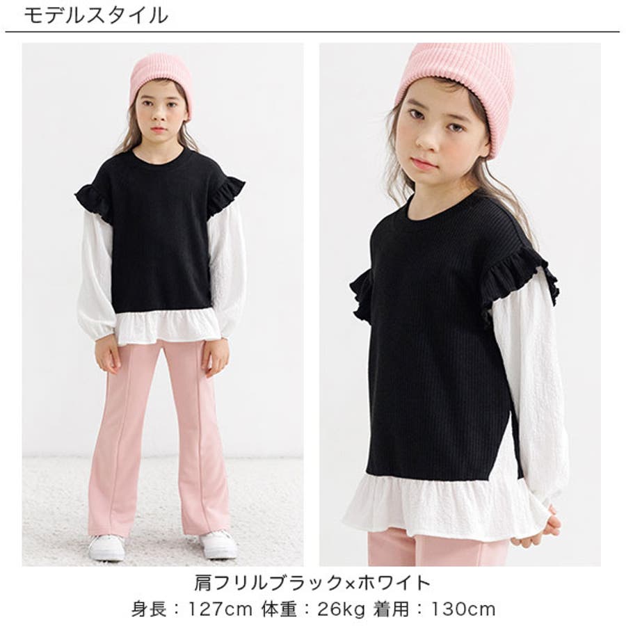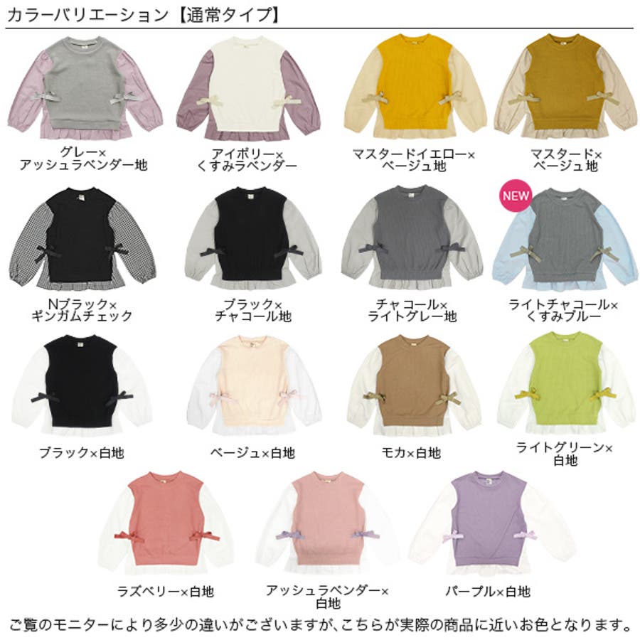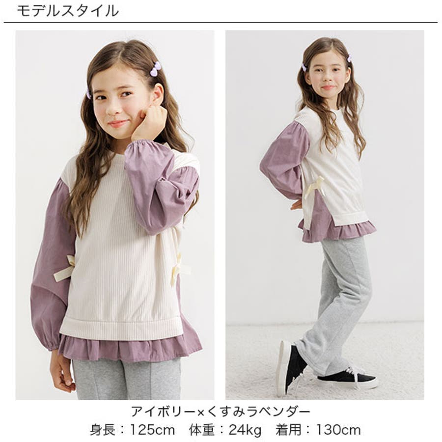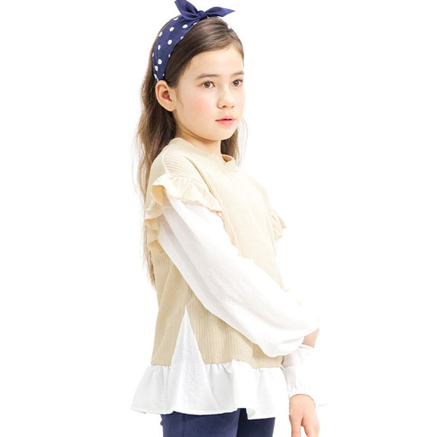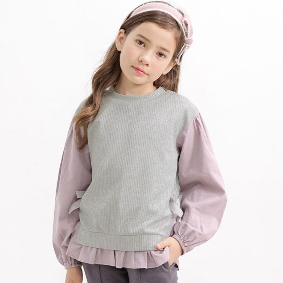 サイドリボンで女の子らしさを演出し、ベストとシャツのドッキングでキレイめコーデにもピッタリです。