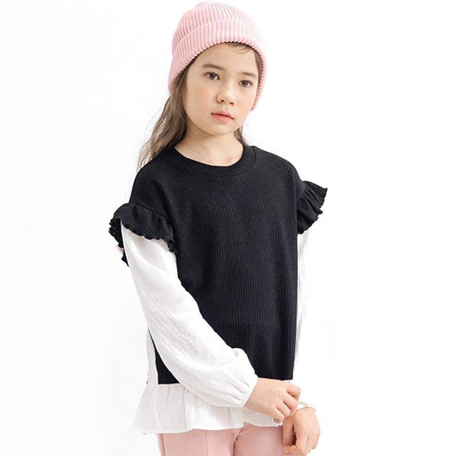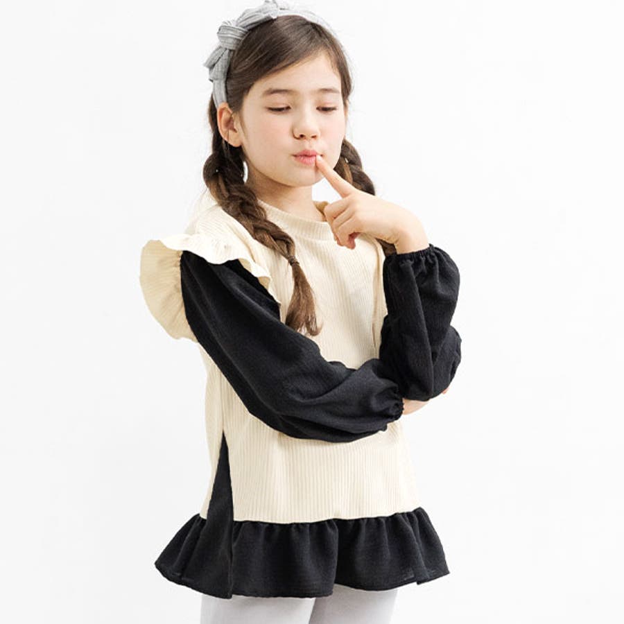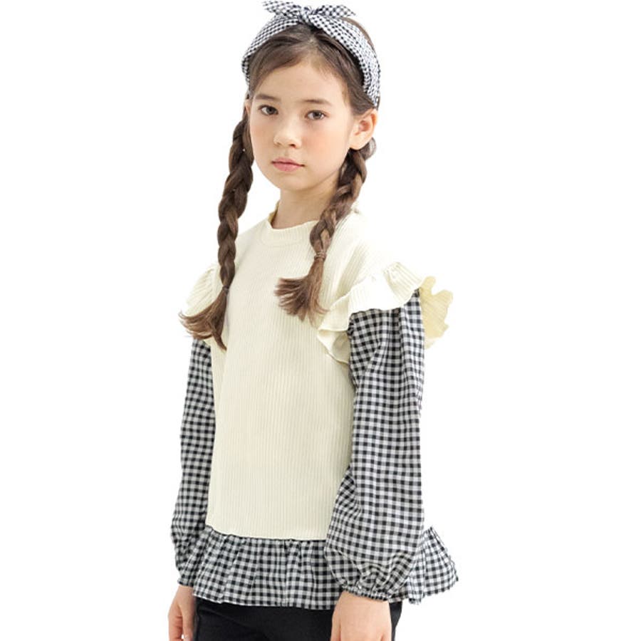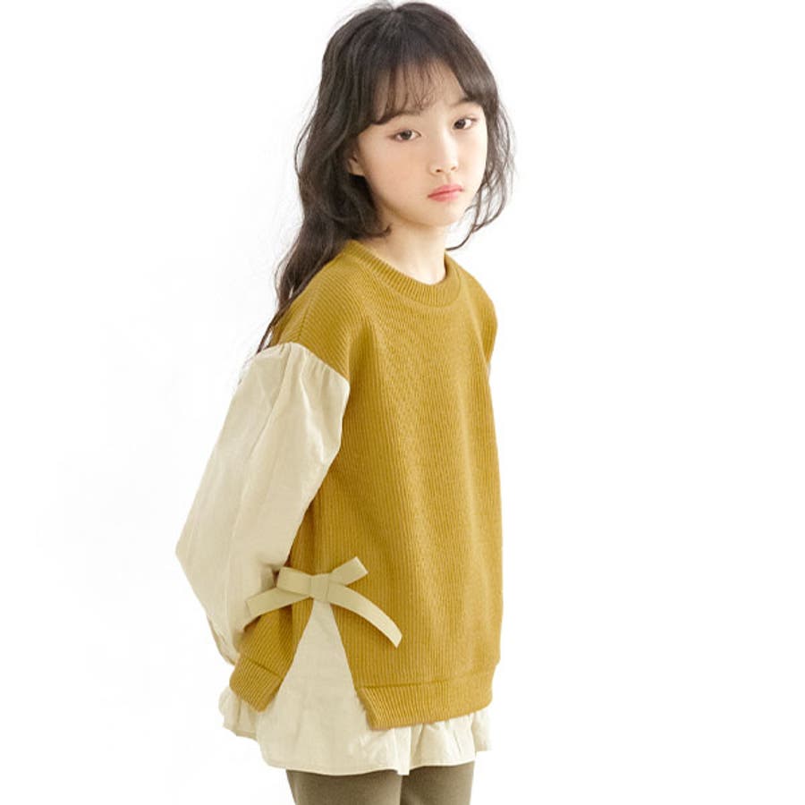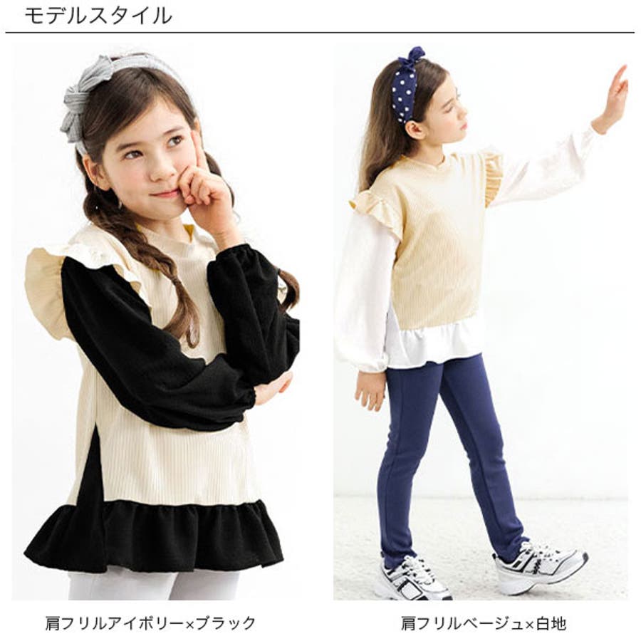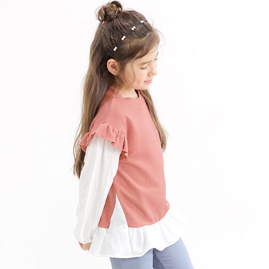 サイドリボンで女の子らしさを演出し、ベストとシャツのドッキングでキレイめコーデにもピッタリです。