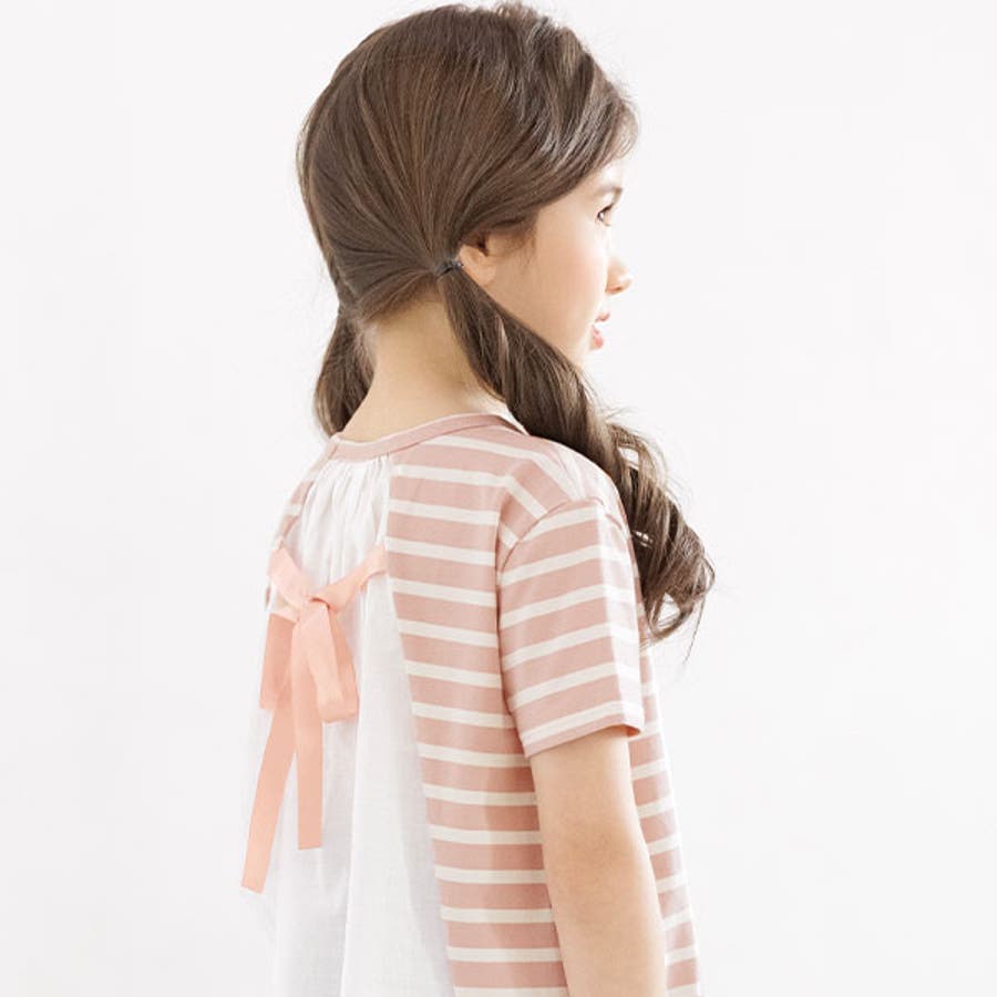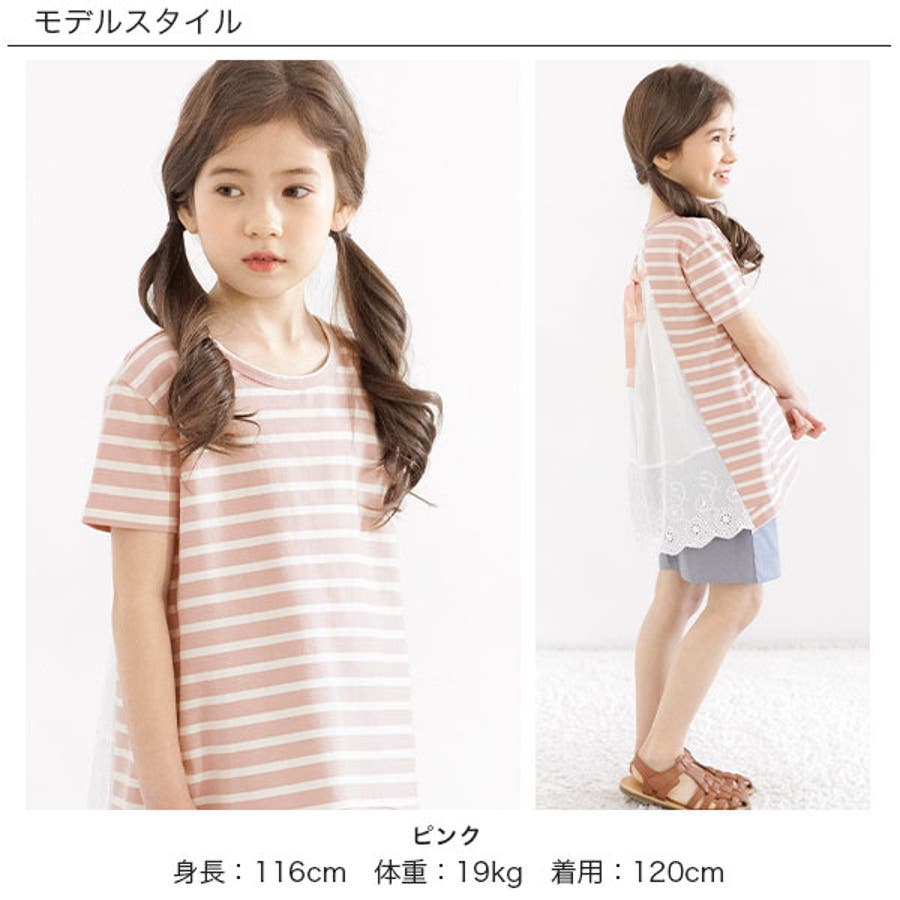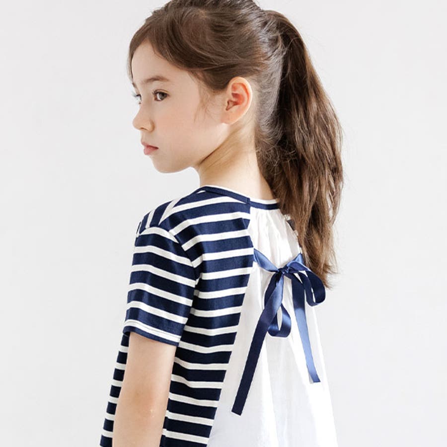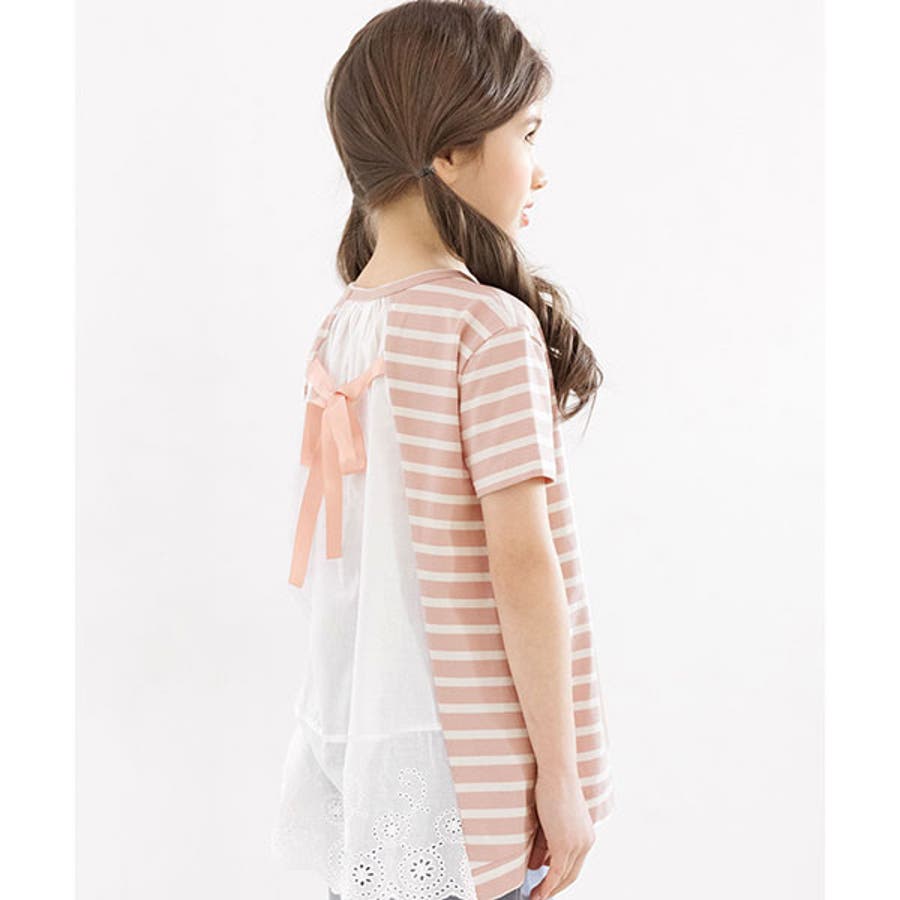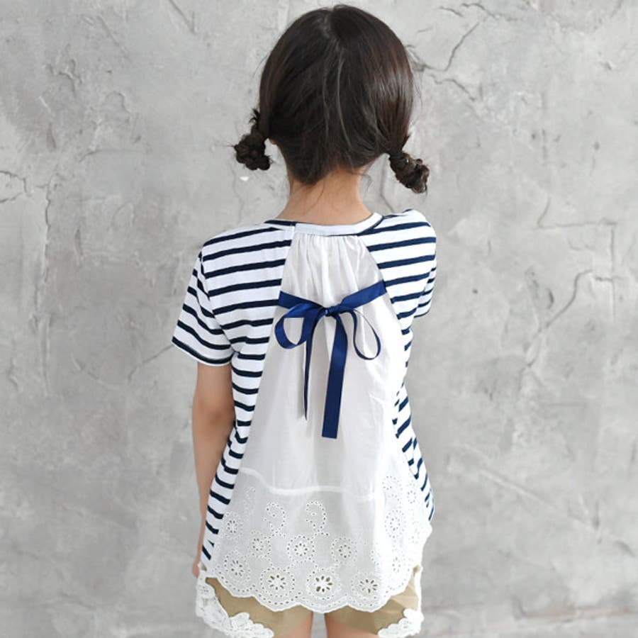 韓国子供服 韓国子ども服 韓国こども服 Bee カジュアル ナチュラル キッズ 女の子 チュニック プルオーバー レース 後ろリボンボーダー 半袖 春 夏 90 100 110 120 130 140