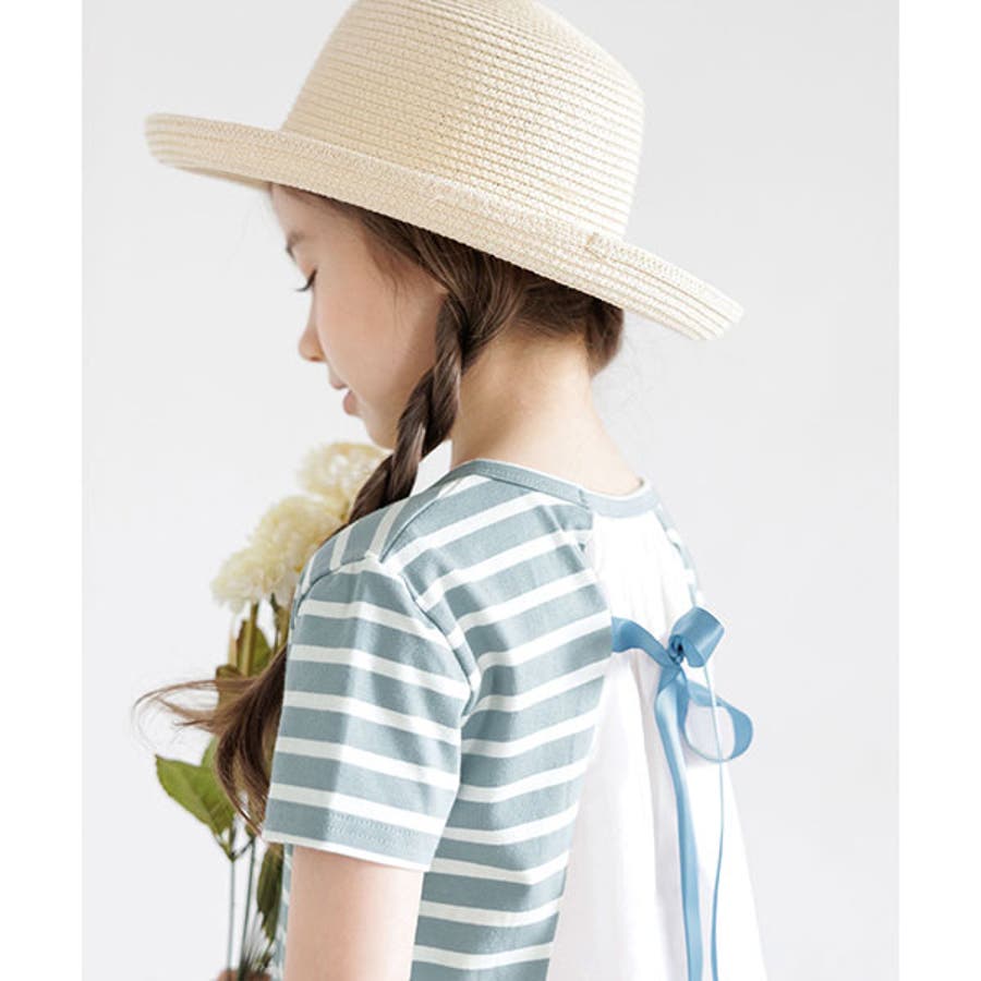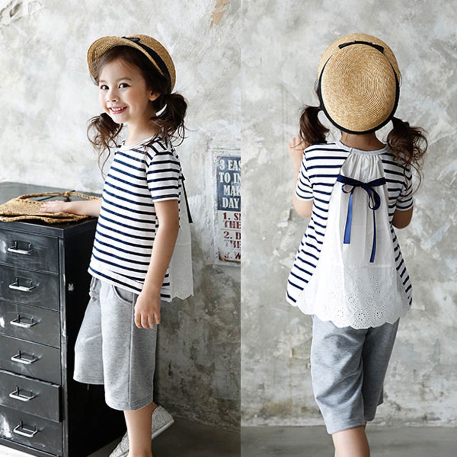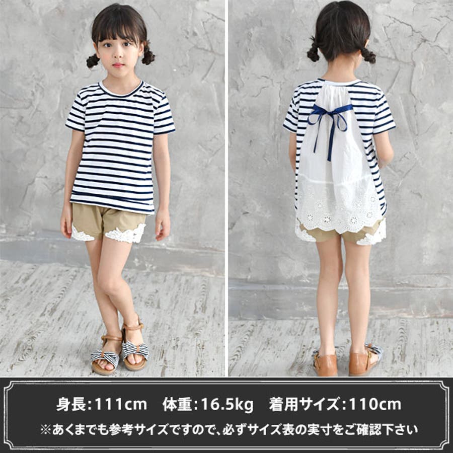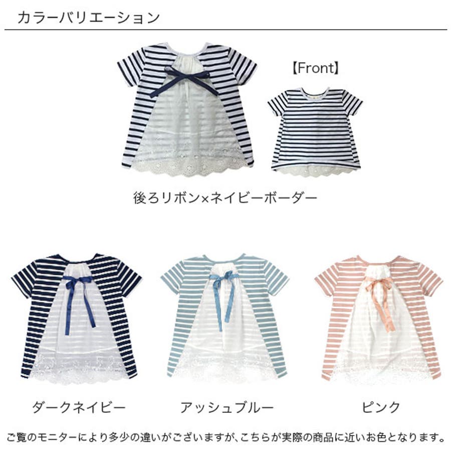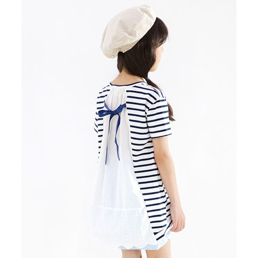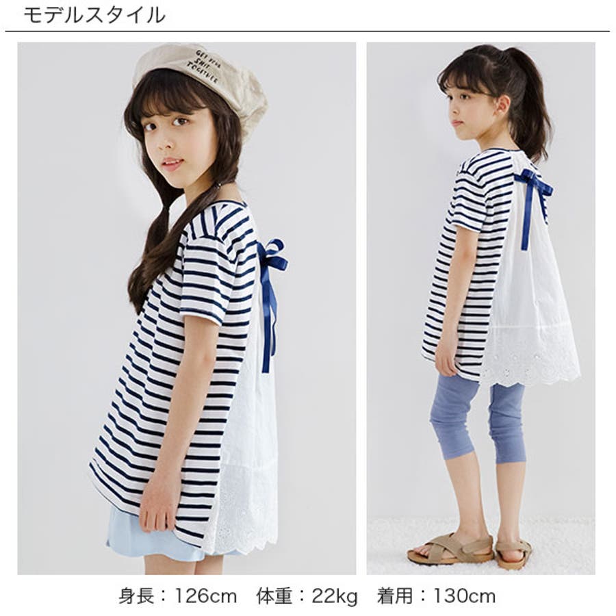 韓国子供服 韓国子ども服 韓国こども服 Bee カジュアル ナチュラル キッズ 女の子 チュニック プルオーバー レース 後ろリボンボーダー 半袖 春 夏 90 100 110 120 130 140