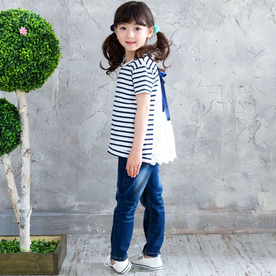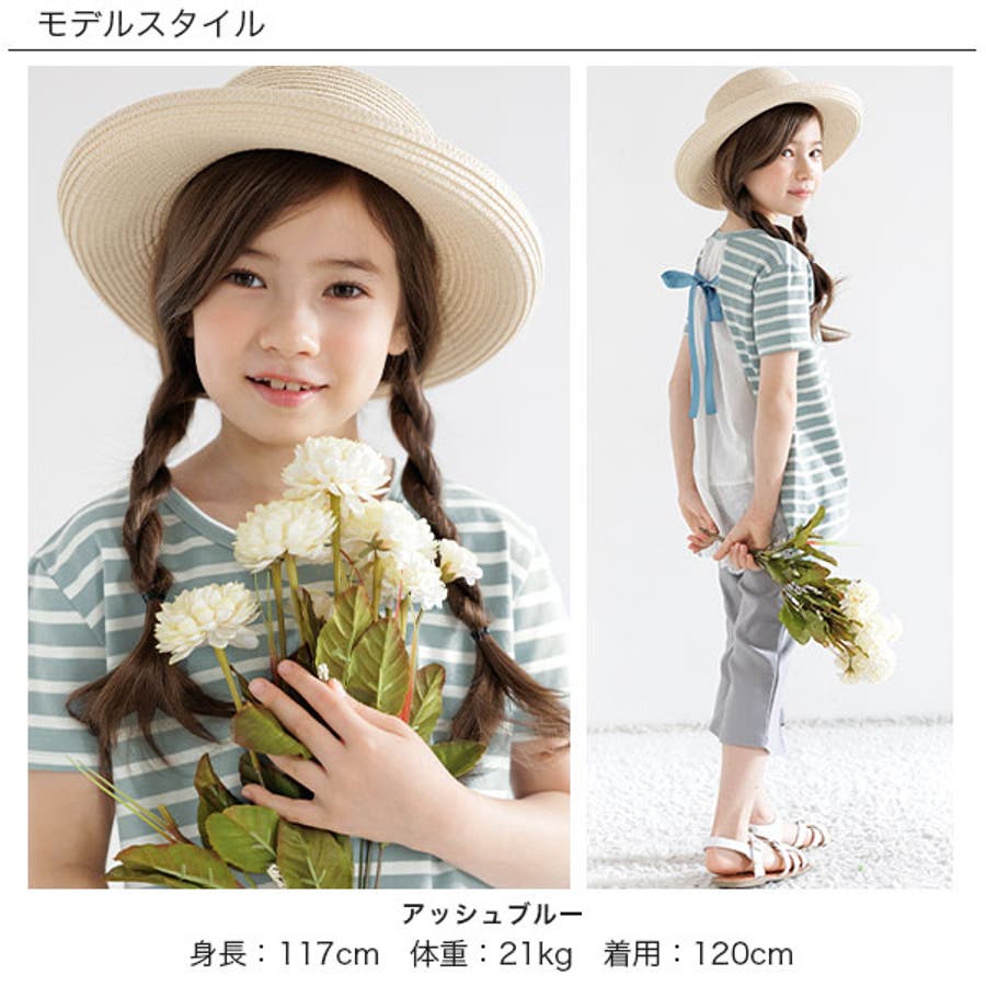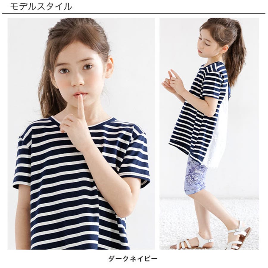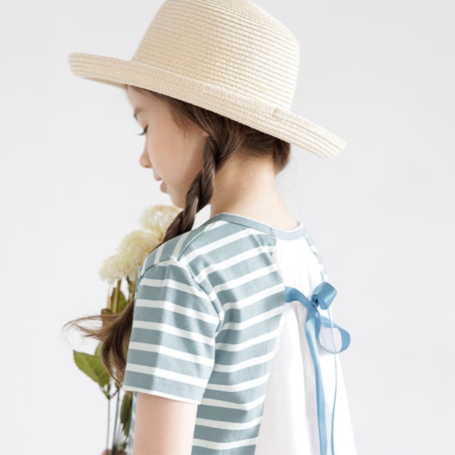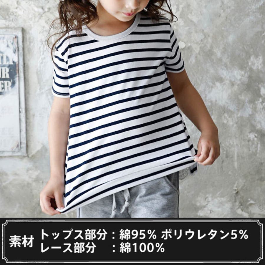 韓国子供服 韓国子ども服 韓国こども服 Bee カジュアル ナチュラル キッズ 女の子 チュニック プルオーバー レース 後ろリボンボーダー 半袖 春 夏 90 100 110 120 130 140