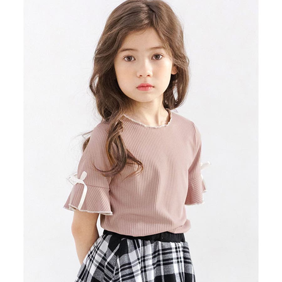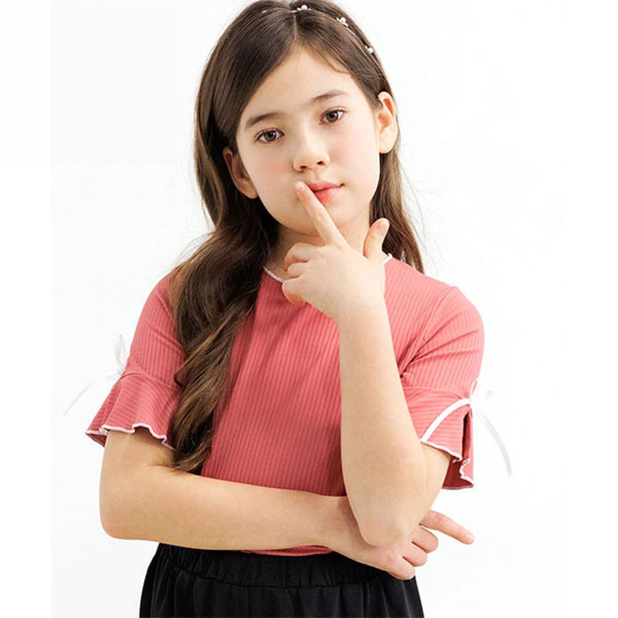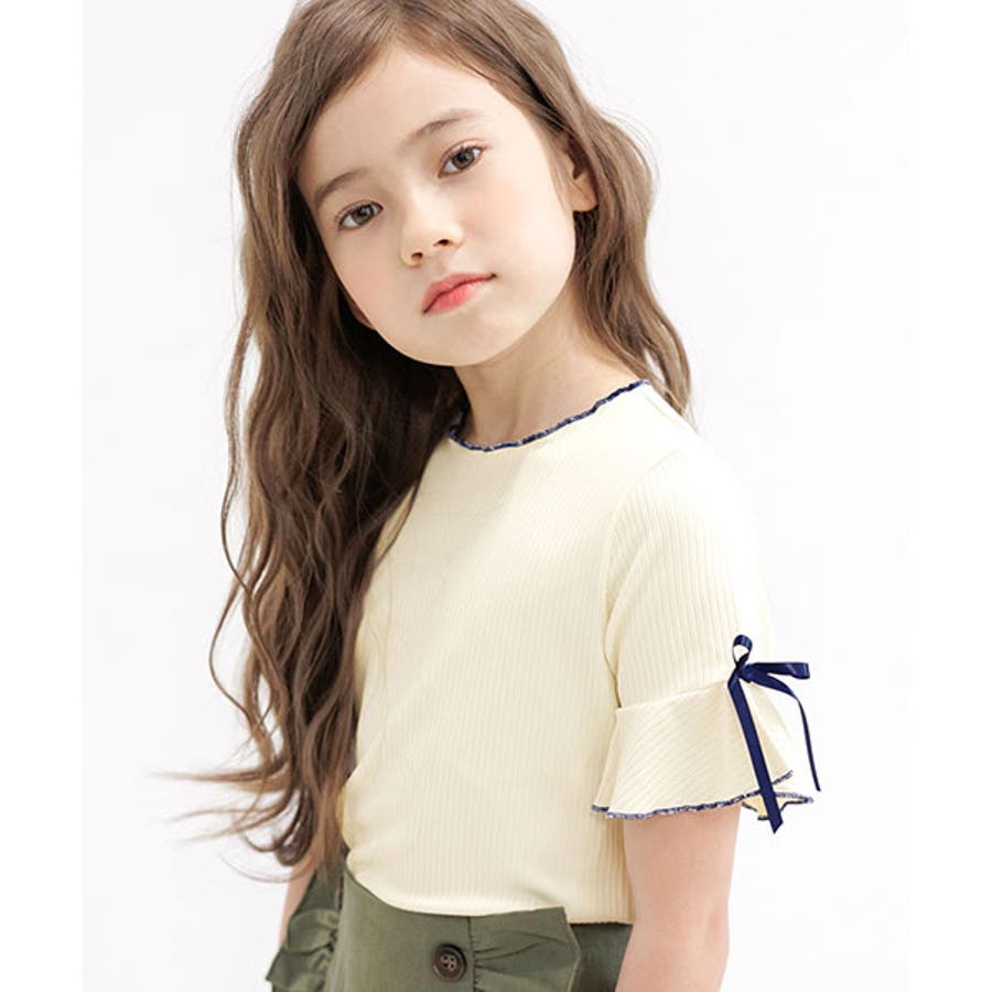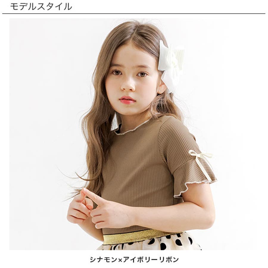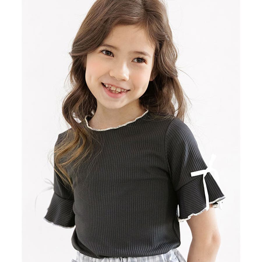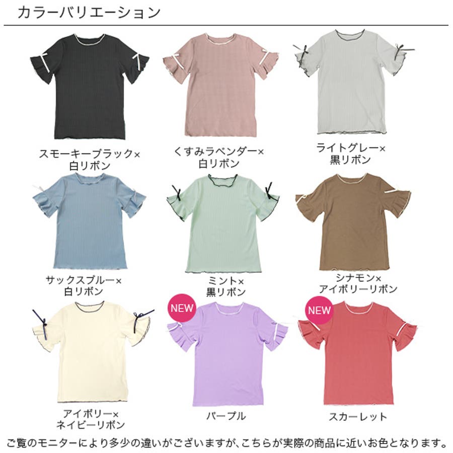 リブ地トップス フレア袖 リボン