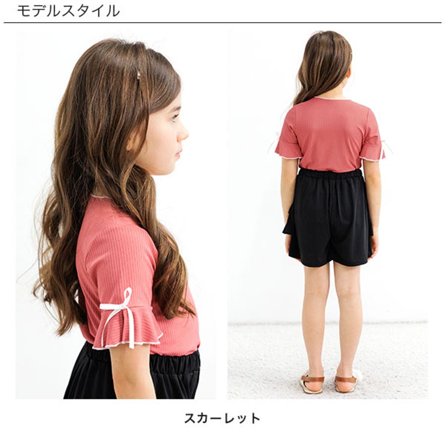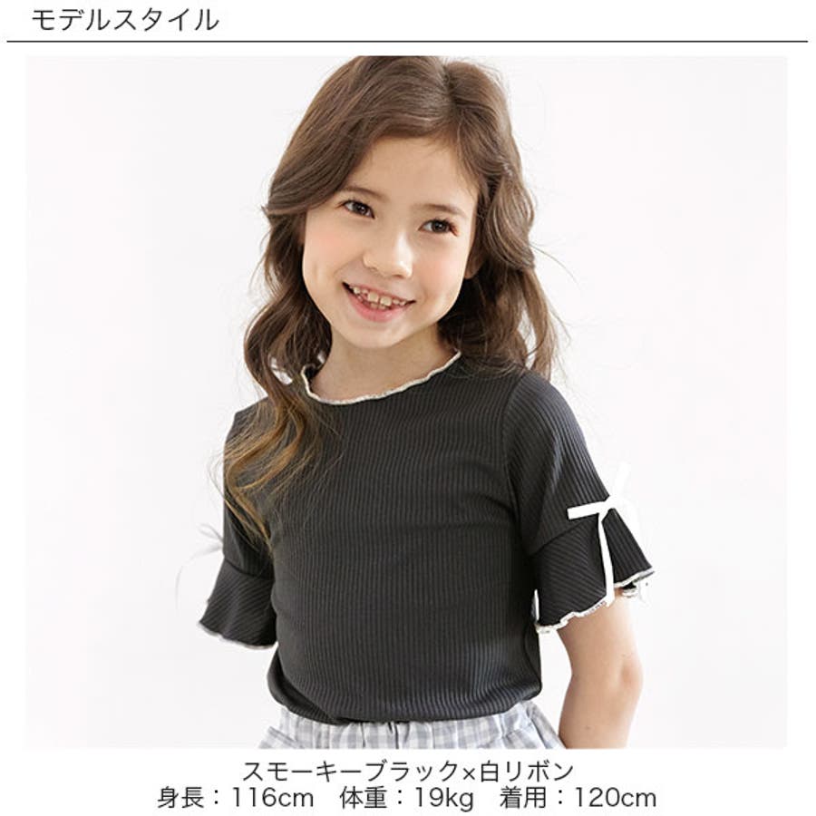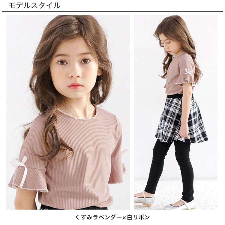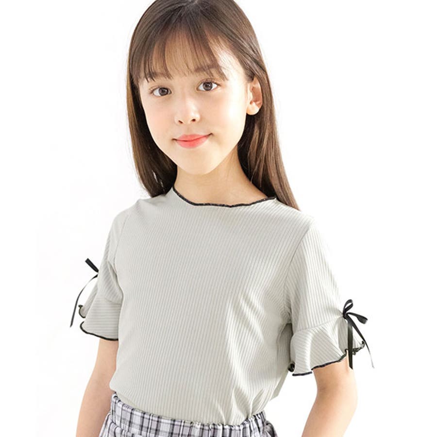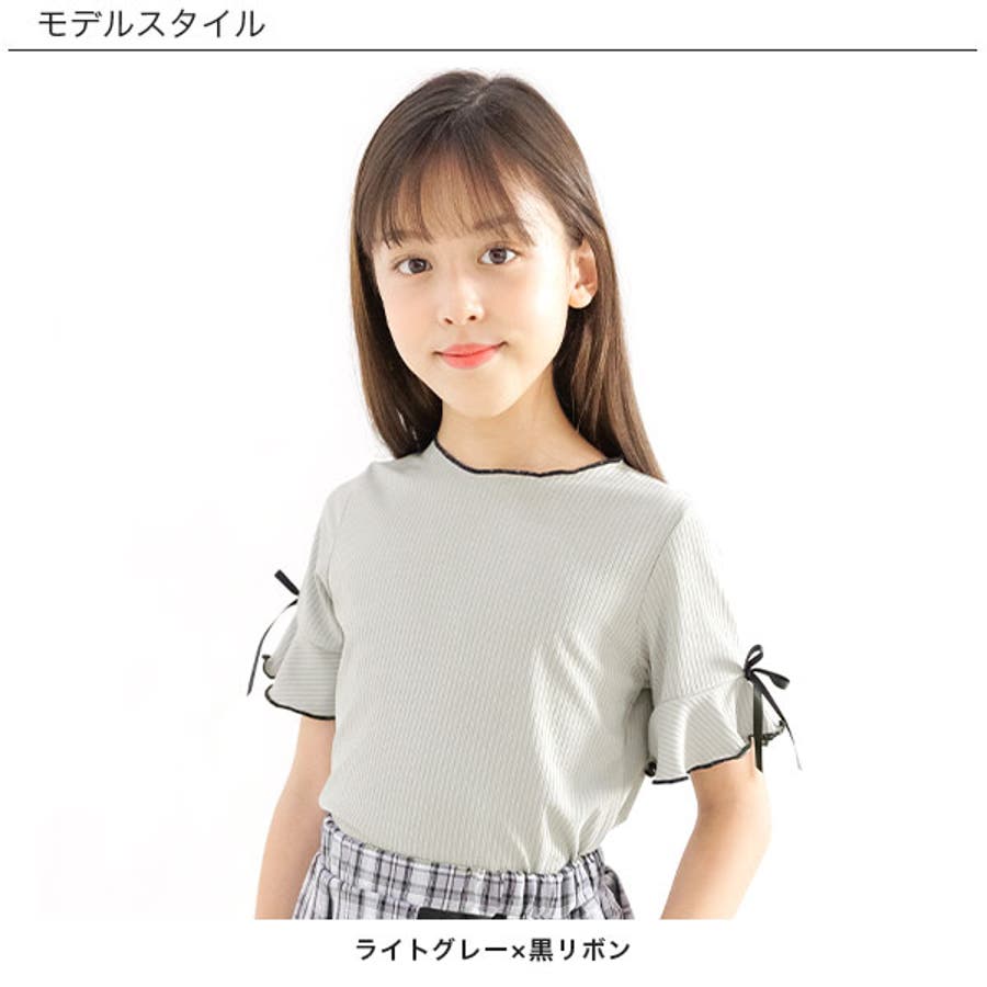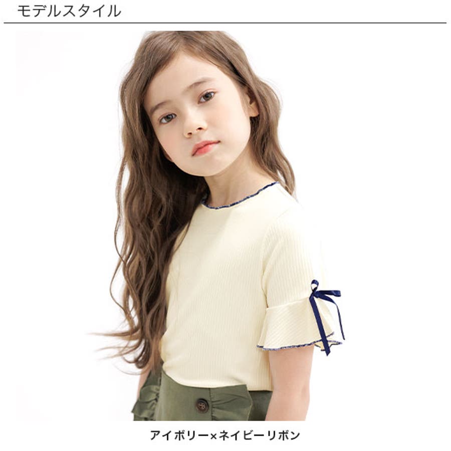 リブ地トップス フレア袖 リボン
