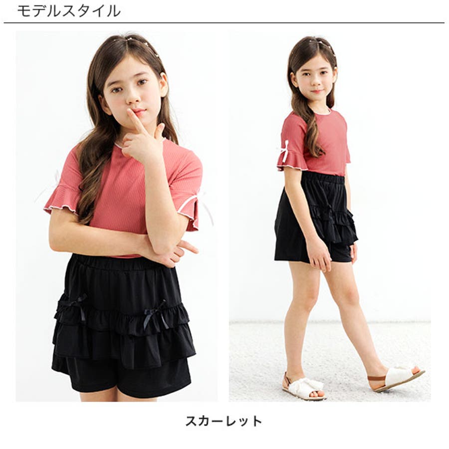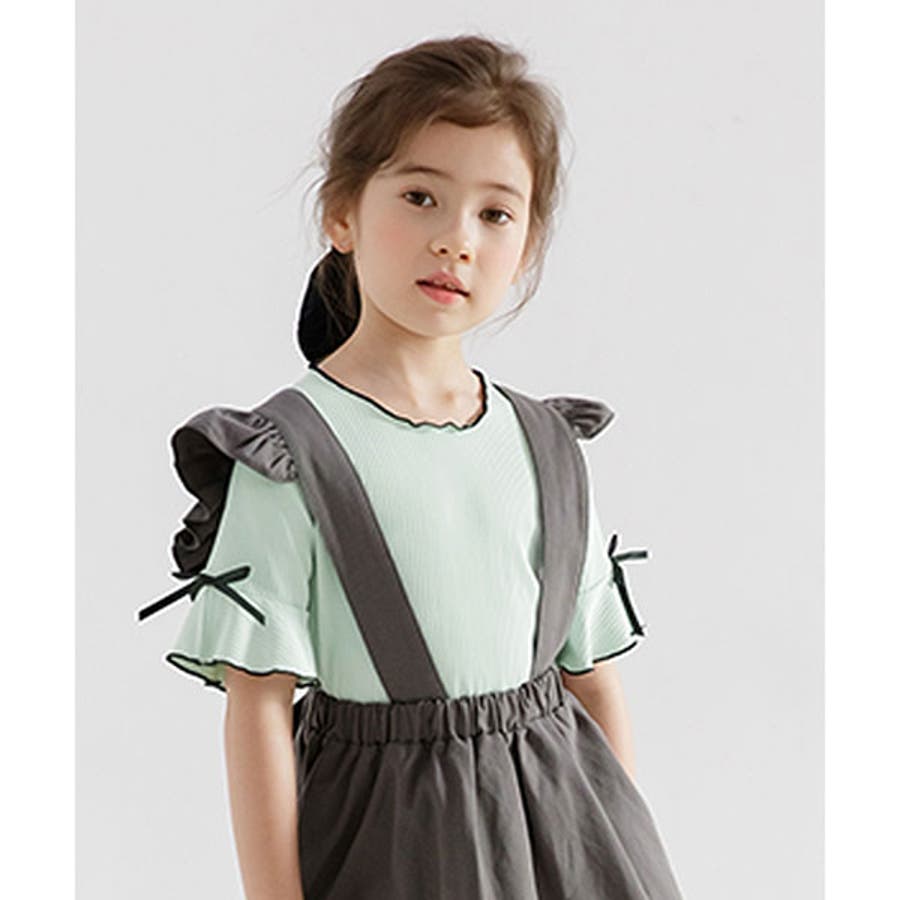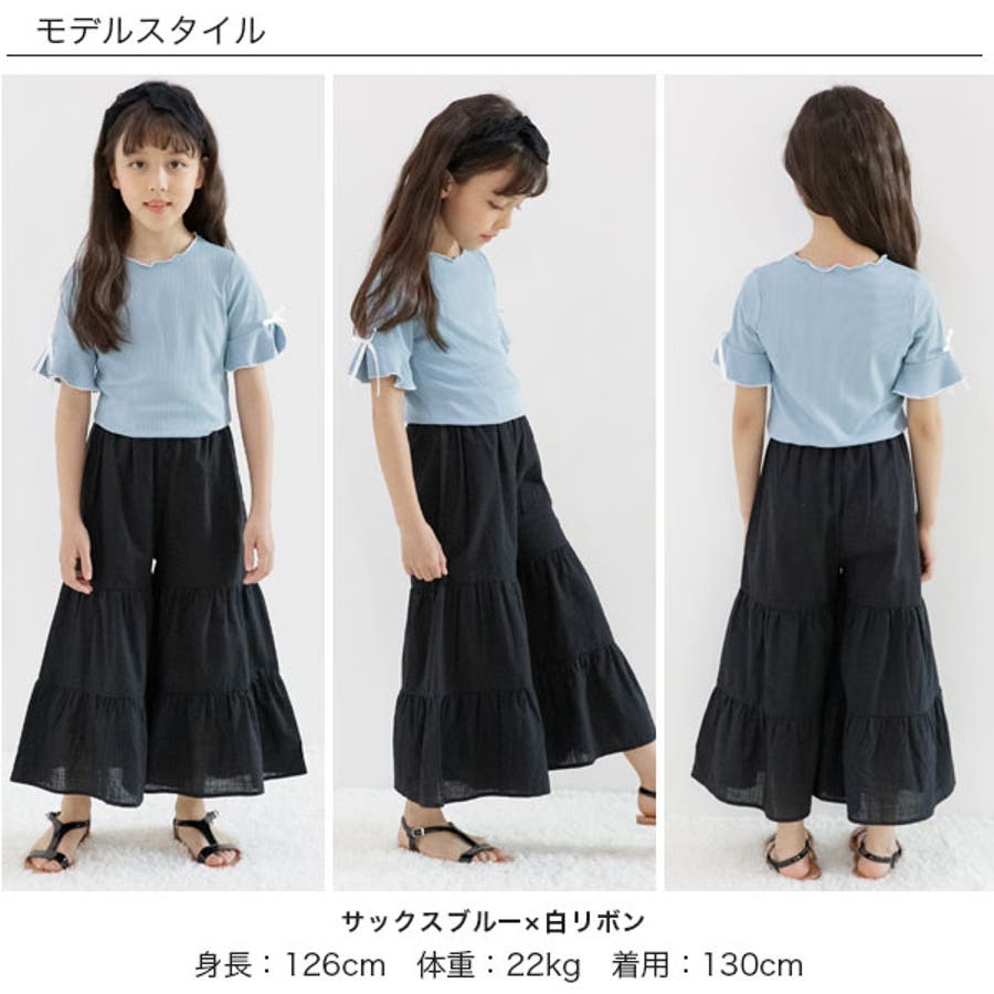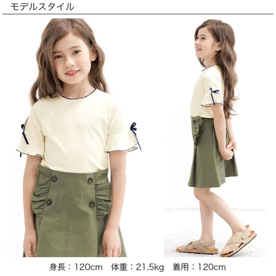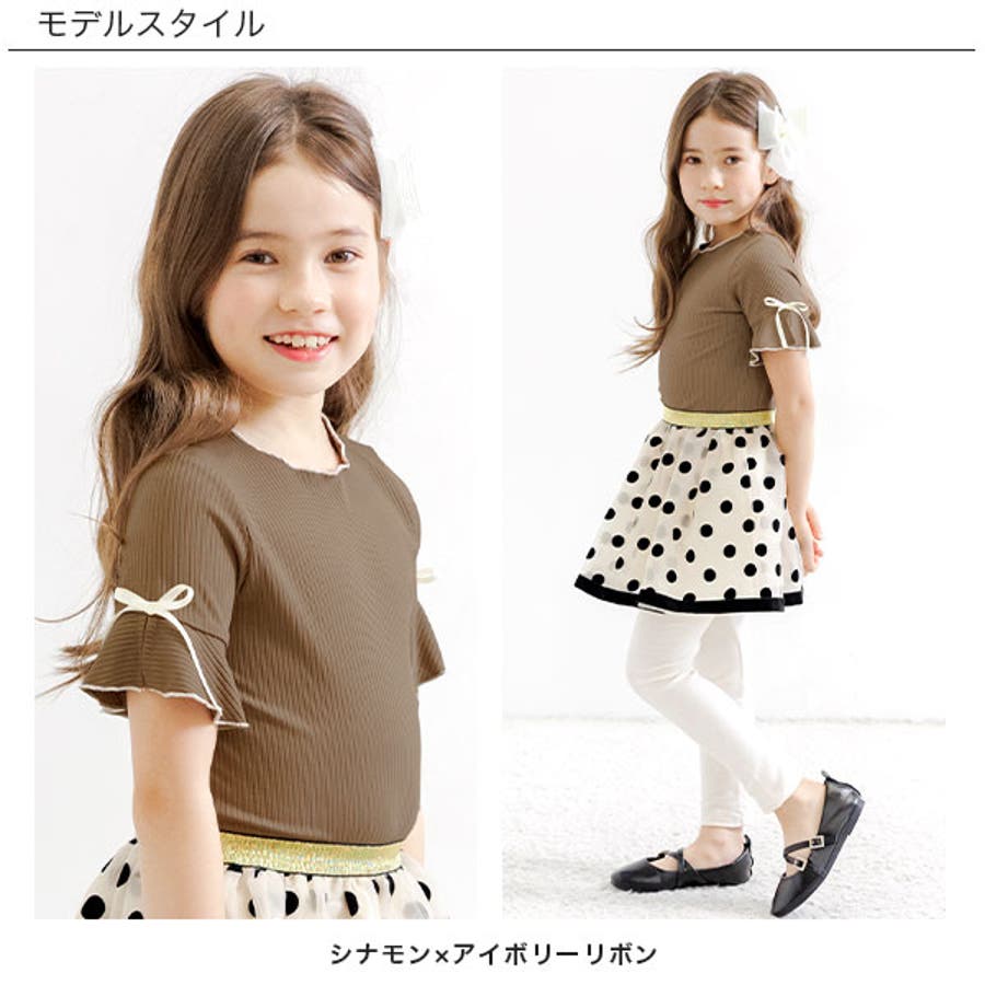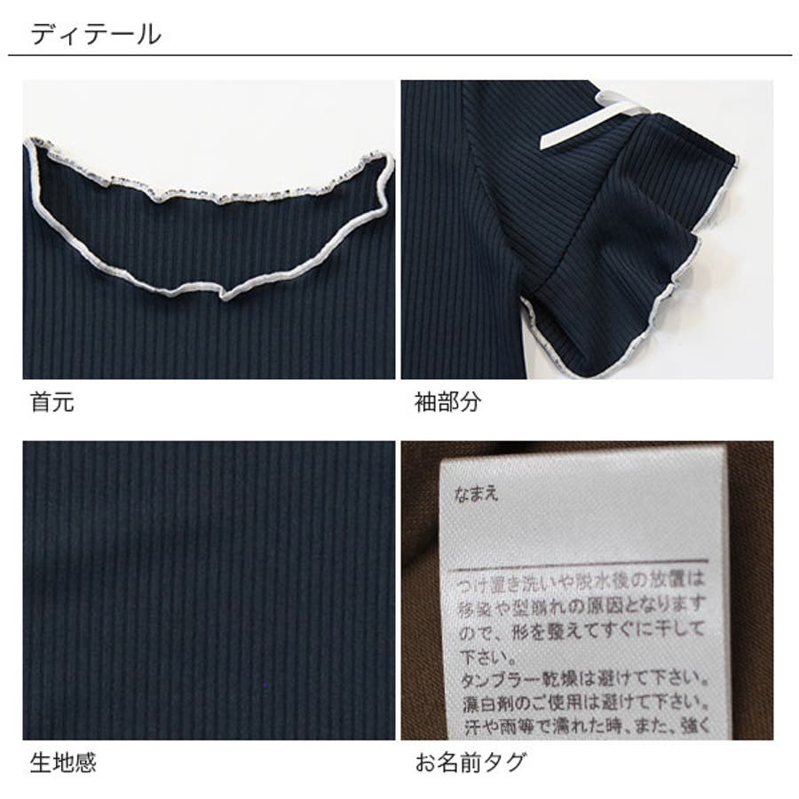 リブ地トップス フレア袖 リボン