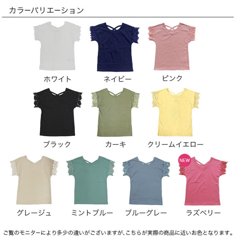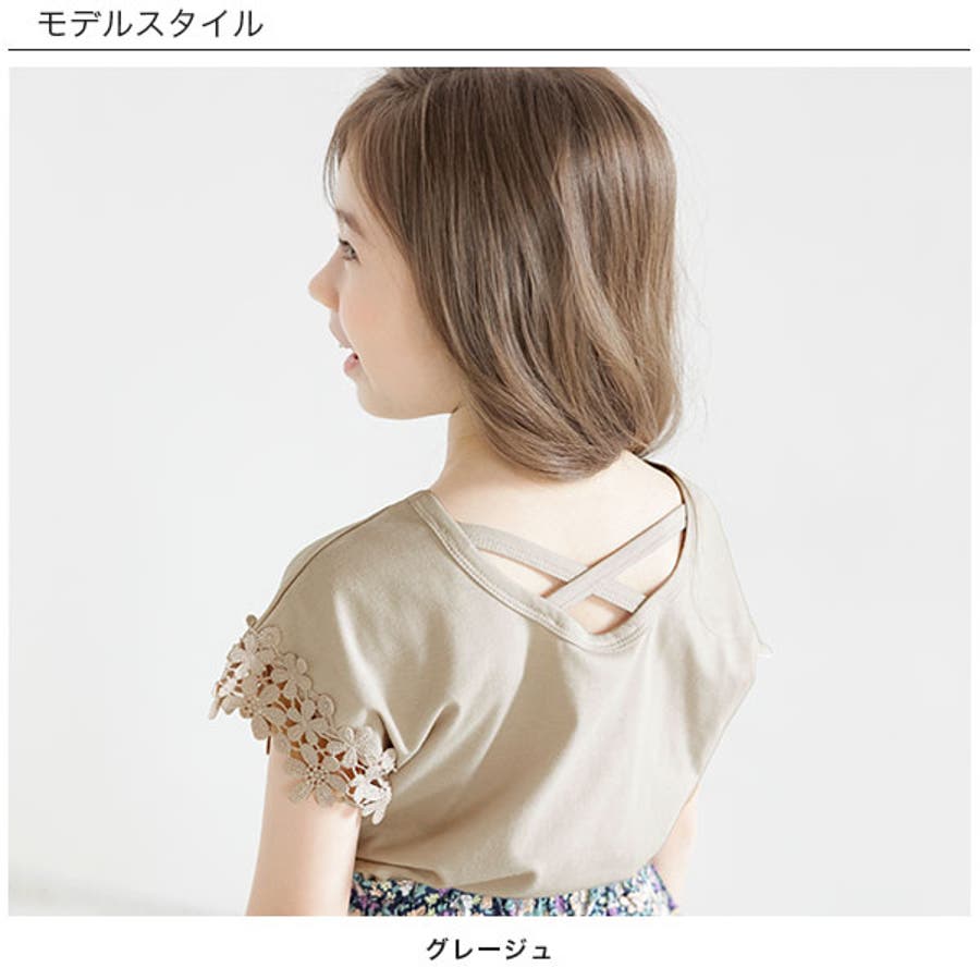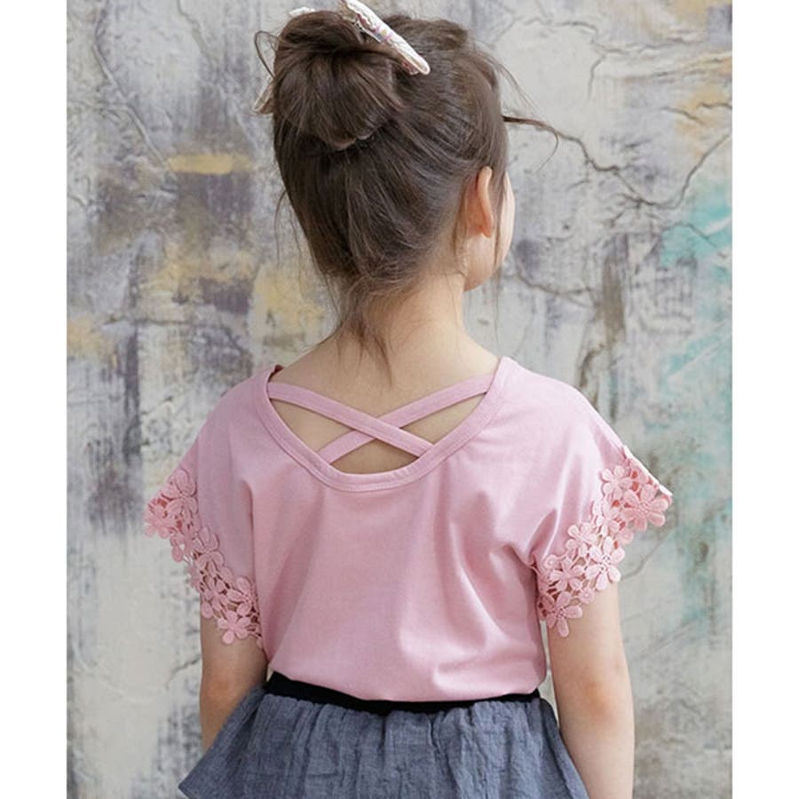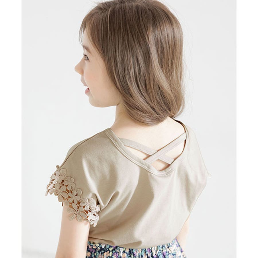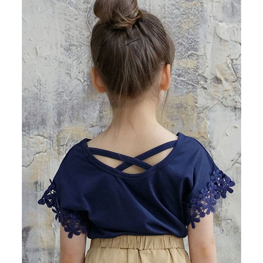 【21年夏新作】子供服 子ども服 こども服 キッズ 女の子 レース バッククロス シンプル 無地 夏 100 110 120 130 140 150◇半袖トップス◇