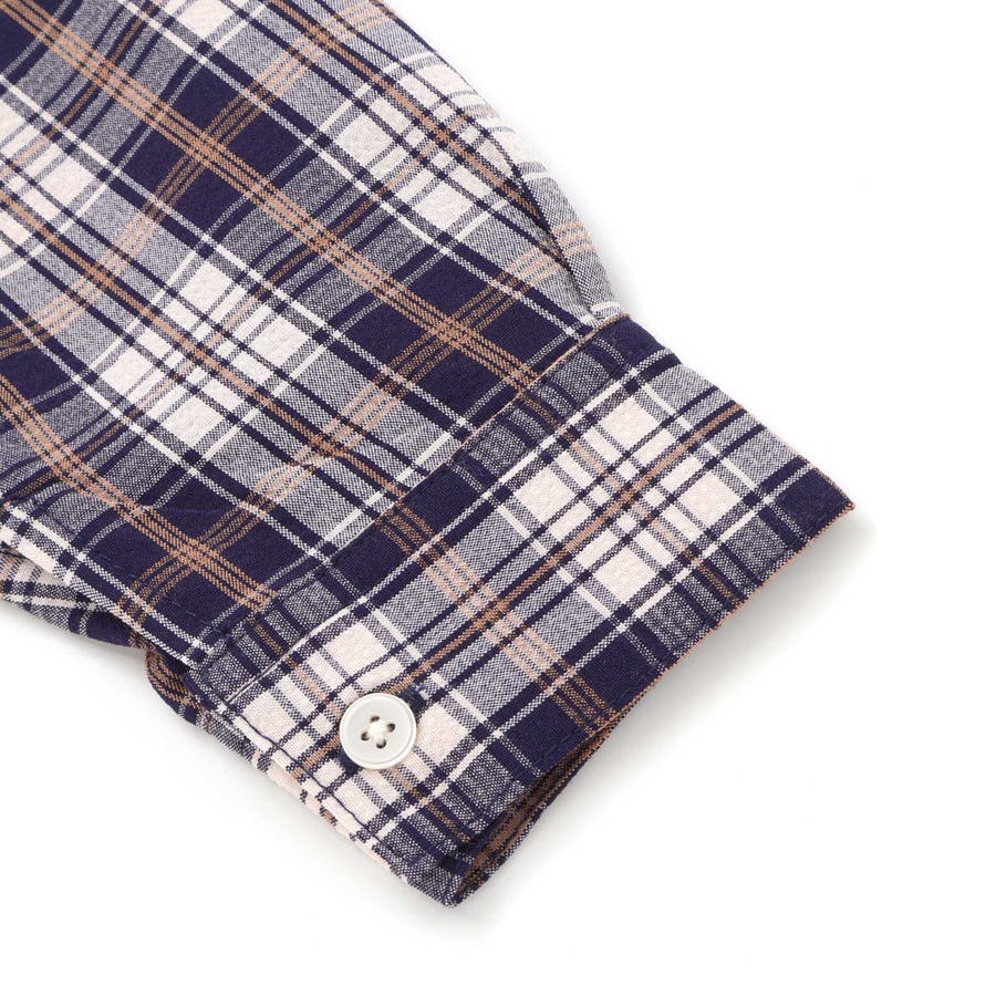 シャツは色や太さが異なるタータンチェックが目を惹きます。
