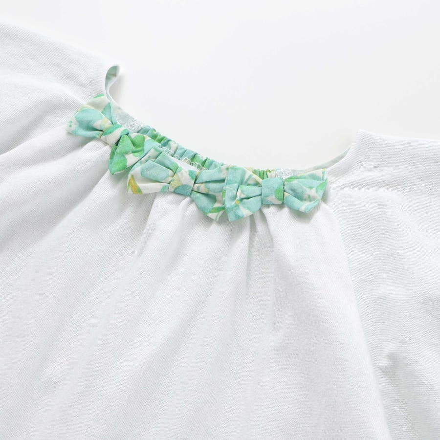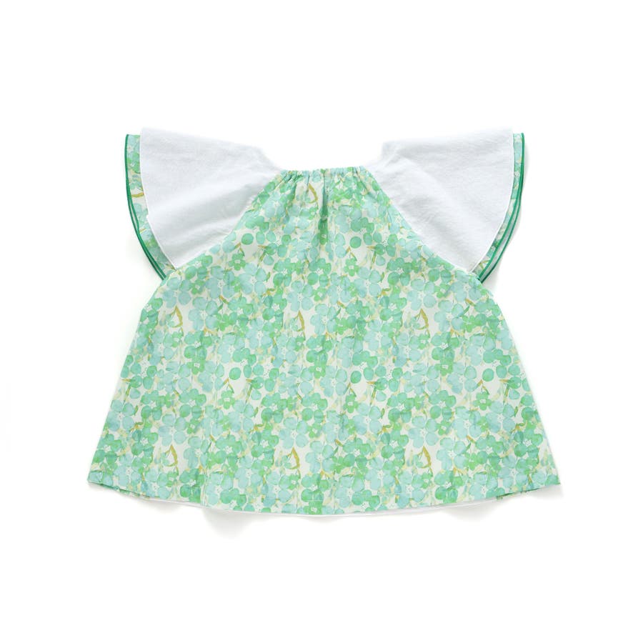 袖や後ろが花柄で鮮やかにさらに襟には花柄のリボンがついてコーデの主役になるアイテムです。