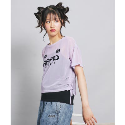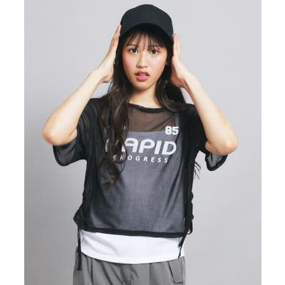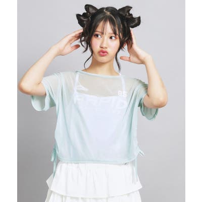 シアートップスは、サイドのヒモで長さを調節でき、ゲームシャツ風のプリントが今っぽい。