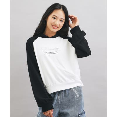 ラグランスリーブ×ラインストーンのデザインが今っぽいフーディ。