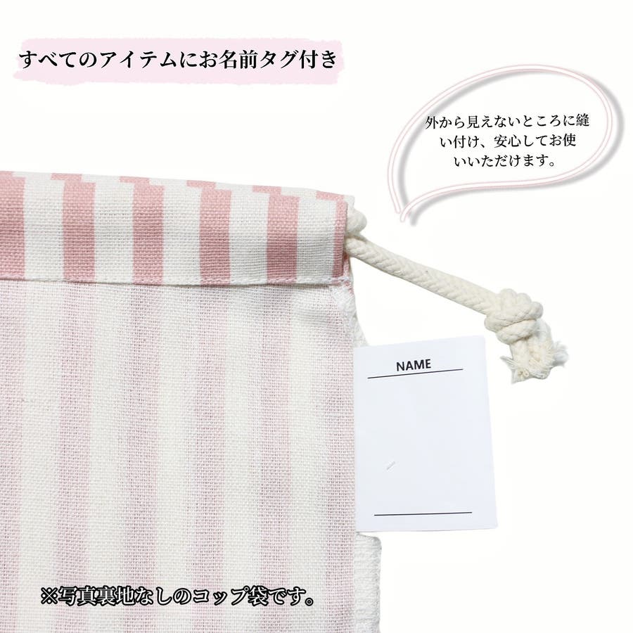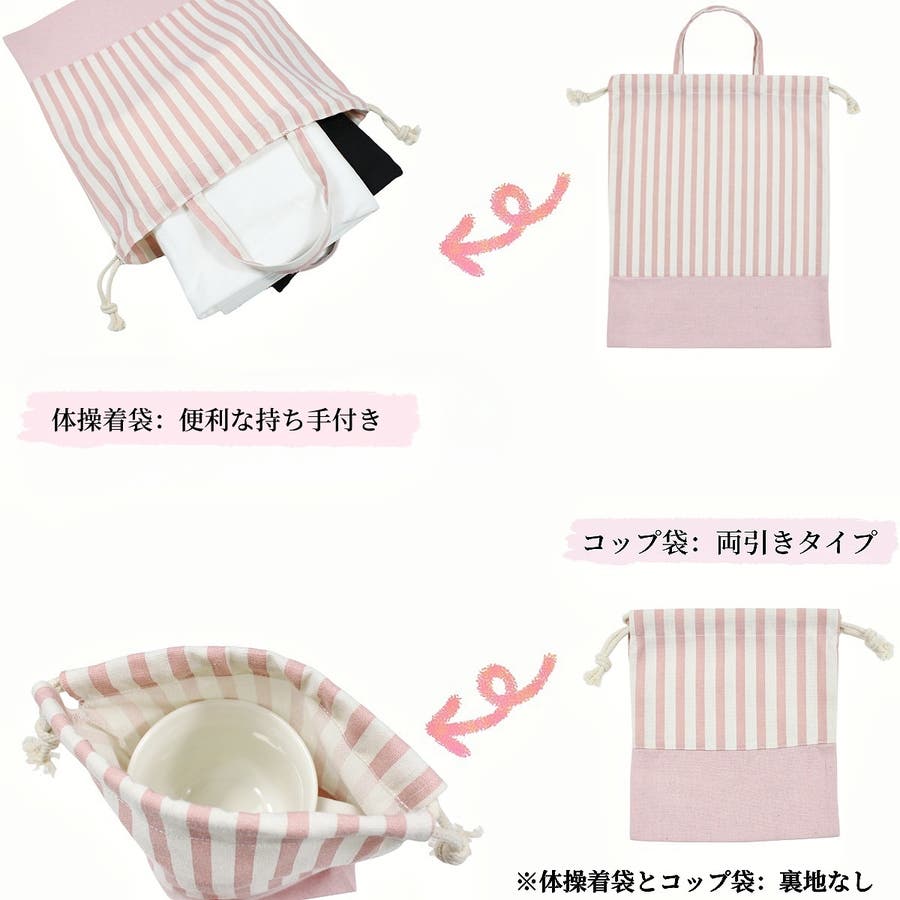 体操服やマグカップなどを入れられる、用途に合わせた大小の巾着袋。