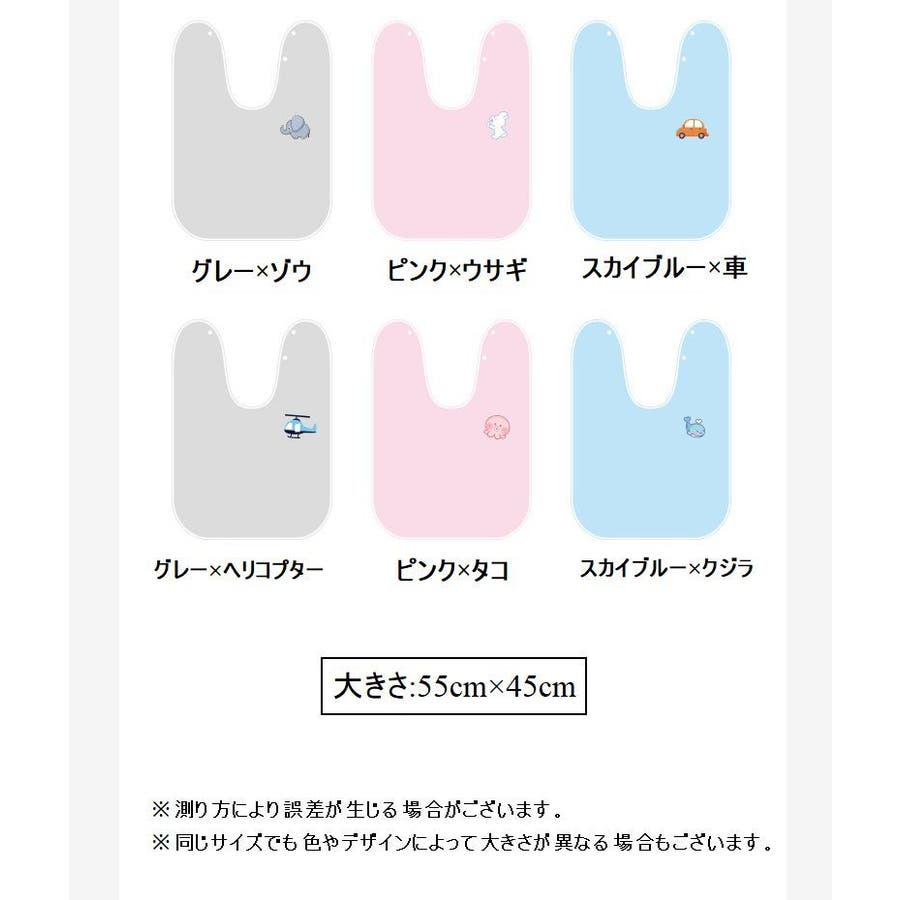 | カラー×デザイン | グレー×ヘリコプター / グレー×ゾウ / ピンク×タコ / ピンク×ウサギ / スカイブルー×車 / スカイブルー×クジラ |