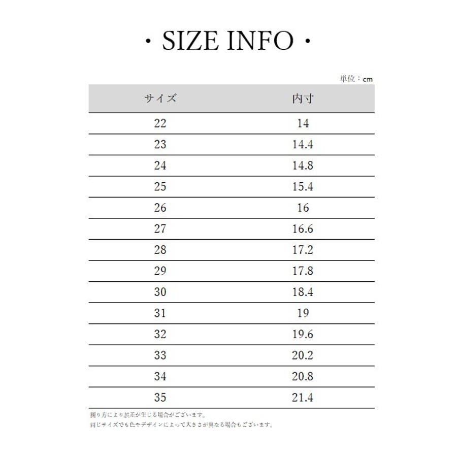 | サイズ | 22【14cm】 / 23【14.4cm】 / 24【14.8cm】 / 25【15.4cm】 / 26【16cm】 / 27【16.6cm】 / 28【17.2cm】 / 29【17.8cm】 / 30【18.4cm】 / 31【19cm】 / 32【19.6cm】 / 33【20.2cm】 / 34【20.8cm】 / 35【21.4cm】 |