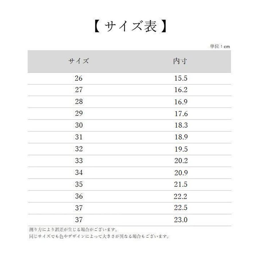 | サイズ | 27【内寸16.2cm】 / 28【内寸16.9cm】 / 29【内寸17.6cm】 / 30【内寸18.3cm】 / 31【内寸18.9cm】 / 32【内寸19.5cm】 / 33【内寸20.2cm】 / 34【内寸20.9cm】 / 35【内寸21.5cm】 / 36【内寸22.2cm】 / 37【内寸22.5cm】 / 26【内寸15.5cm】 / 38【内寸23.0cm】 |