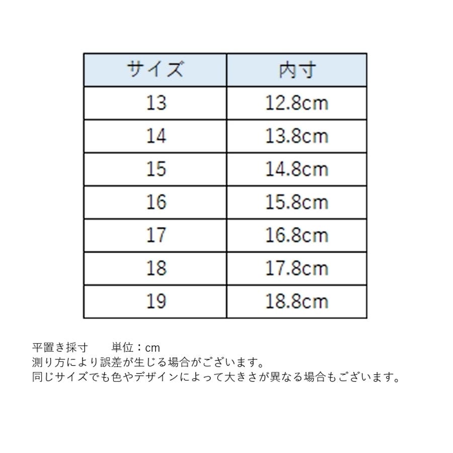 | サイズ | 13【内寸12.8cm】 / 14【内寸13.8cm】 / 15【内寸14.8cm】 / 16【内寸15.8cm】 / 17【内寸16.8cm】 / 18【内寸17.8cm】 / 19【内寸18.8cm】 |