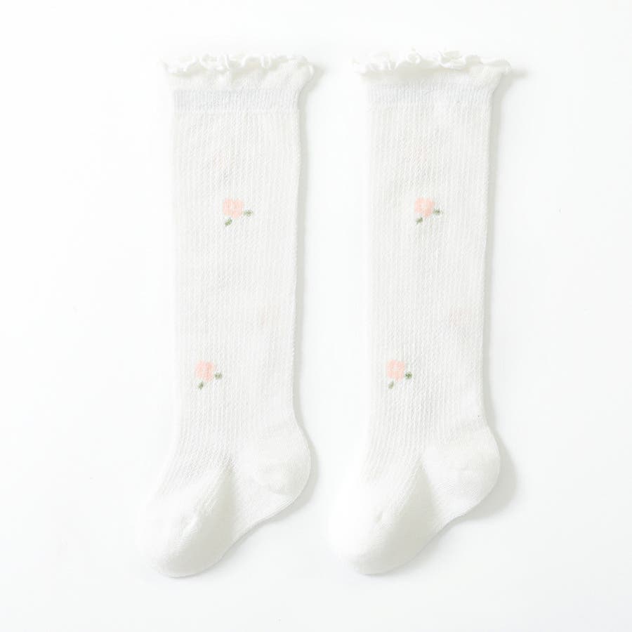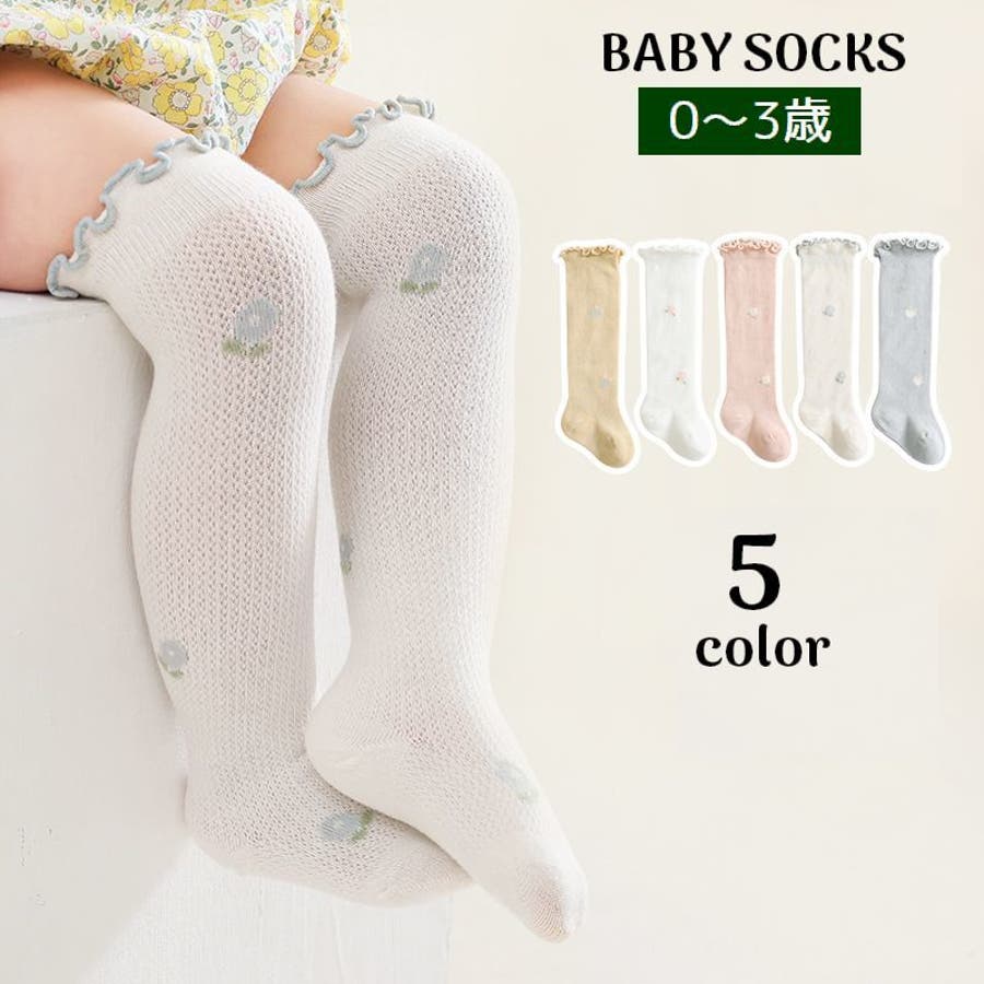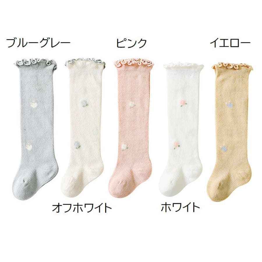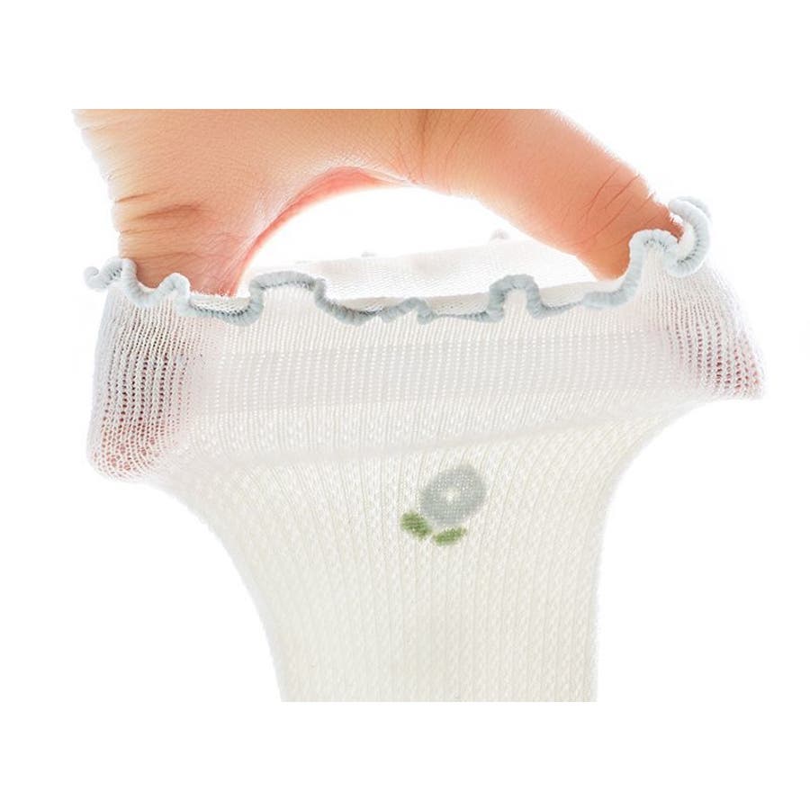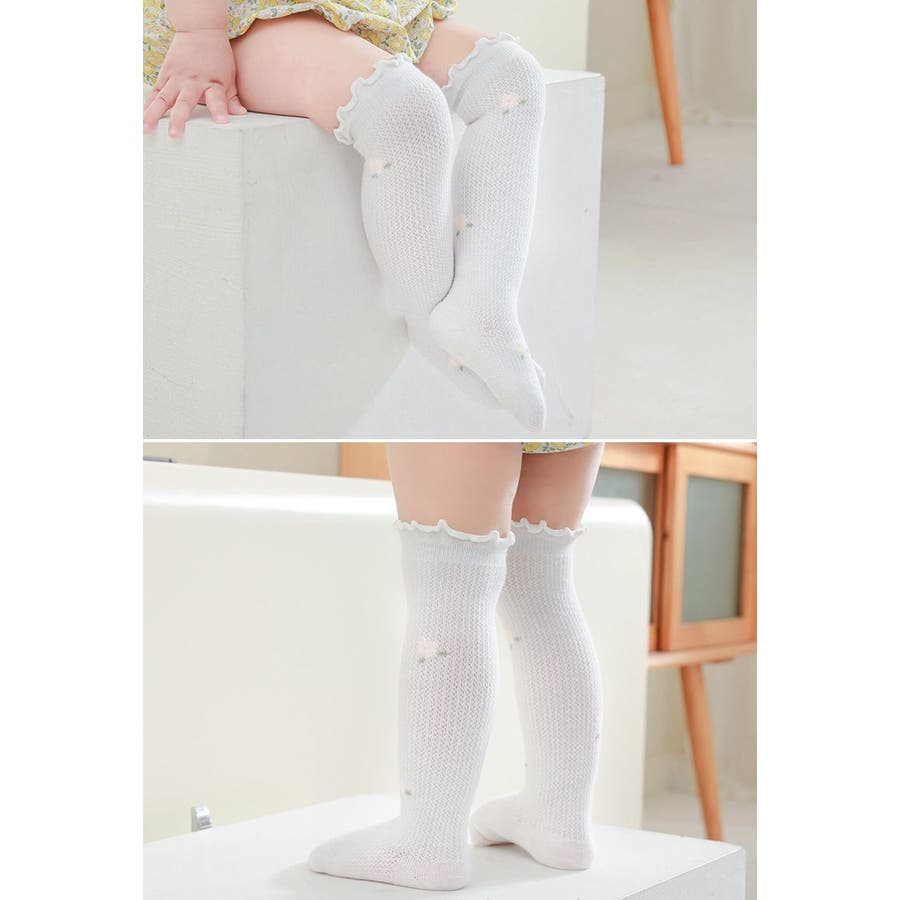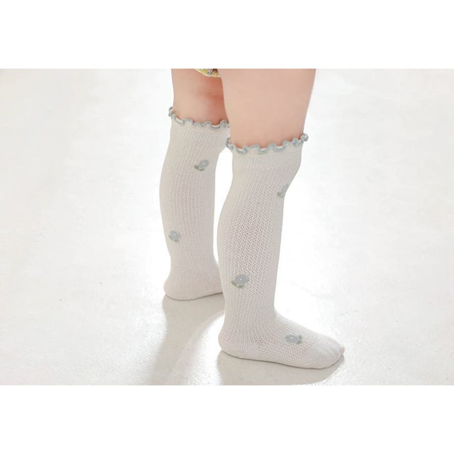 履き口部分のフリルや小さな花柄が可愛らしい、ベビー用二―ハイソックスです。
