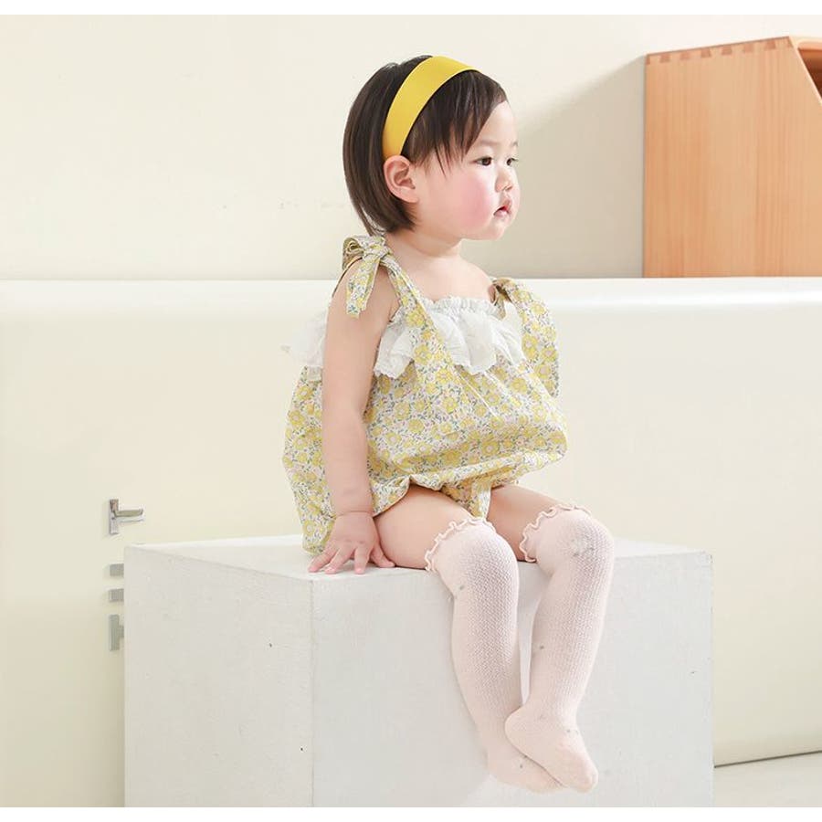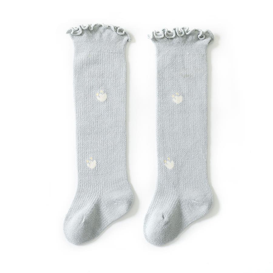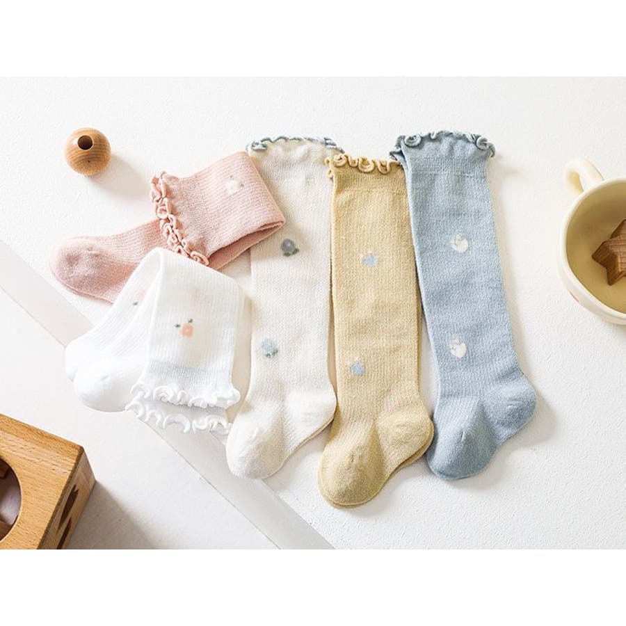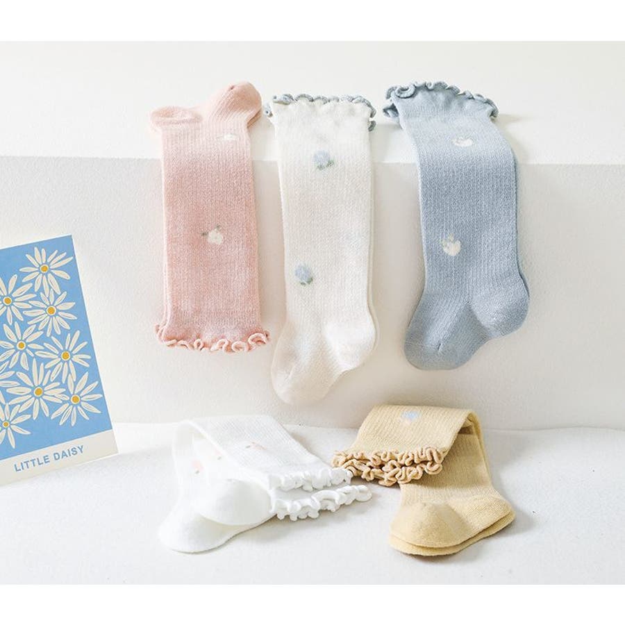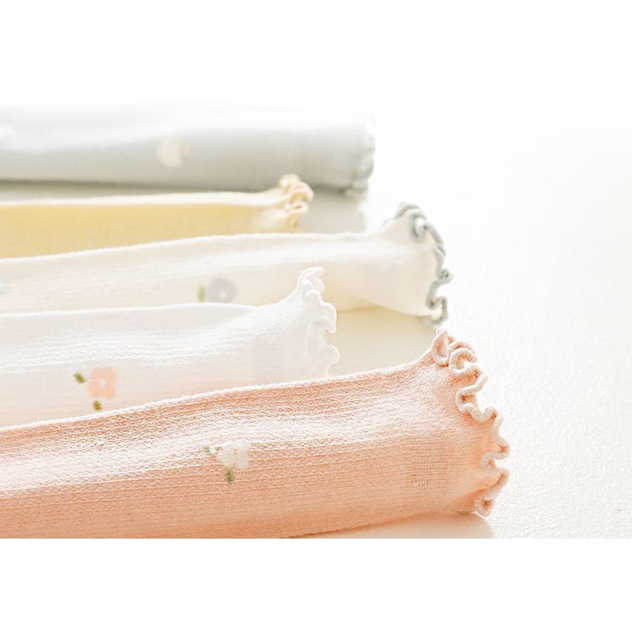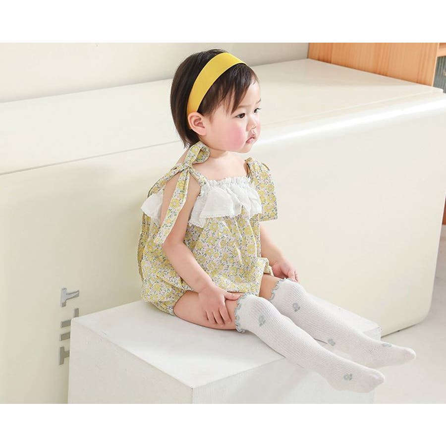 履き口部分のフリルや小さな花柄が可愛らしい、ベビー用二―ハイソックスです。