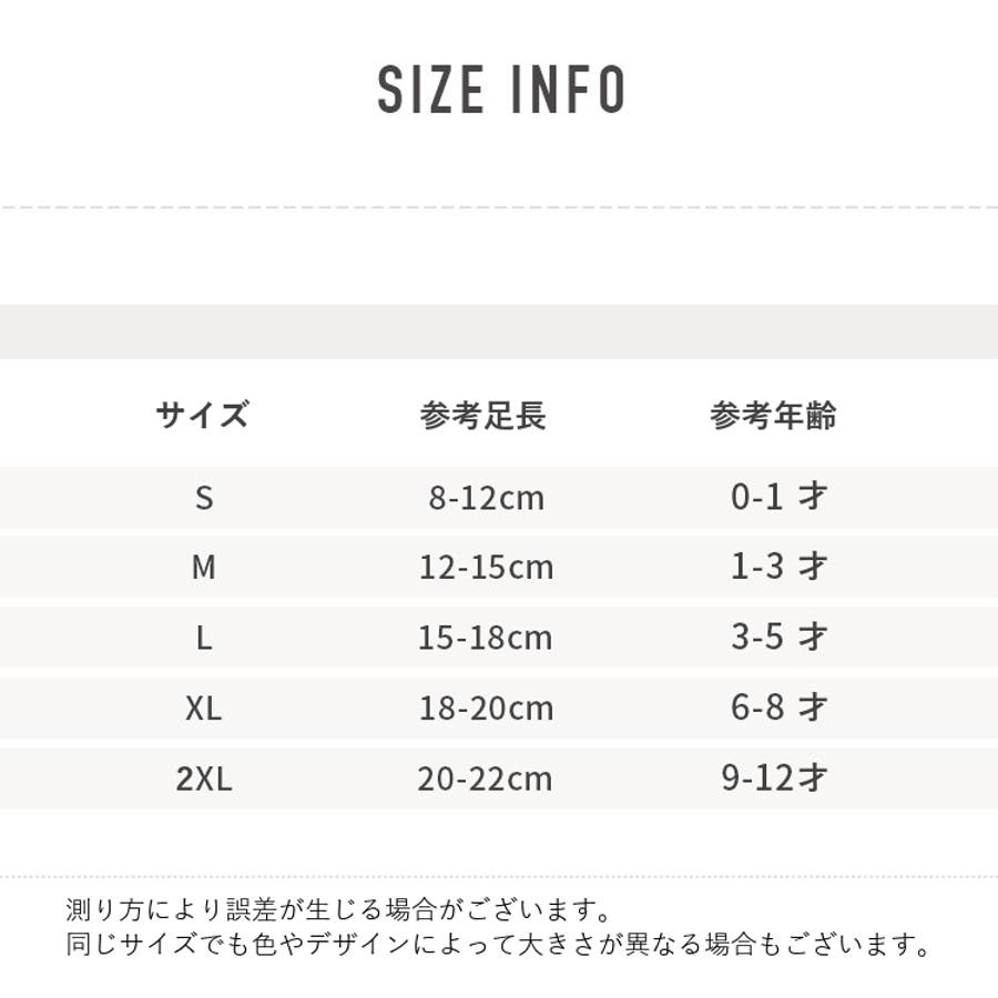 | サイズ | 2XL【20.0~22.0cm】 / L【15.0~18.0cm】 / M【12.0~15.0cm】 / S【8.0~12.0cm】 / XL【18.0~20.0cm】 |