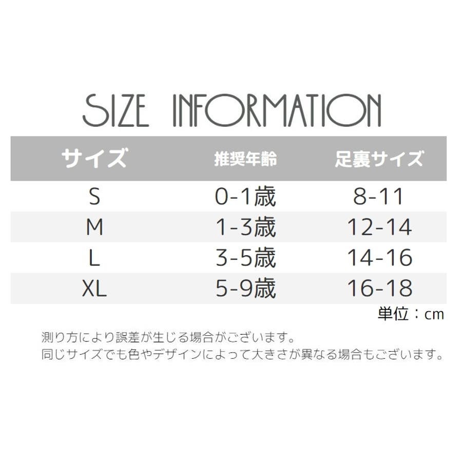 | サイズ | L3~5歳【14~16cm】 / M1~3歳【12~14cm】 / S0~1歳【9~11cm】 / XL5~9歳【16~18cm】 |