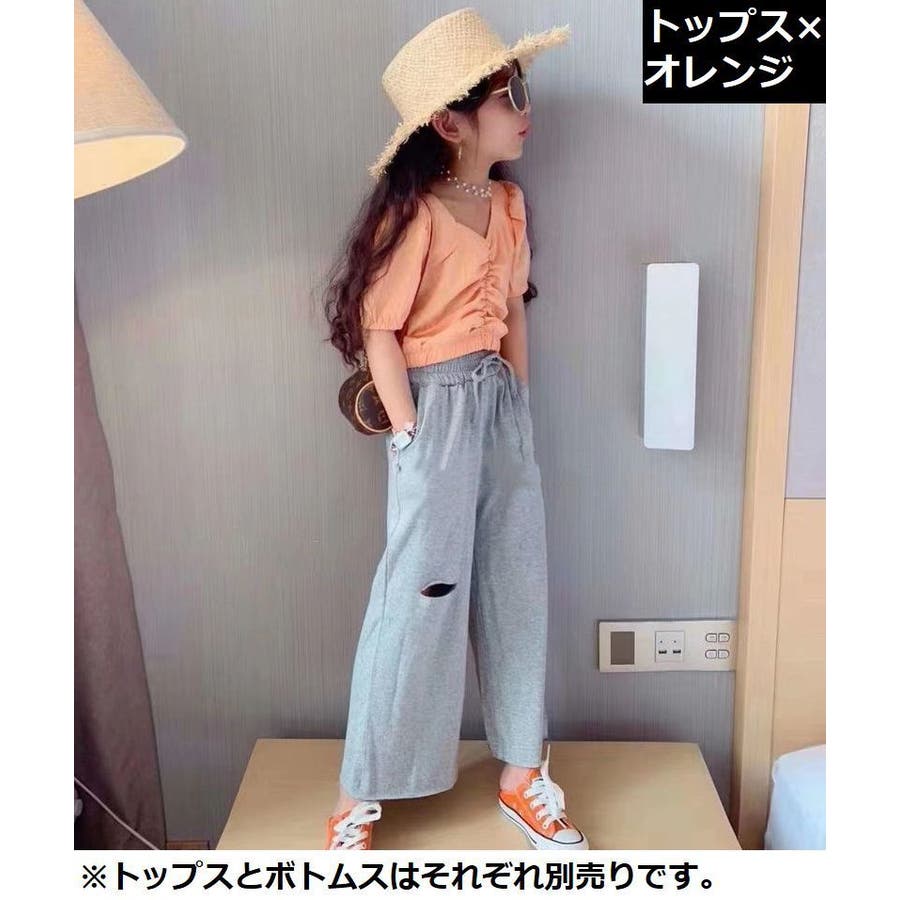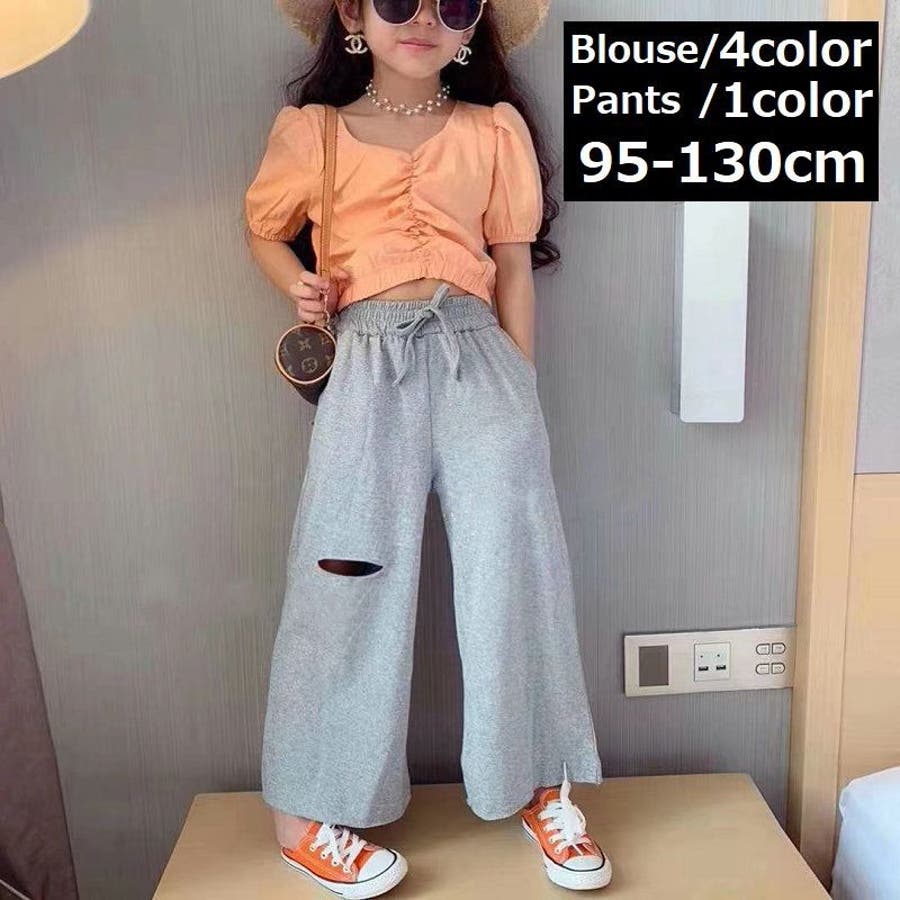 子供用の半袖ブラウス/ダメージ加工ワイドパンツです。