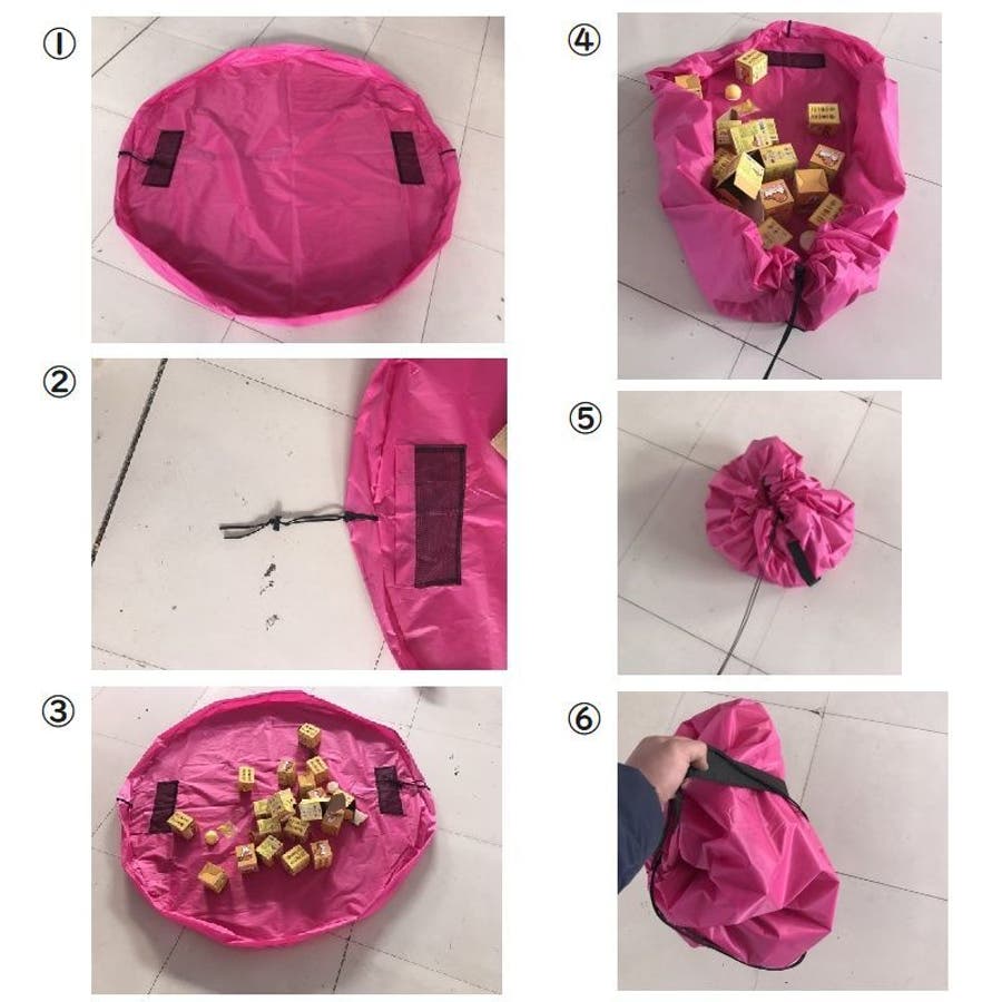 広げるとマット状になりますので、その上でおもちゃを広げて遊び、終わったら紐を引っ張ることで簡単に袋状になり収納ができて便利です♪