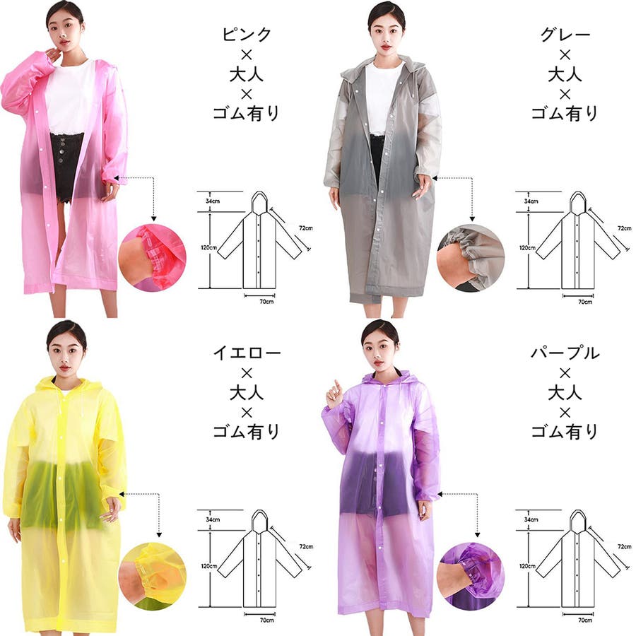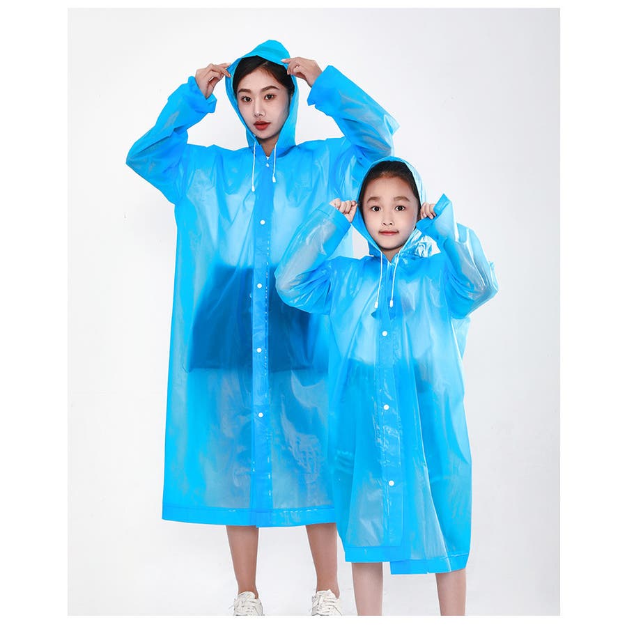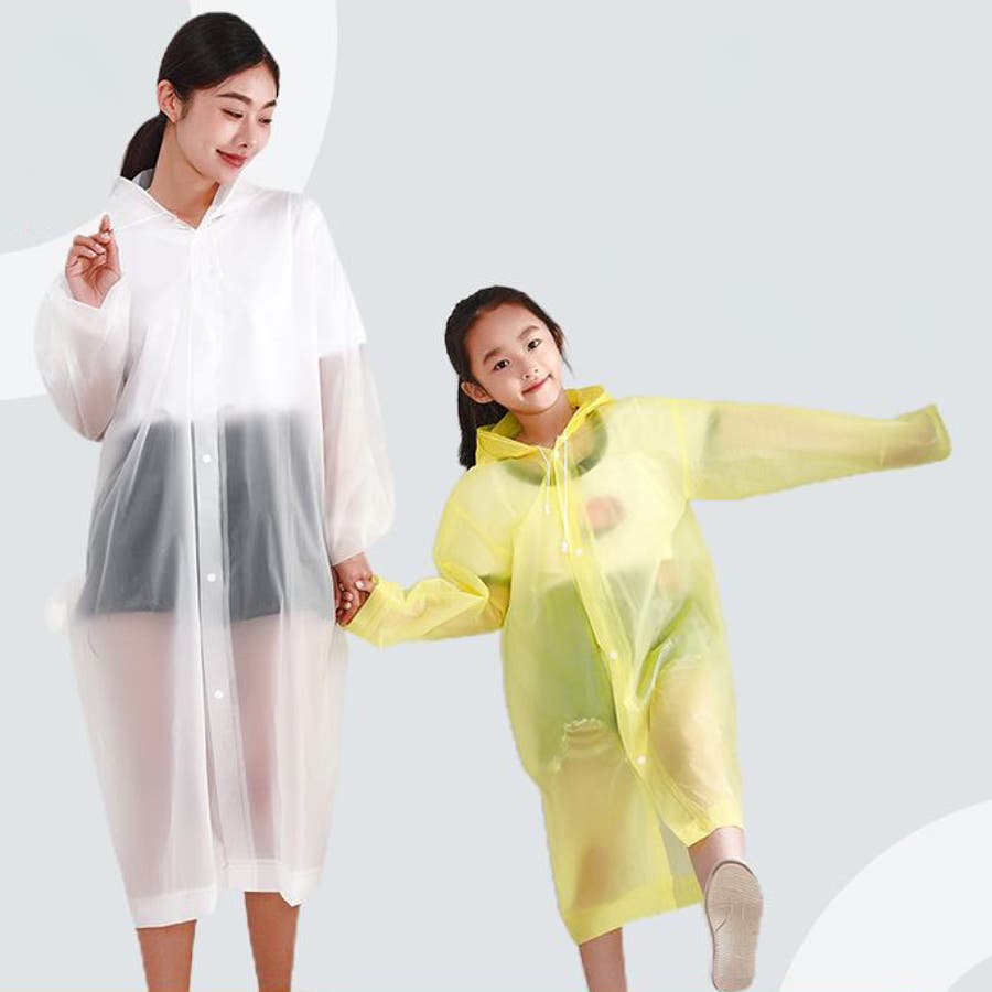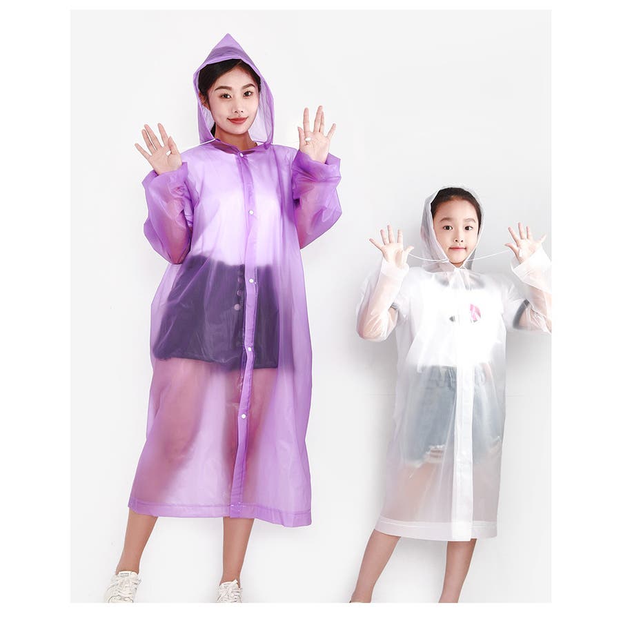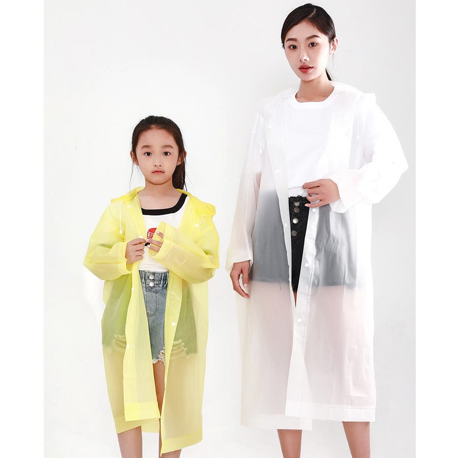 子供から大人まで幅広いサイズを取り揃えた、半透明のシンプルなレインコートです。