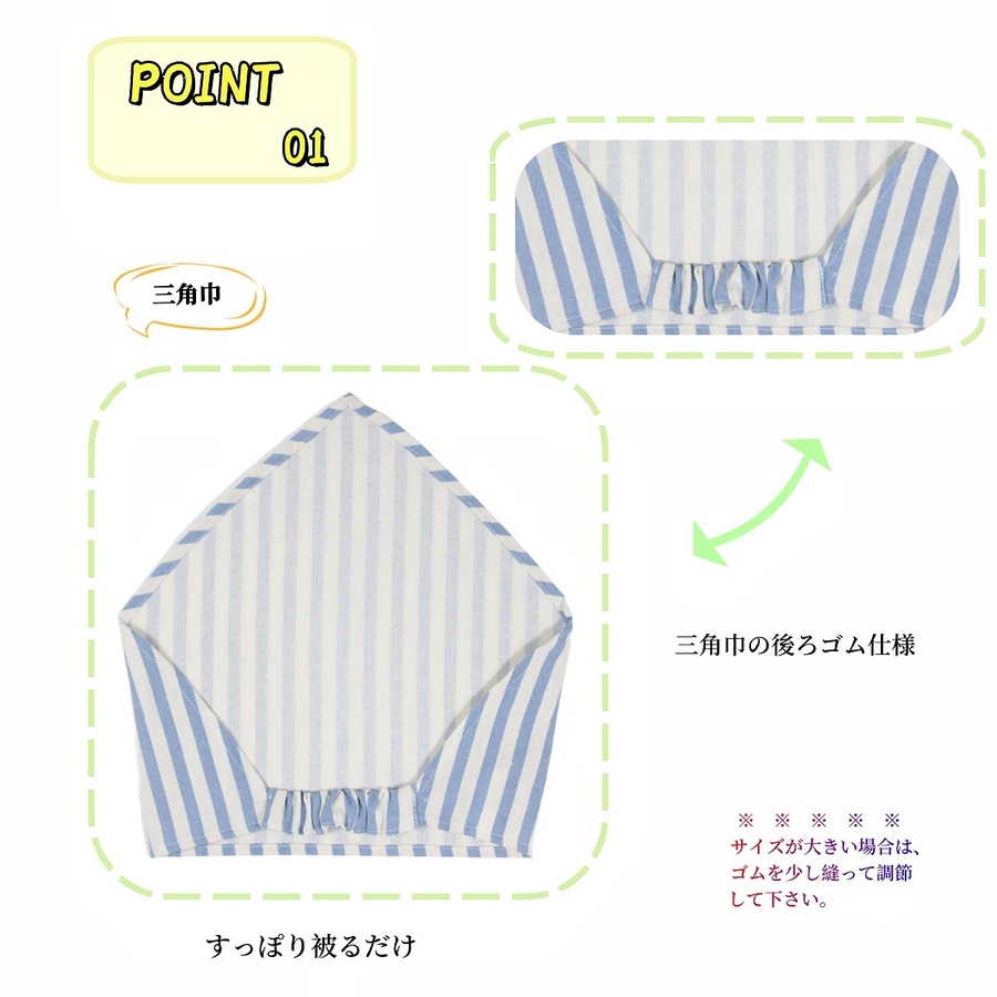 被るだけで簡単に着用できる三角巾&持ち運びに便利な巾着袋つきの3点セットです。